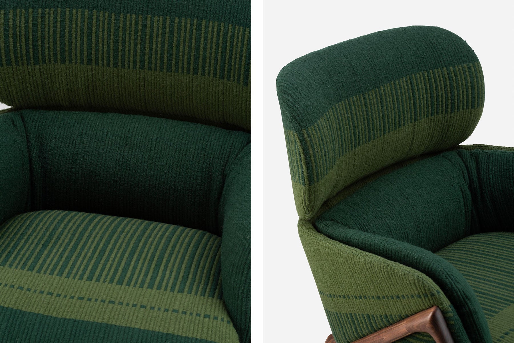 Available in black walnut, white oak, or ash in a range of finishes. Upholstered in Manta Lido, a hand woven traditional blanket from the Alentejo region of Portugal. See menus below for further material information.