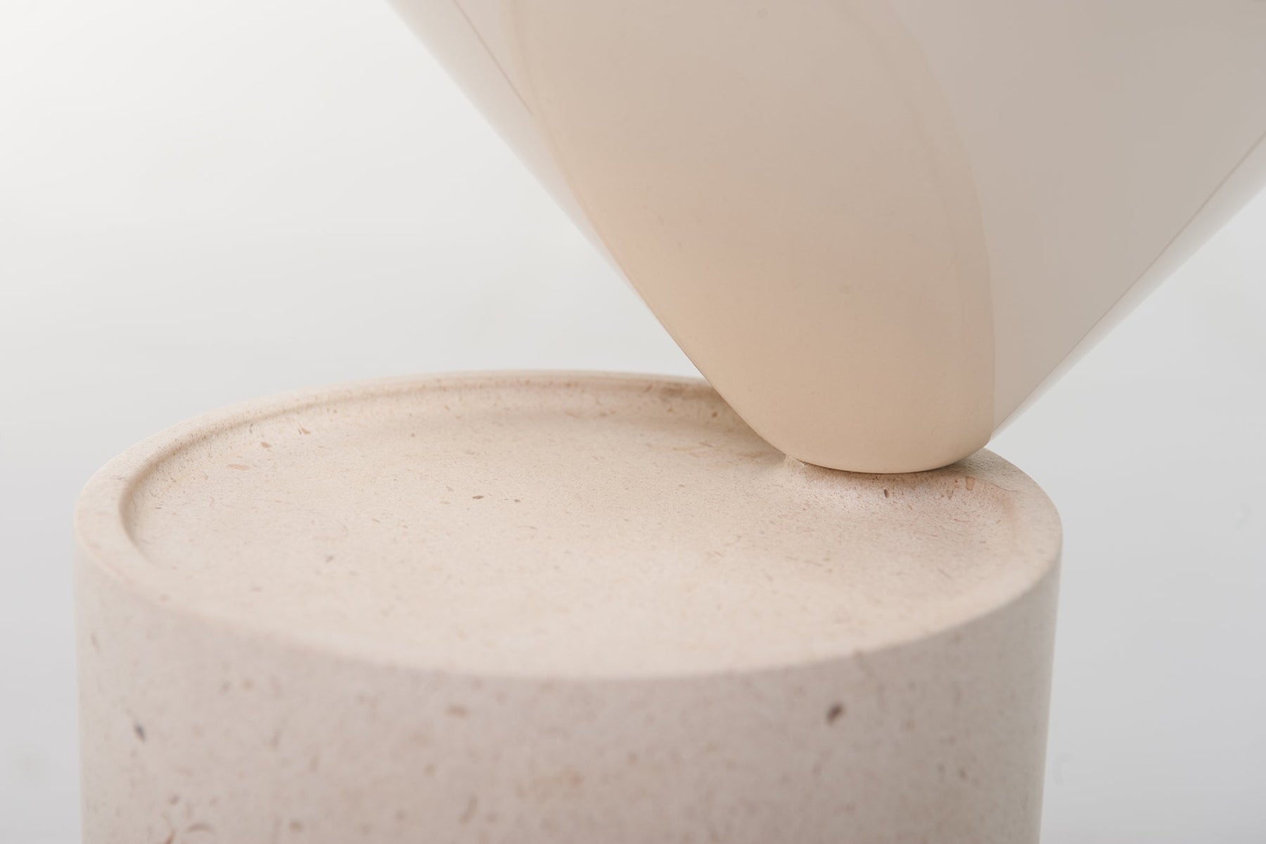 Laurel is a side table composed of two intersecting geometric shapes, cone and cylinder. The painted HDF cone appears to balance weightlessly upon the cylindrical base of marble. This small side table has a sculptural form that complements any space. Laurel is also available with a timber base, or as a coffee table with a timber or marble base.