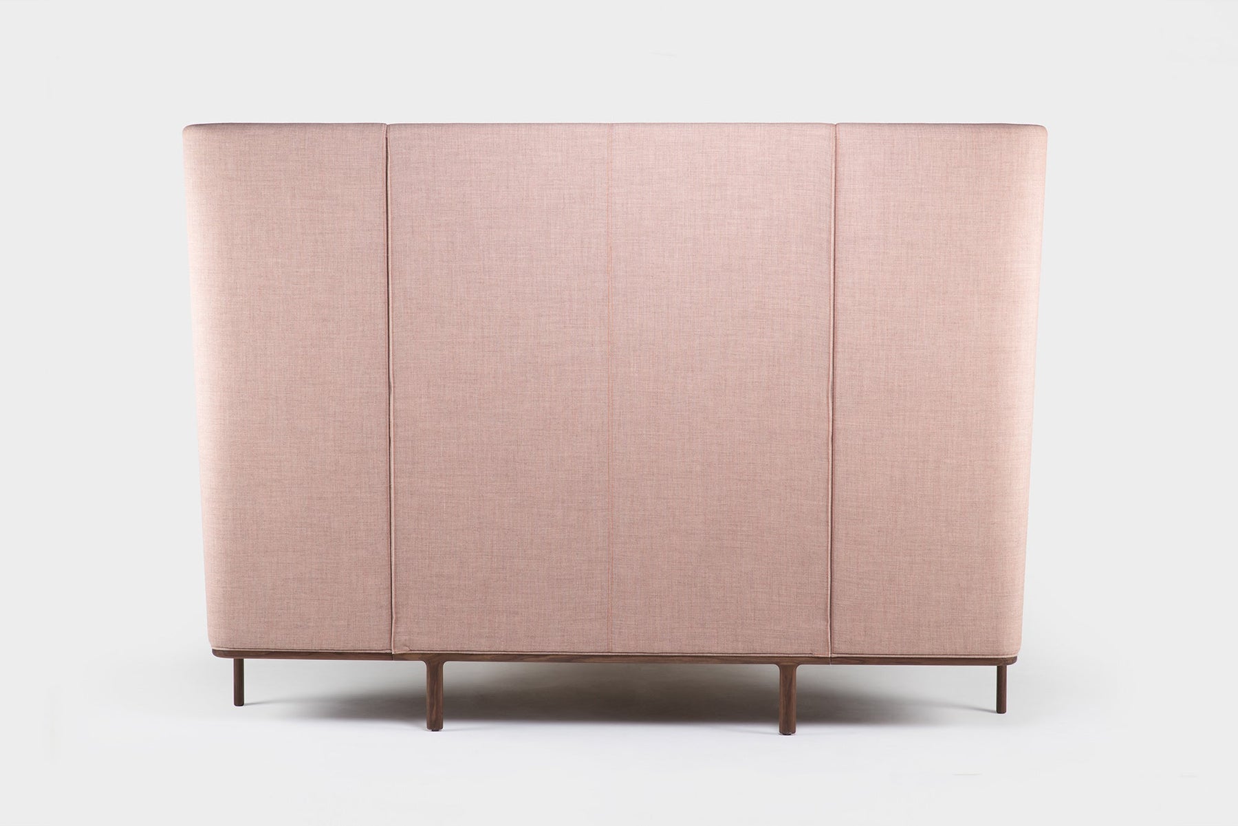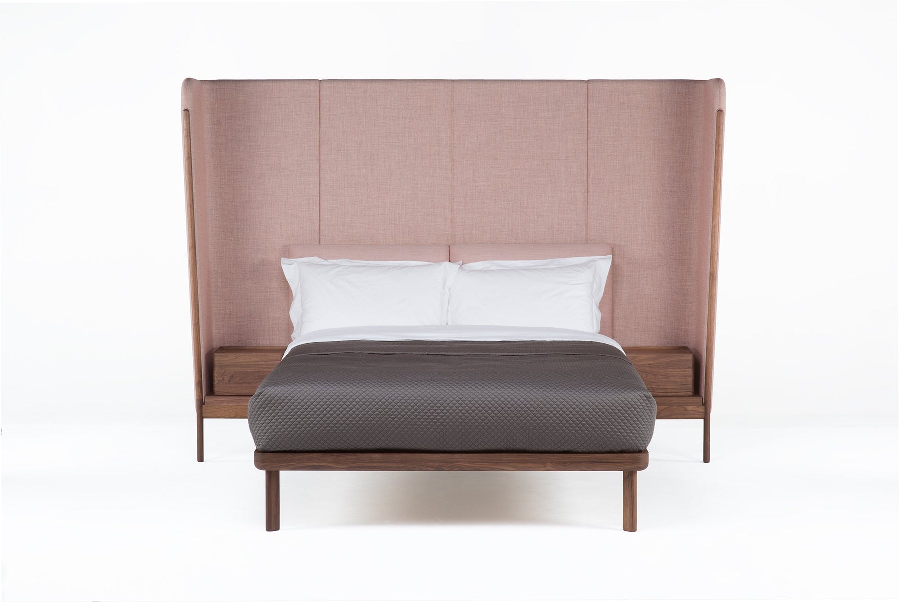 Dubois is a bed system crafted in premium solid hardwood and luxurious fabrics. The wraparound headboard provides a sense of privacy, while the exposed timber frame and generous expanse of upholstery celebrates the quality of materials and craft. Suitable for residential or contract environments, the bed is available with a low or tall headboard, with or without integrated bedside tables.