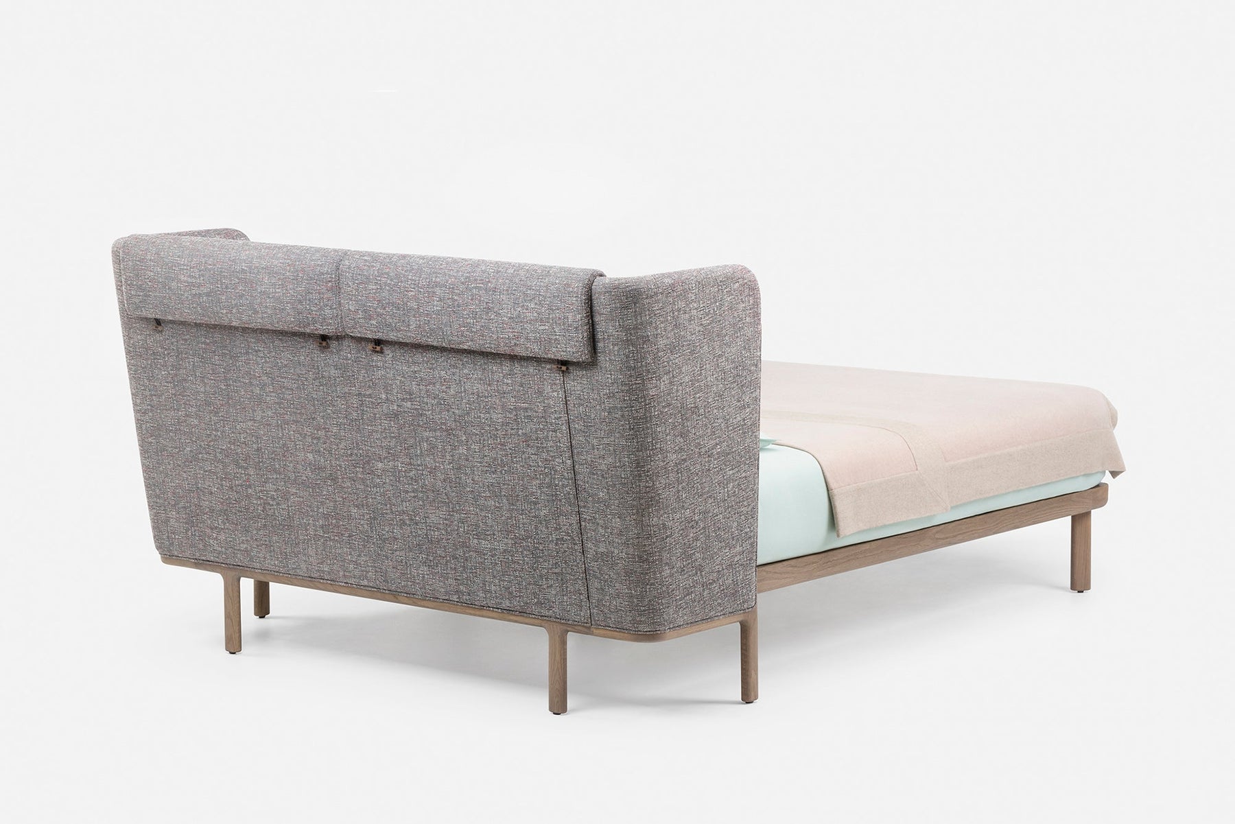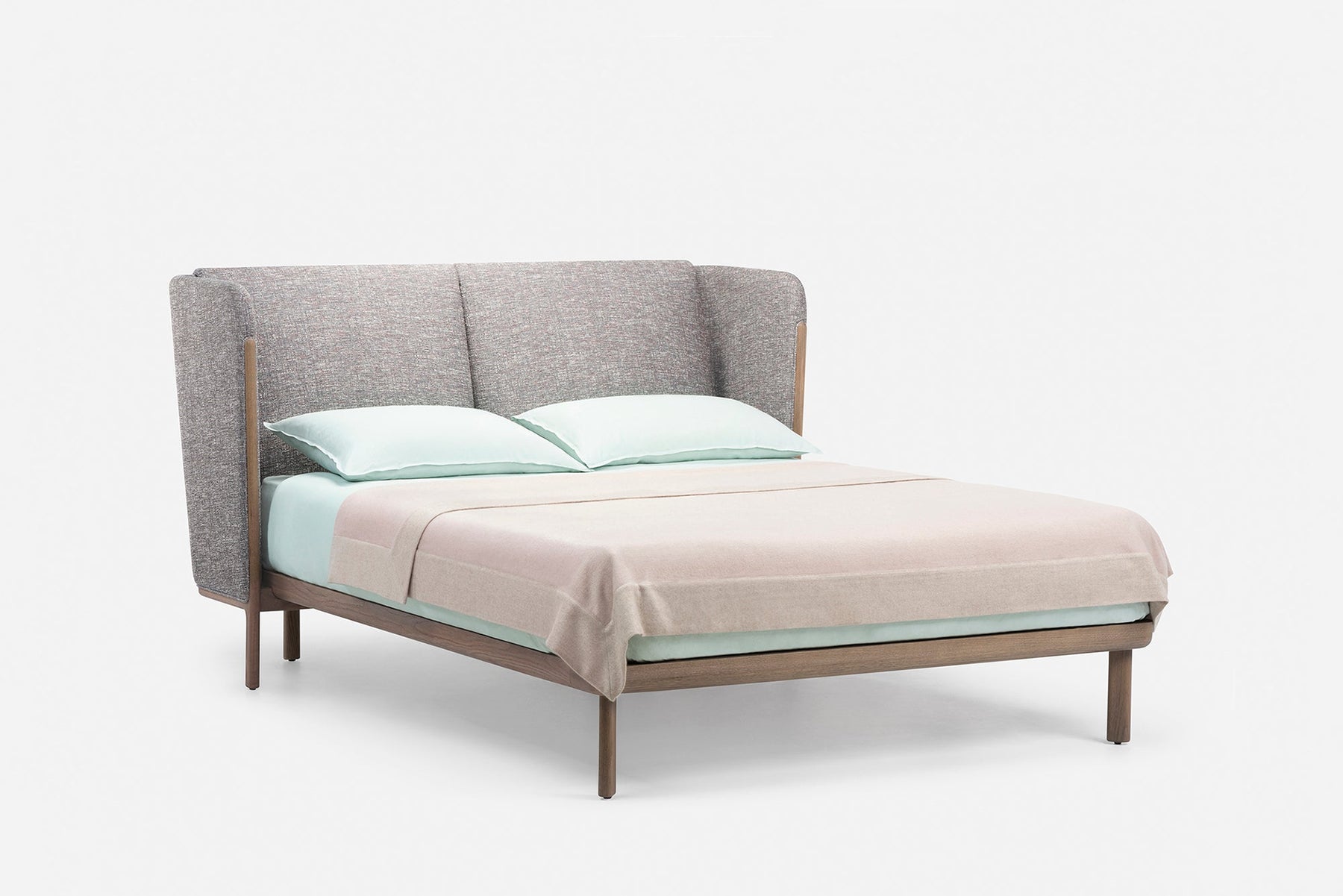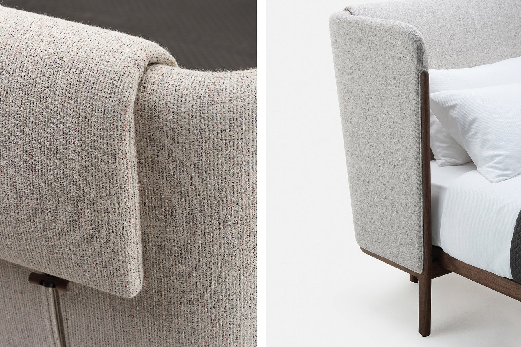 Dubois is a bed system crafted in premium solid hardwood and luxurious fabrics. The wraparound headboard provides a sense of privacy, while the exposed timber frame and generous expanse of upholstery celebrates the quality of materials and craft. Suitable for residential or contract environments, the bed is available with a low or tall headboard, with or without integrated bedside tables.