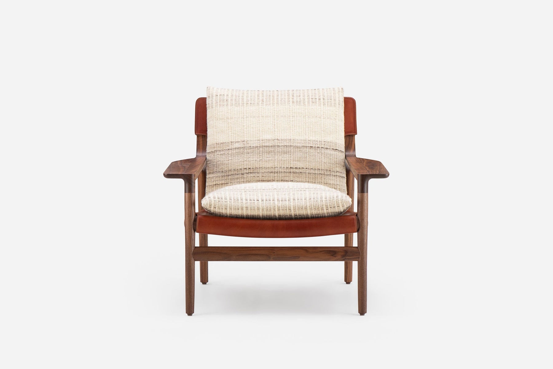 Available in black walnut, white oak, or ash in a range of finishes and saddle leather in a choice of colours. Upholstered in Manta Lido, a hand woven traditional blanket from the Alentejo region of Portugal. See menus below for further material information.