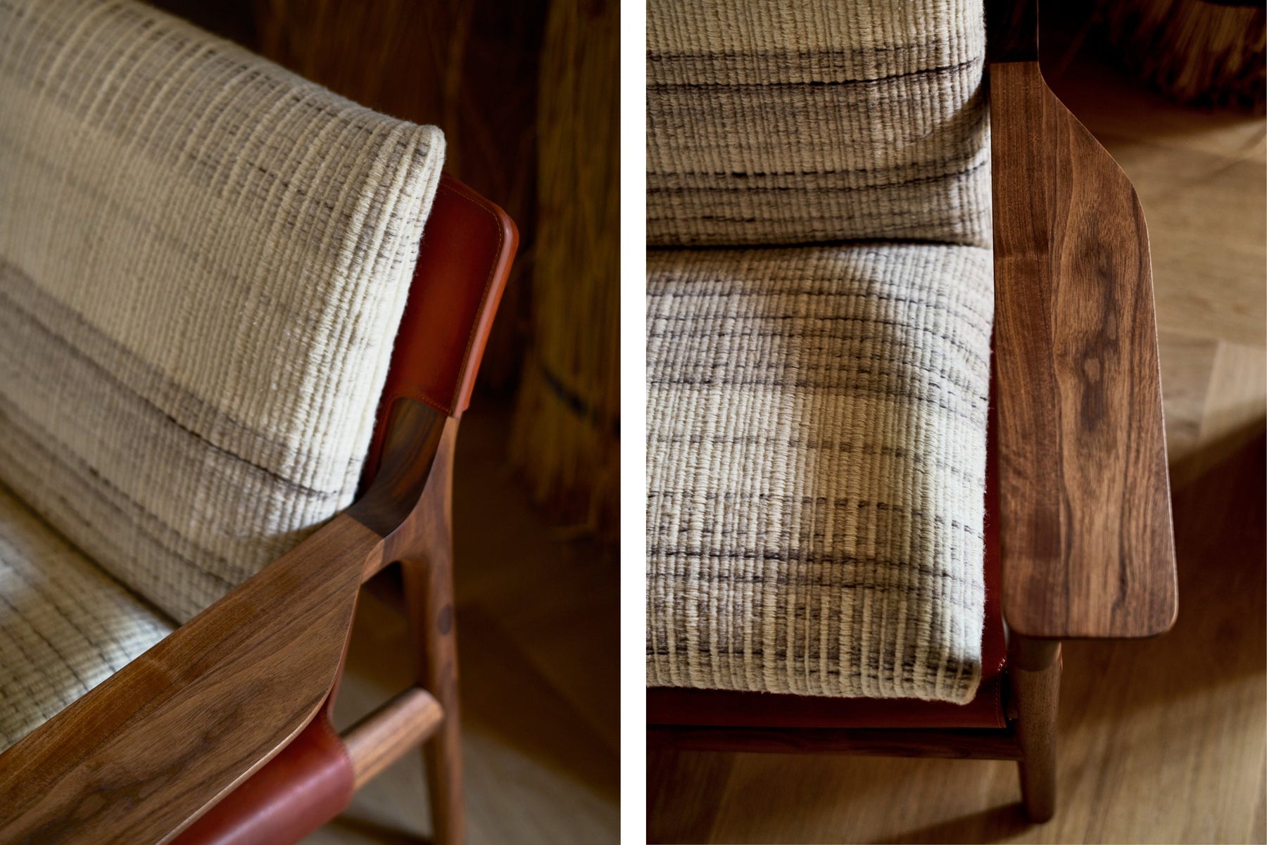 Sela Lounge Chair reflects a passion for woodworking, with a tactile timber form with beautiful joinery. An exquisite leather seat, custom made by a Portuguese saddler, is suspended from the chair frame, then softened with upholstered cushions. Sela boasts an ageless appearance with a contemporary edge; the perfect blend of natural elements, craftsmanship, and timeless appeal. Available with wide or narrow arms