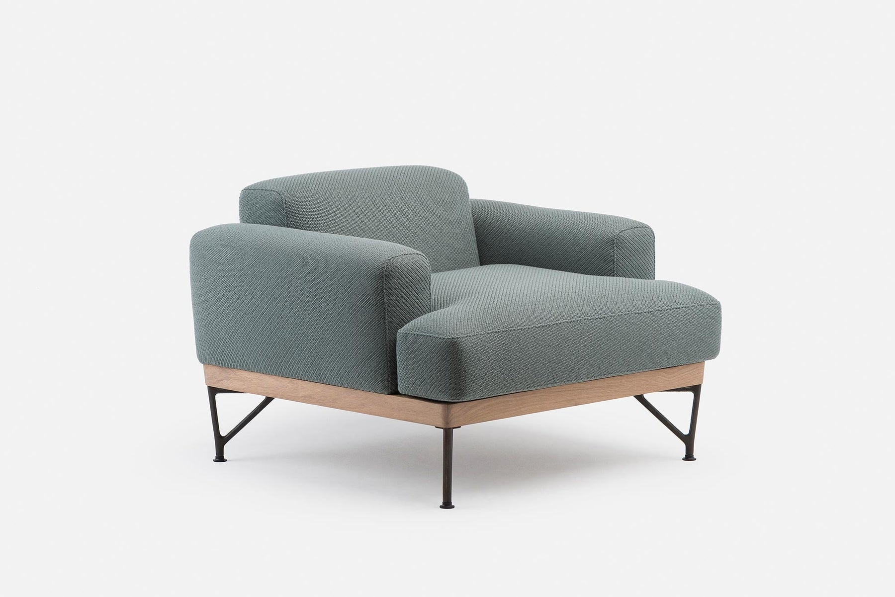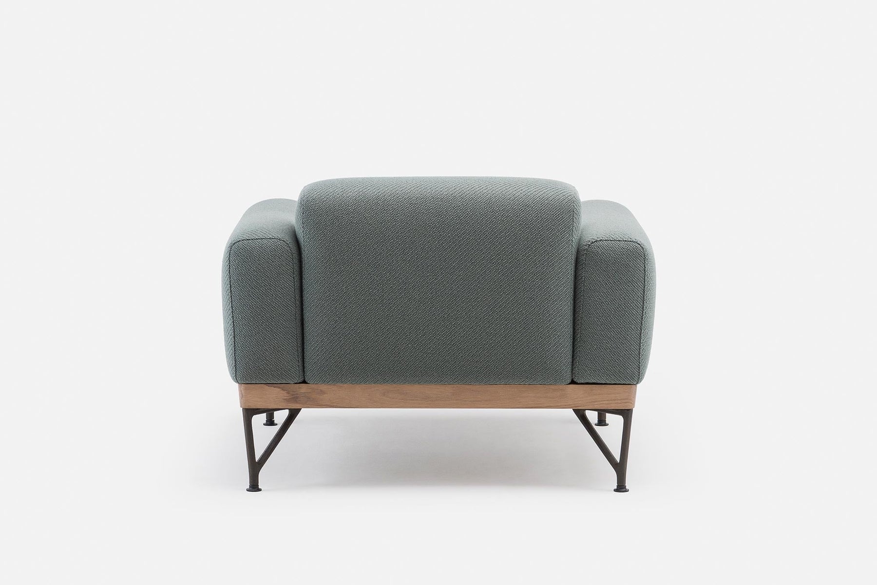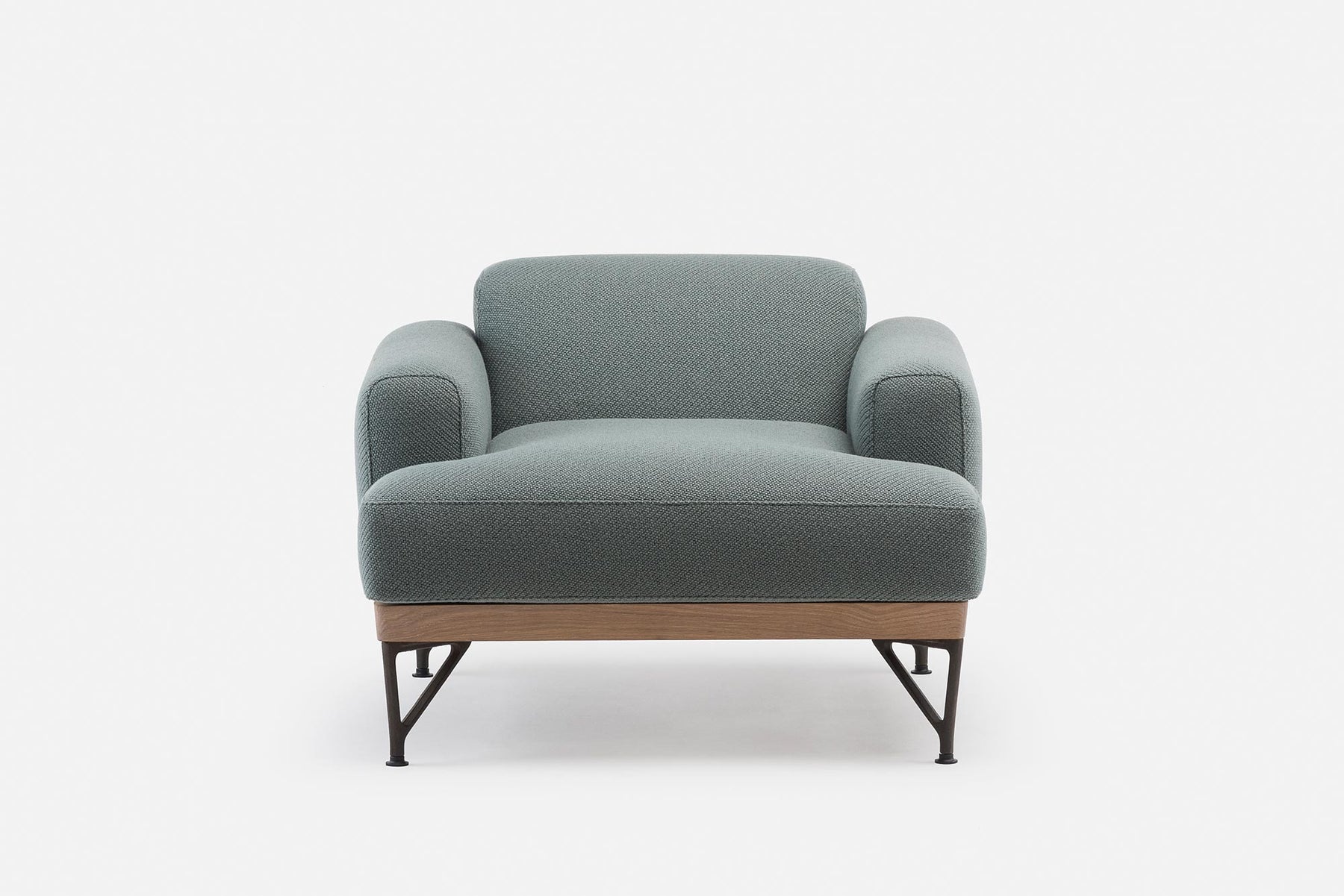 Armstrong armchair is a cool and brooding design with a low body and a base that subtly angles inward. Luxurious and robust, the chair has refined upholstery resting upon an exposed timber frame and cast iron legs. Part of a family of furniture including a sofa and coffee table.