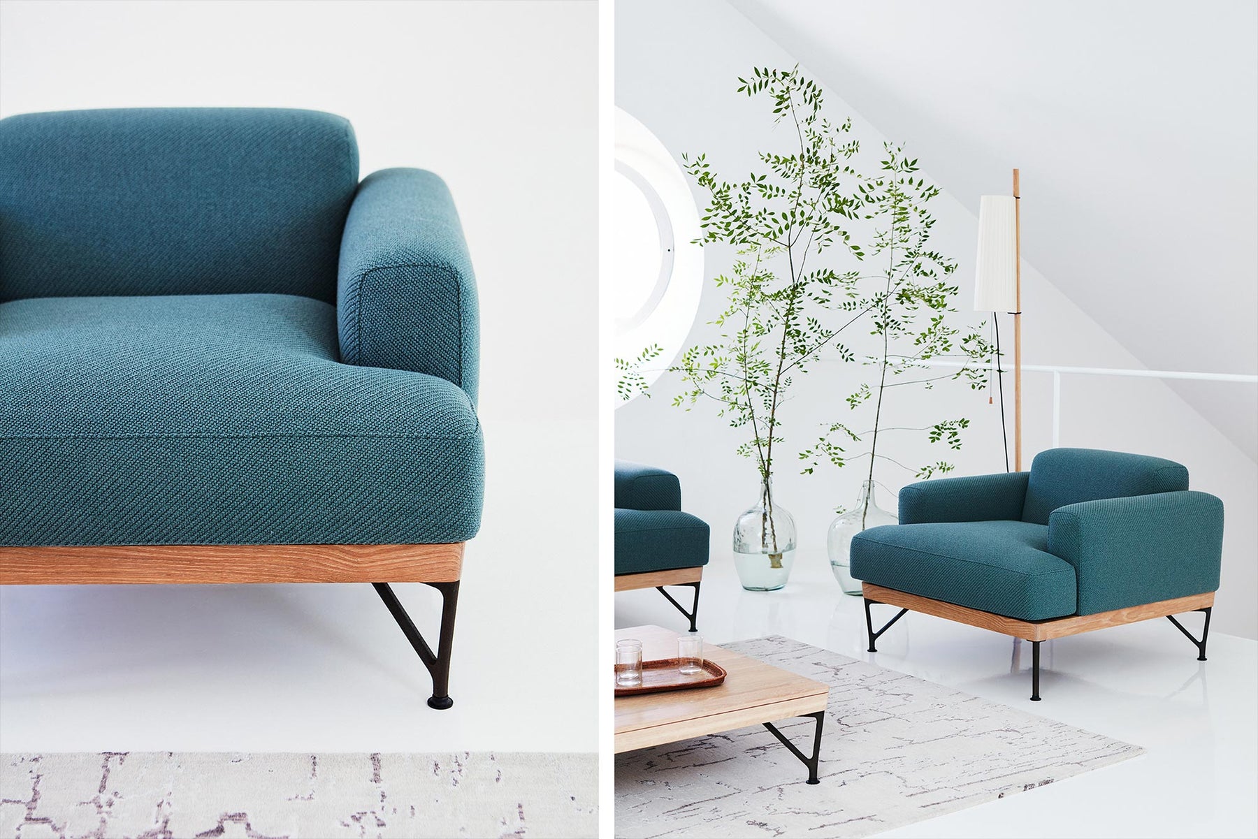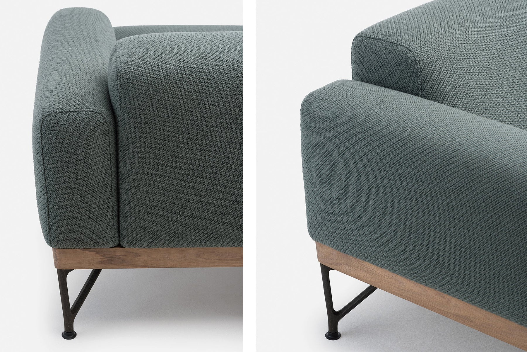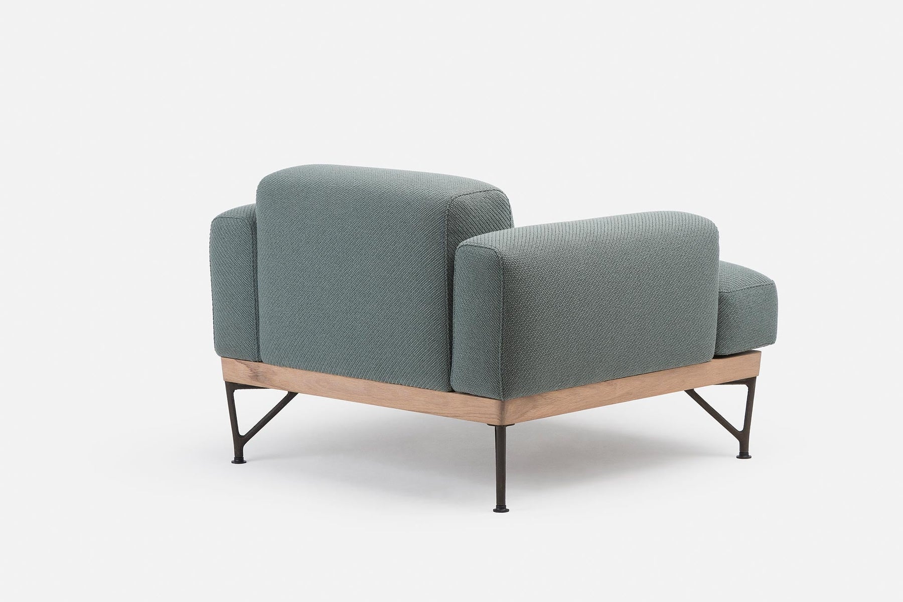 Armstrong armchair is a cool and brooding design with a low body and a base that subtly angles inward. Luxurious and robust, the chair has refined upholstery resting upon an exposed timber frame and cast iron legs. Part of a family of furniture including a sofa and coffee table.