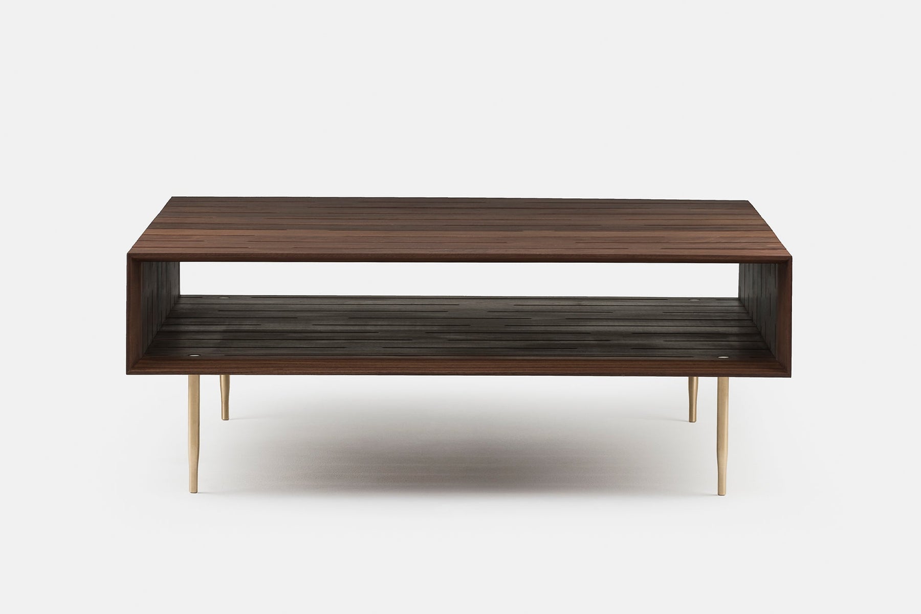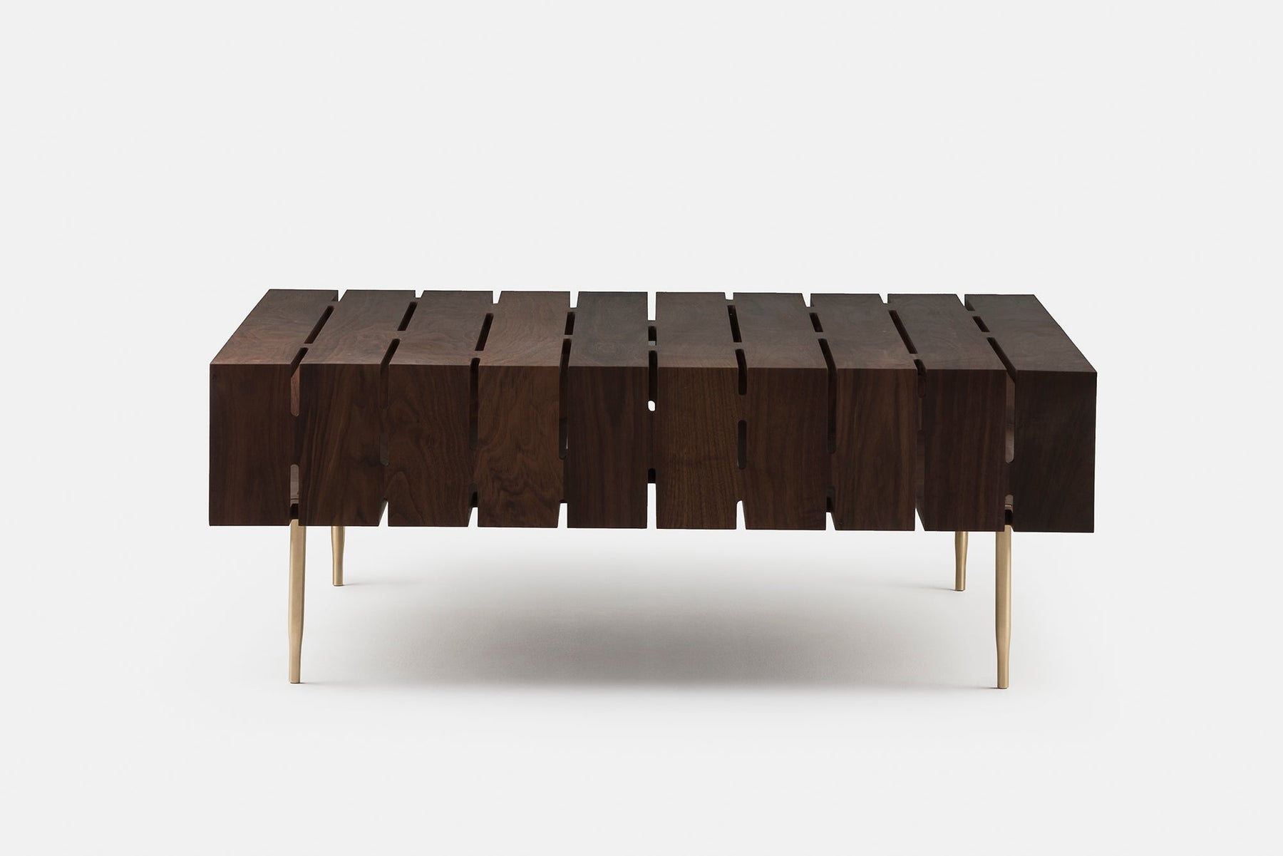 Horizon Coffee Table is an architectural solid wood design set upon solid turned brass legs. The pattern of pierced slots, created by CNC machinery, allows for semi hidden storage and the passage of light, creating beautiful cast shadows. Mitre joinery connects the timber planes into a box shape, creating an open form with superior stability.