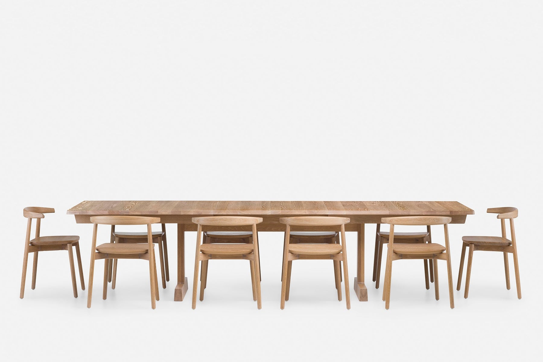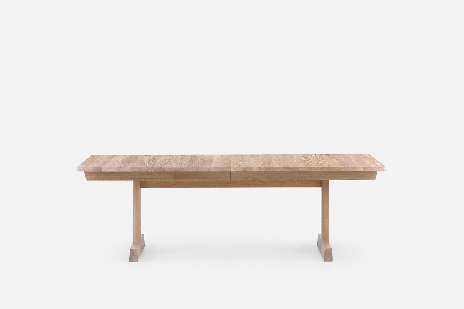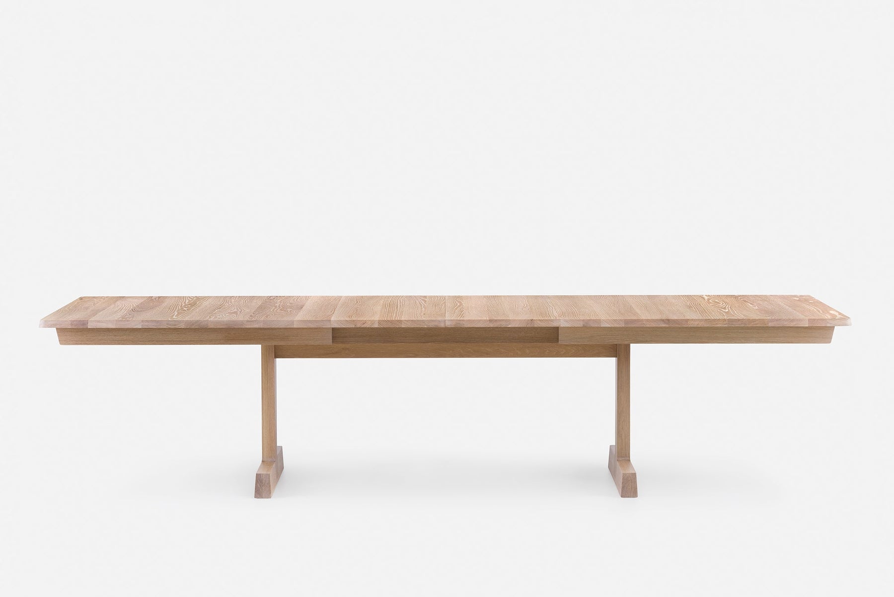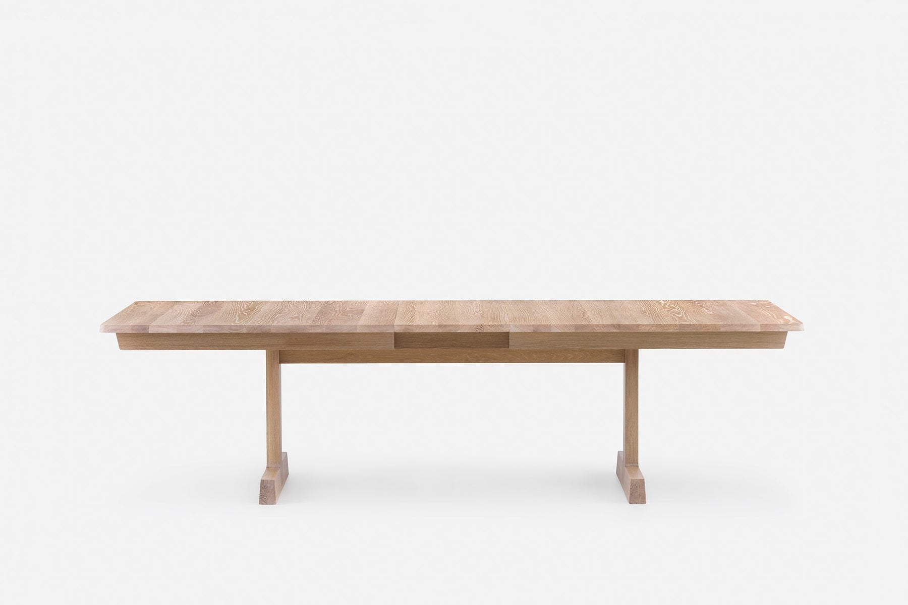 Refectory is a monastic, utilitarian, and robust extending table with a pragmatic, functional design that embraces the passage of time. A very tough yet elegant table in solid timber. Rather than conventional extension mechanisms, the table makes innovative use of linear guides - normally used for accurate and smooth movement of machine components - enabling quiet, maintenance-free operation. With two extension leaves, the table extends to three possible lengths. The solid wood extension leaves are stored in a fabric-lined compartment within the tabletop when not in use.