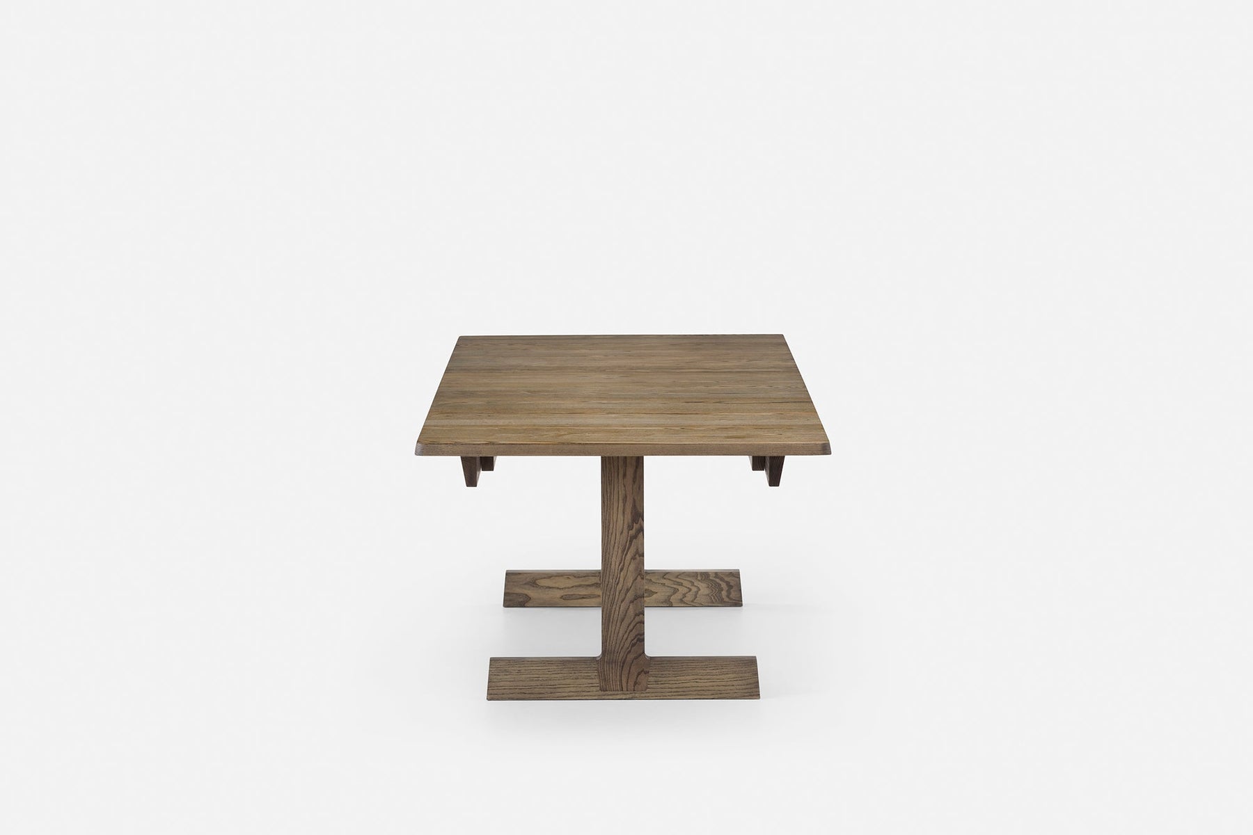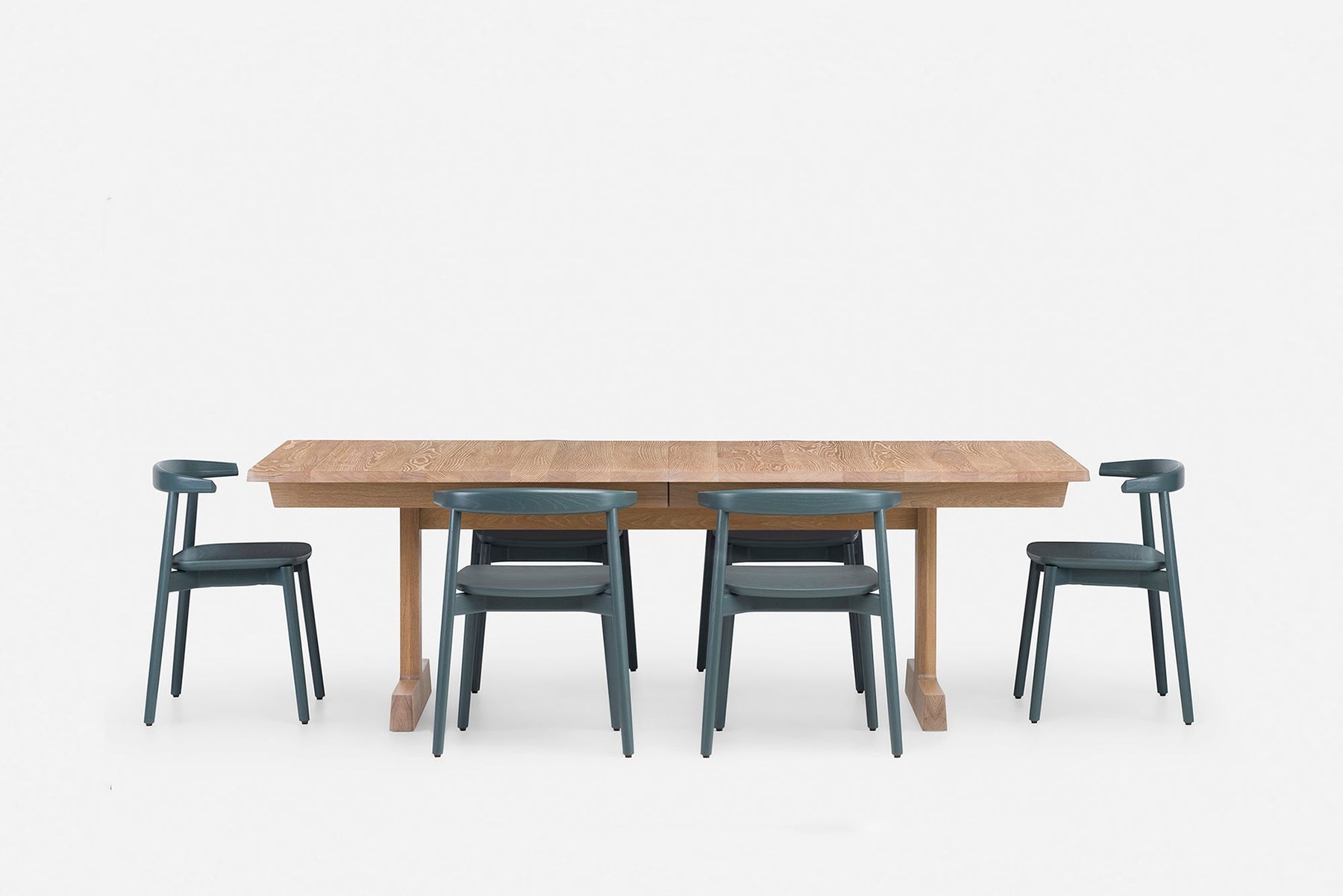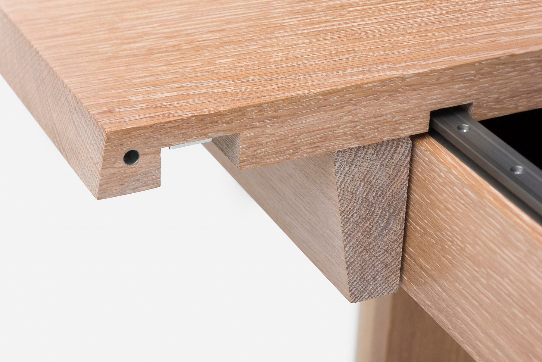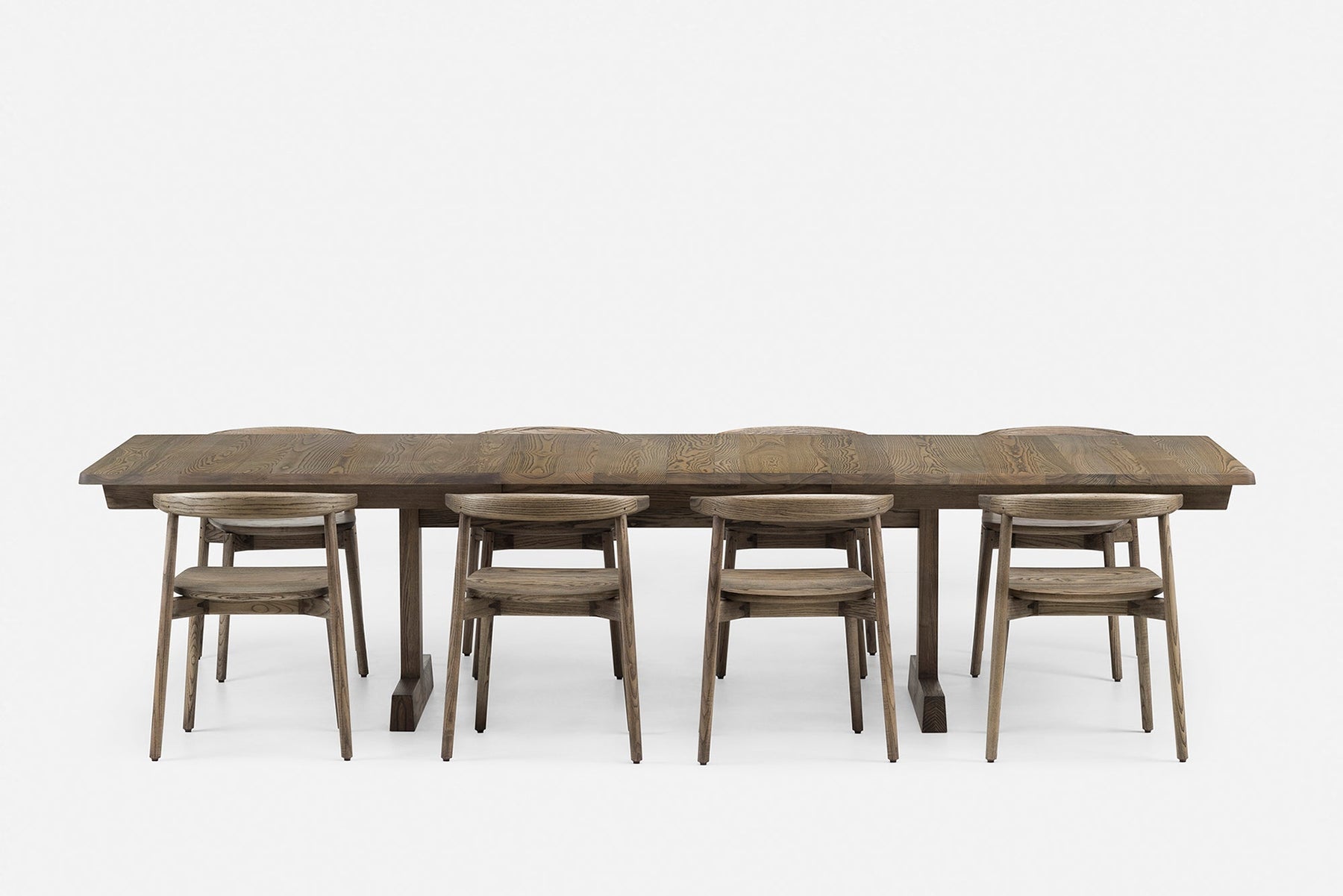 Refectory is a monastic, utilitarian, and robust extending table with a pragmatic, functional design that embraces the passage of time. A very tough yet elegant table in solid timber. Rather than conventional extension mechanisms, the table makes innovative use of linear guides - normally used for accurate and smooth movement of machine components - enabling quiet, maintenance-free operation. With two extension leaves, the table extends to three possible lengths. The solid wood extension leaves are stored in a fabric-lined compartment within the tabletop when not in use.