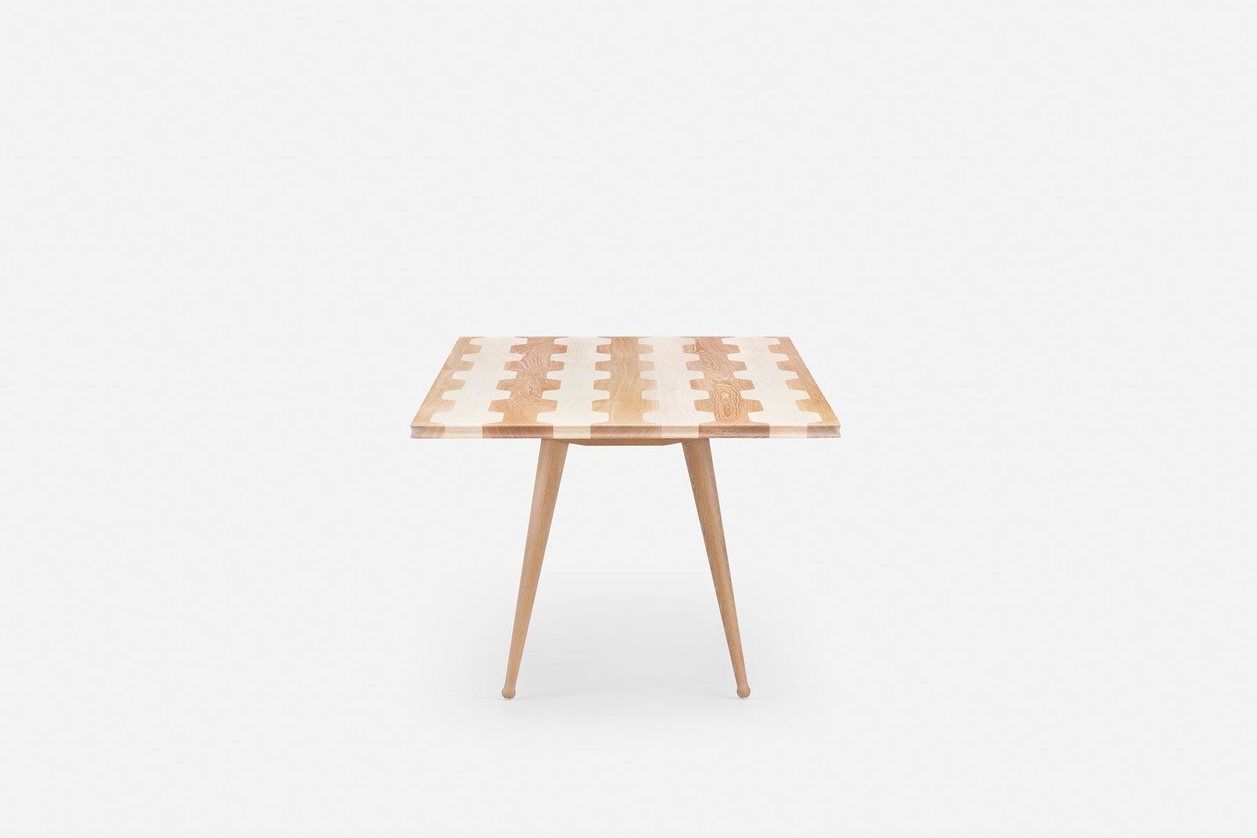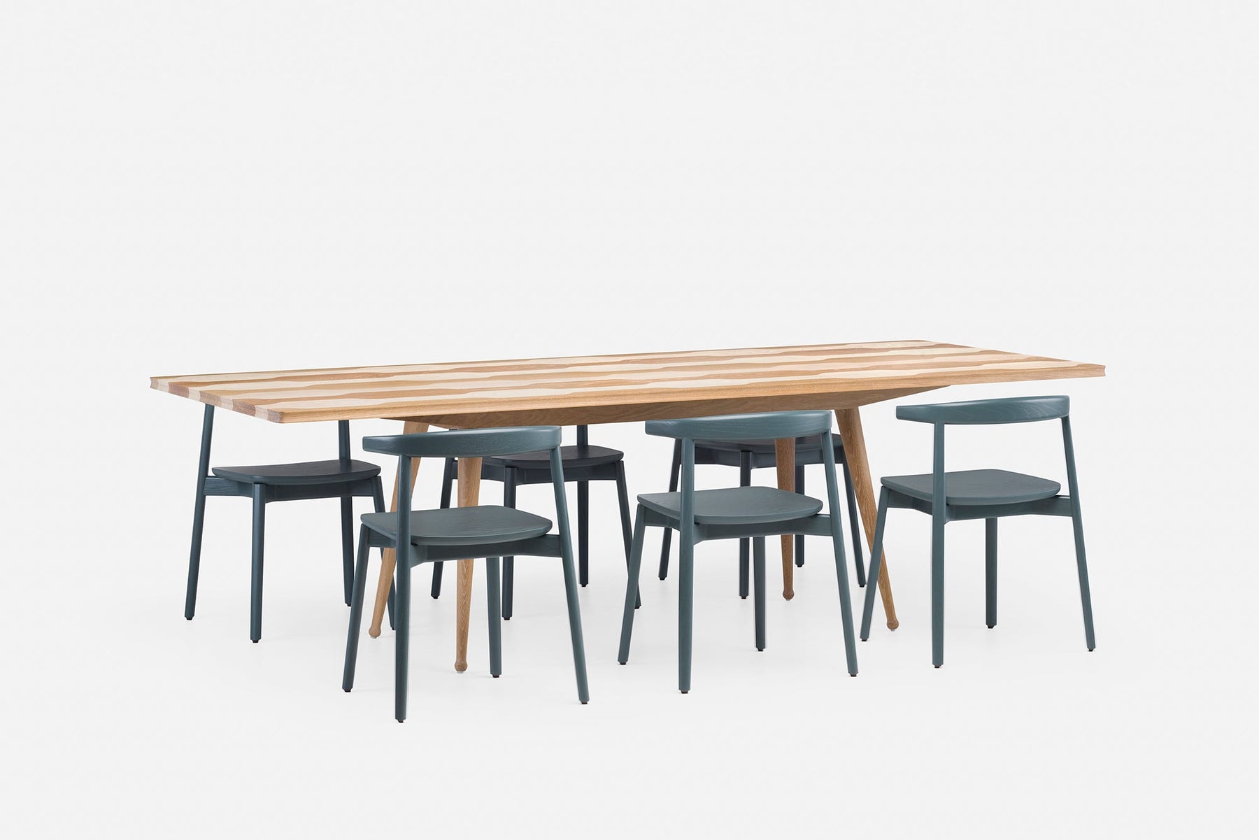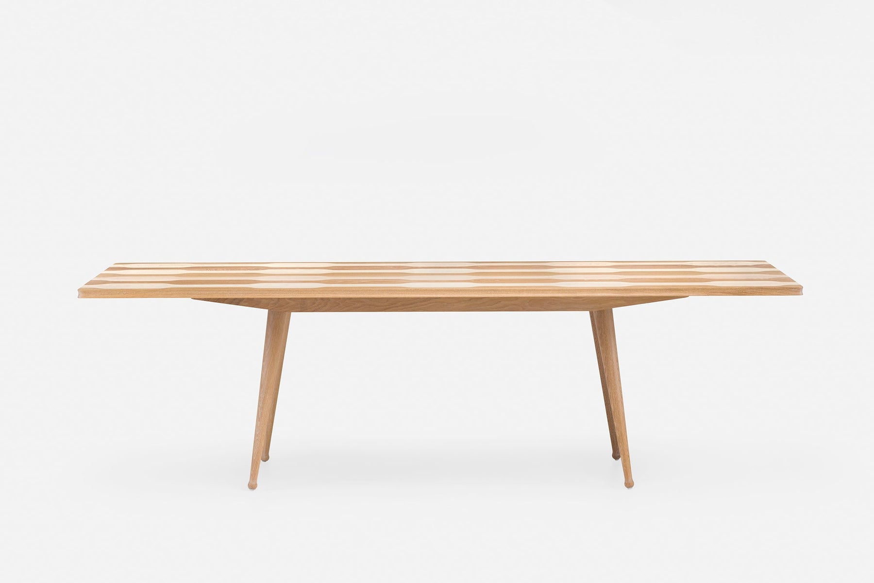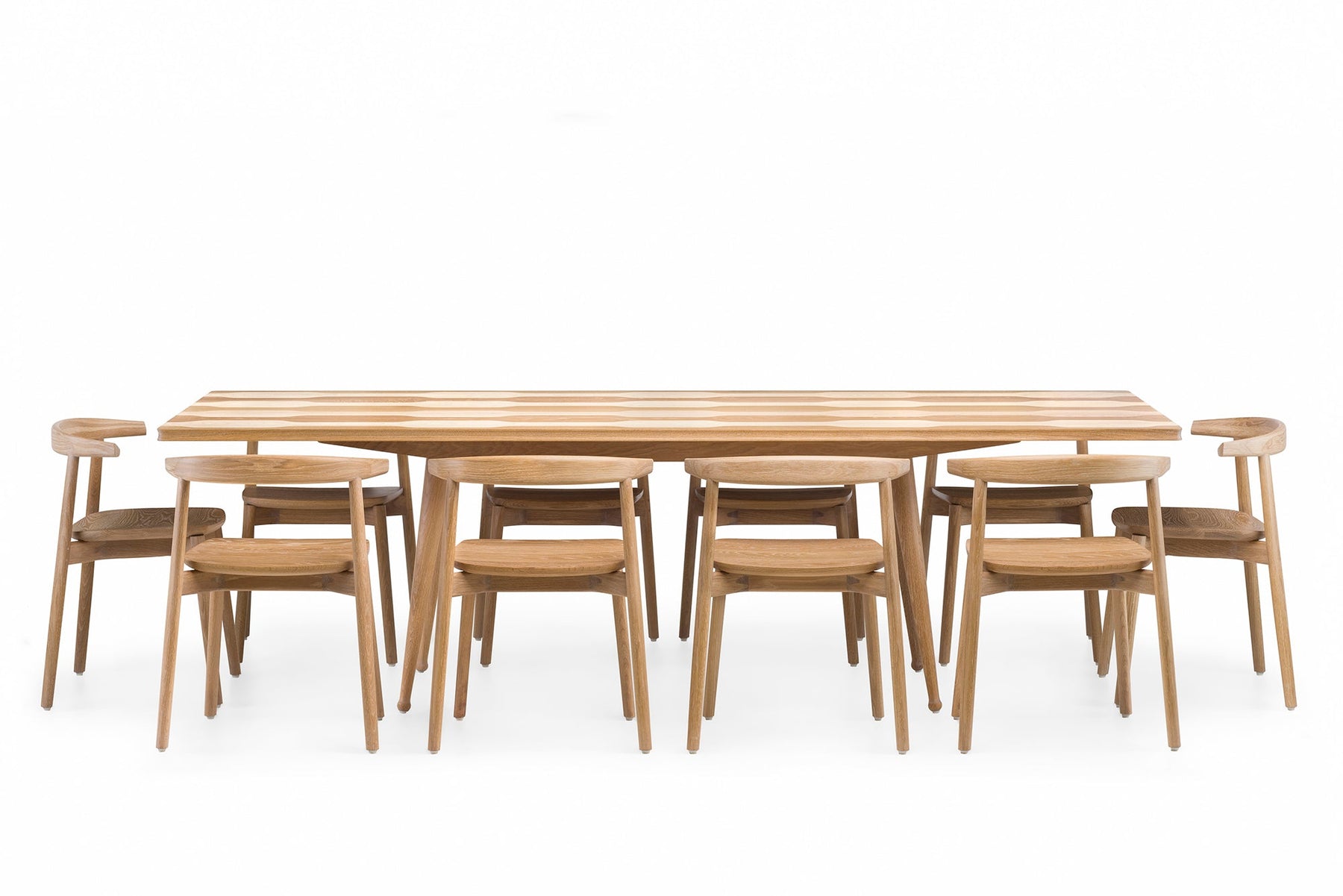 Tavli is a solid wood dining table with a tabletop that features a decorative joint detail: each plank in the tabletop is shaped with an undulating edge, creating a continuous, repeating geometric pattern across the length of the table. Named after the backgammon tavli board, this table reimagines the decorative wood detailing of its namesake.