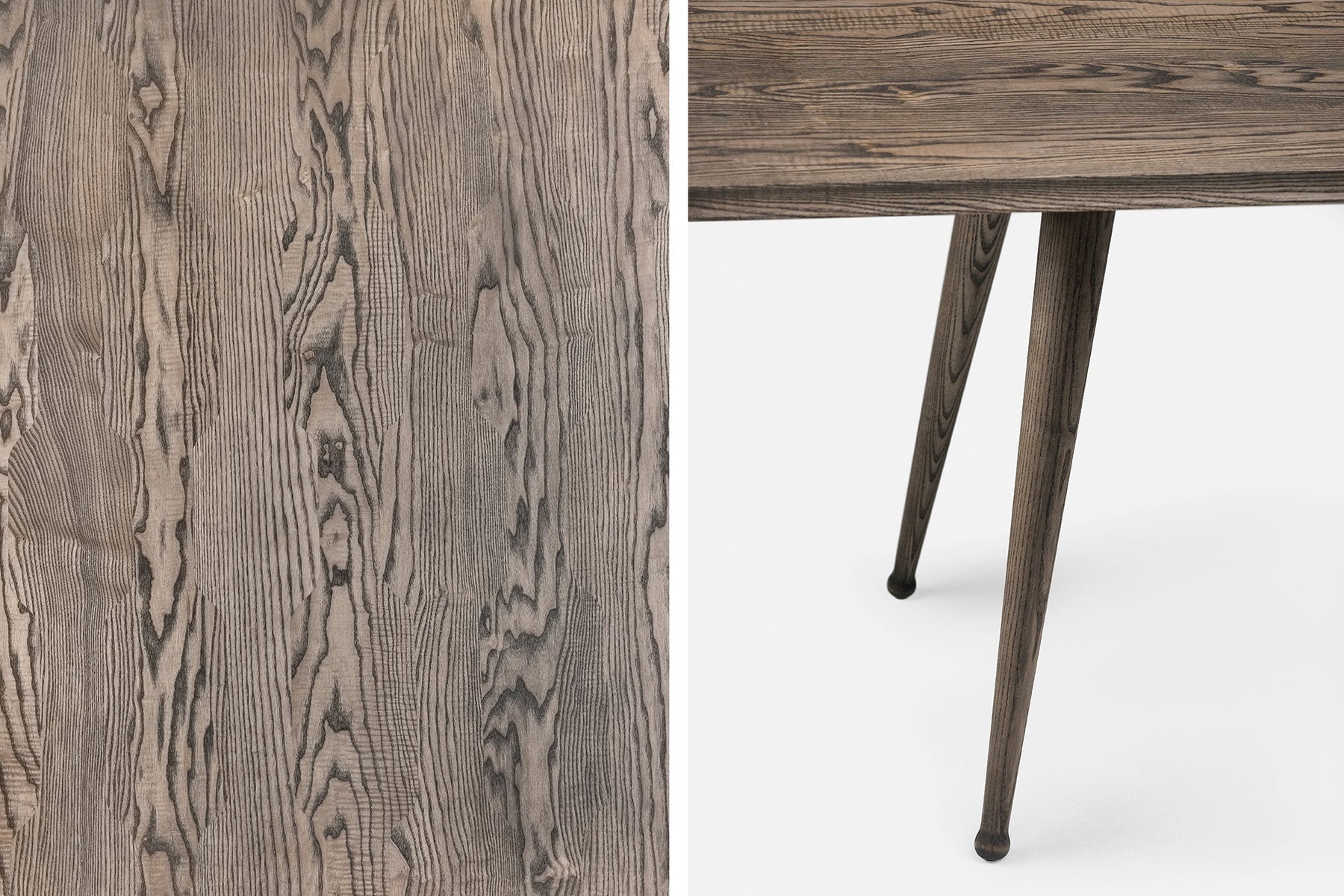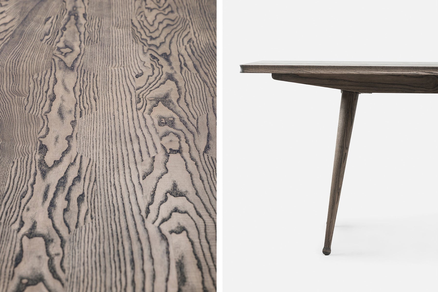 Available in black walnut, white oak, or ash in a range of finishes, as a single timber/finish or timber combinations including: Danish oiled walnut and ash, Danish oiled walnut and oak, black oiled walnut and ash, or white oiled oak and ash. Tables with timber combination tabletops have legs in the same timber/finish as the outermost planks on the tabletop.