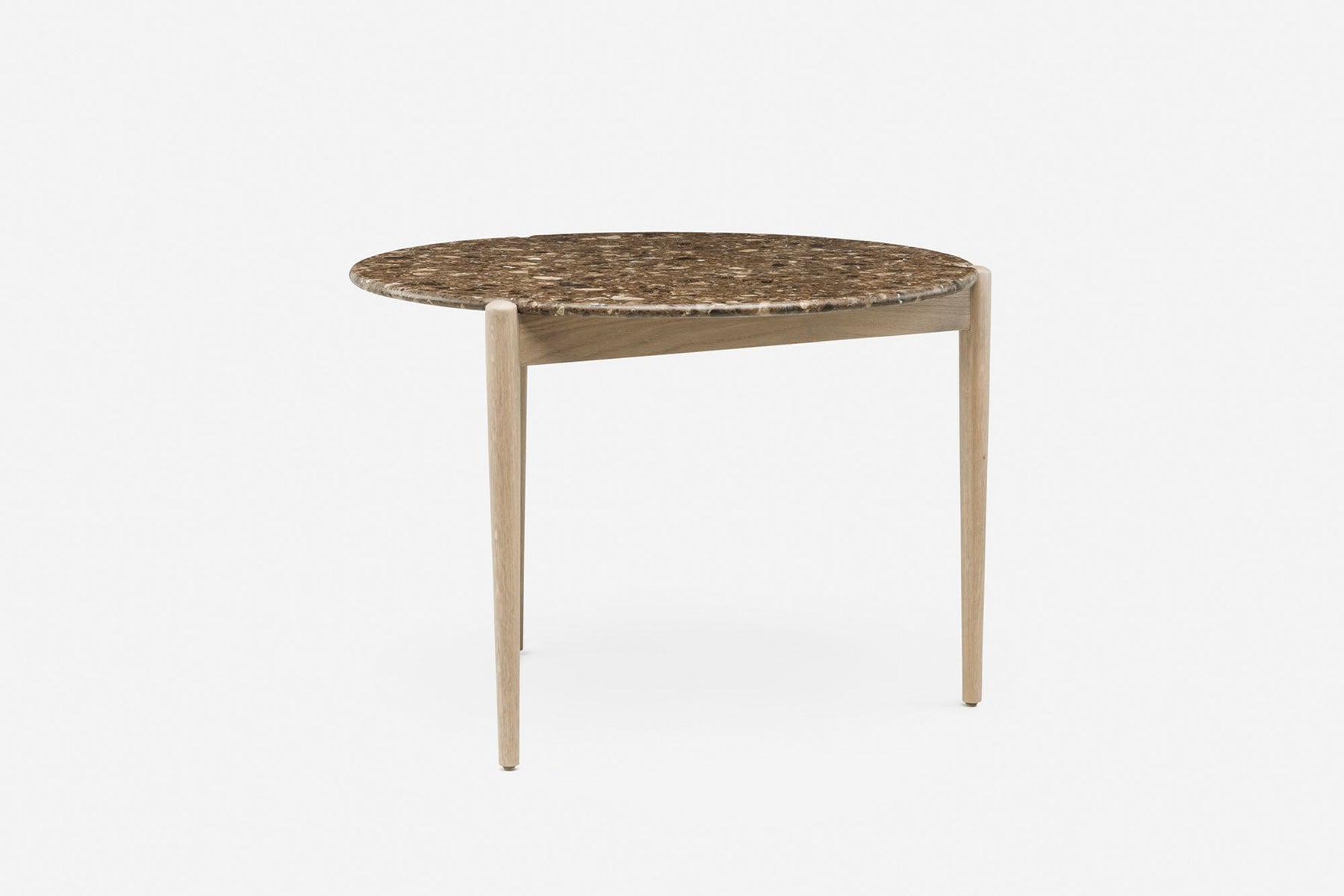 Available in black walnut, white oak, or ash in a range of finishes. Terrazzo tabletop in a choice of colours. See menus below for further material information.