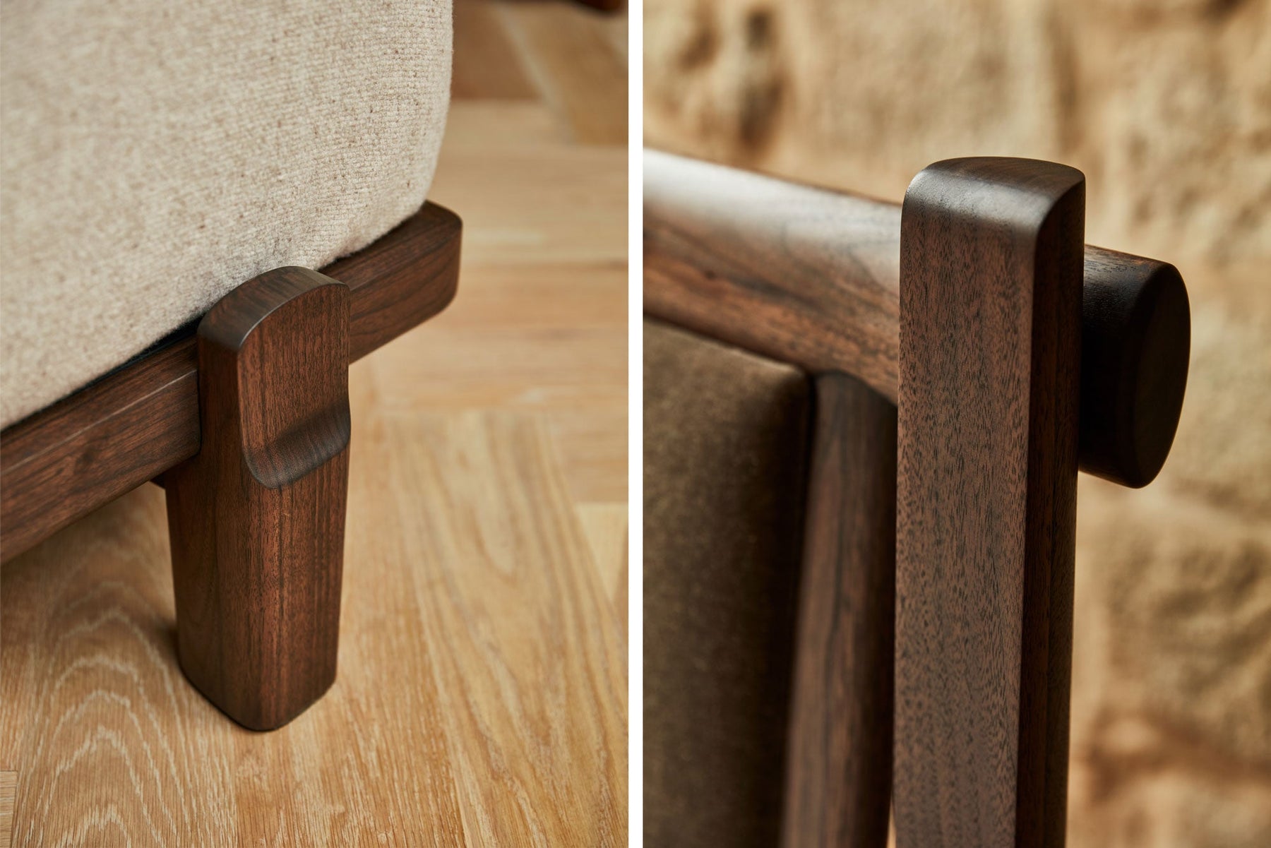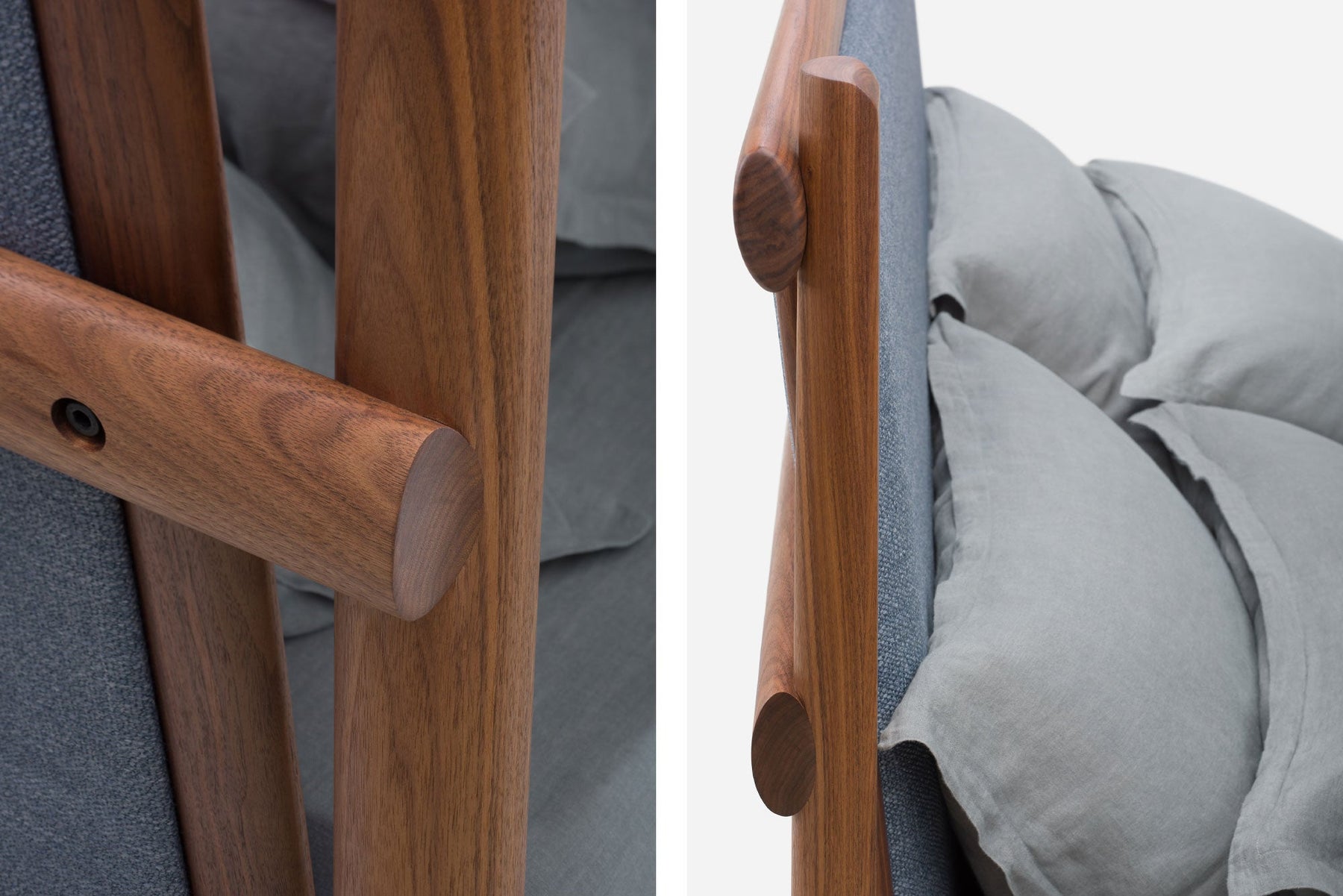 Available in black walnut, white oak, or ash in a range of finishes, and a range of fabric and leather options. See menus below for further material information.