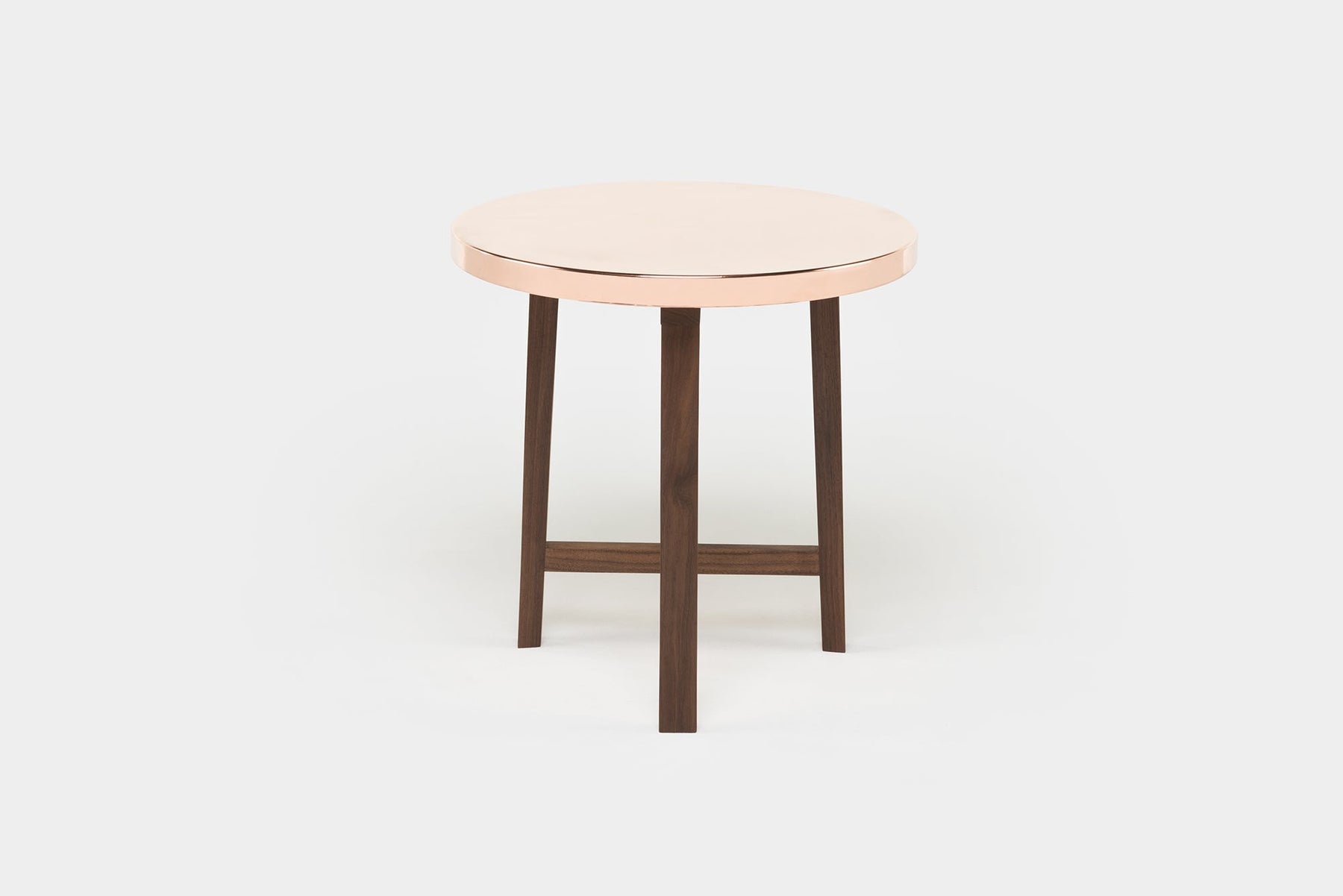 Available in black walnut, white oak, or ash in a range of finishes with top in polished brass or polished copper. See menus below for further material information.