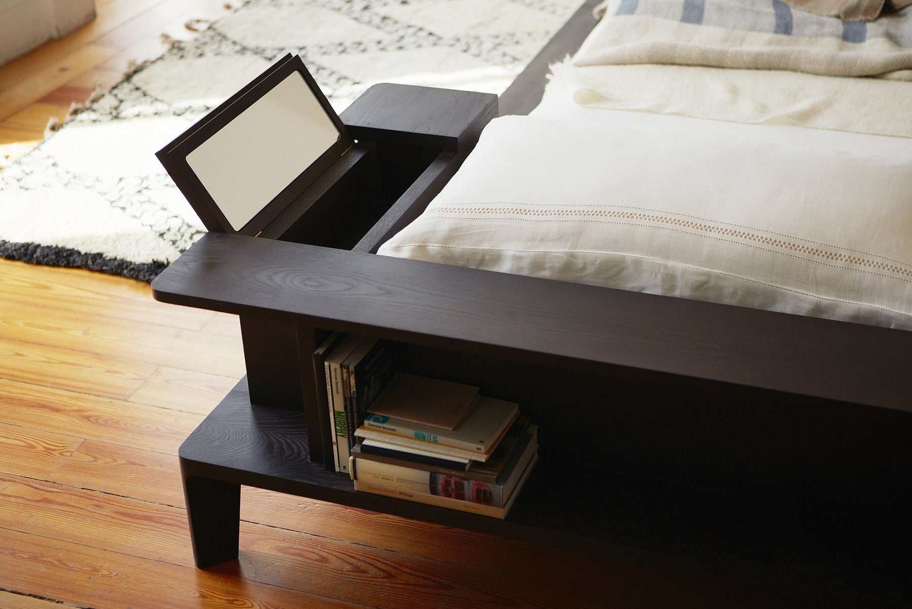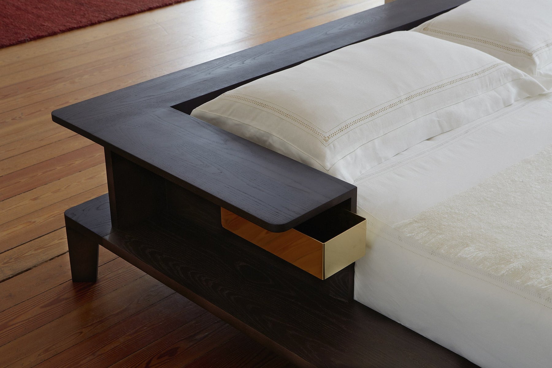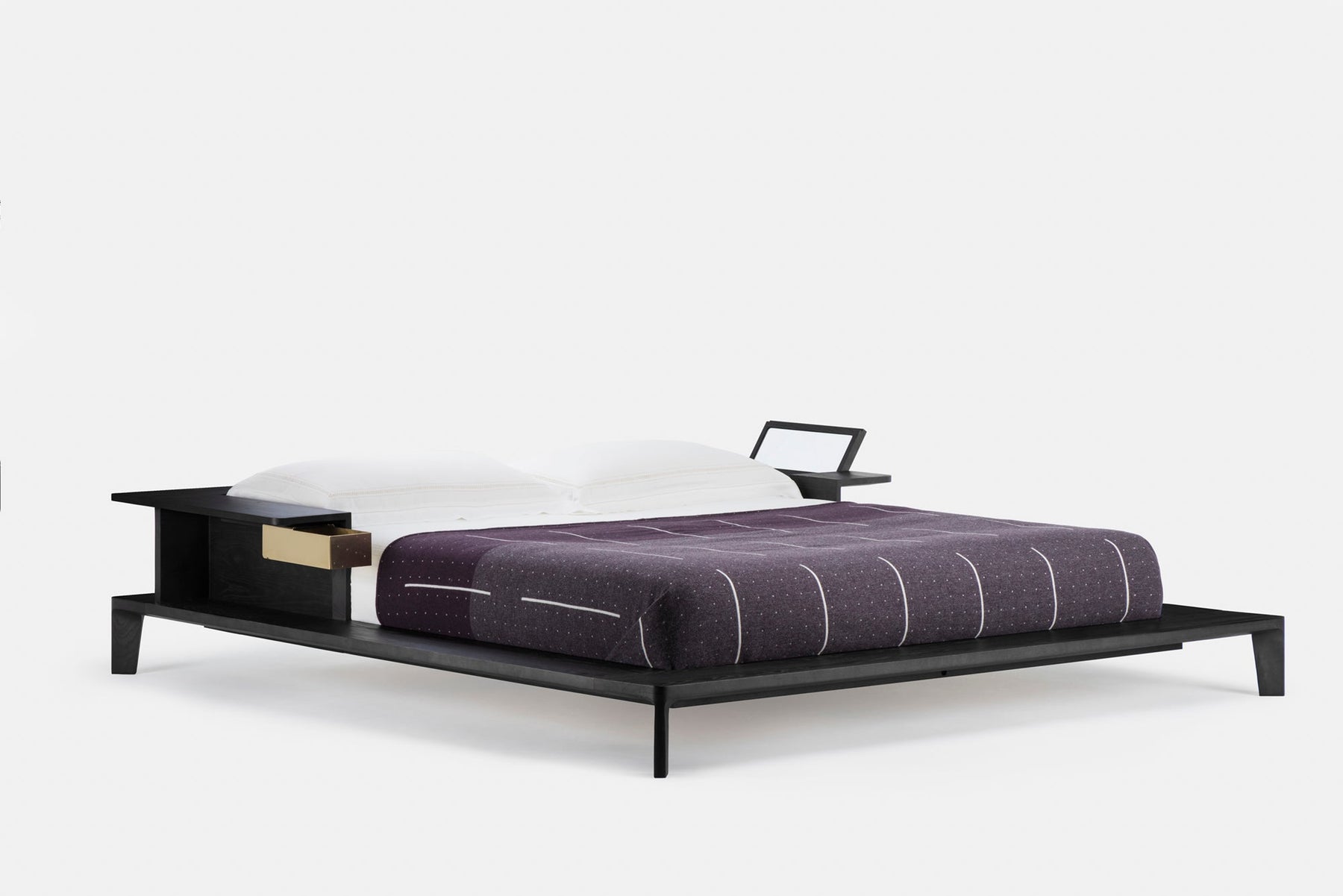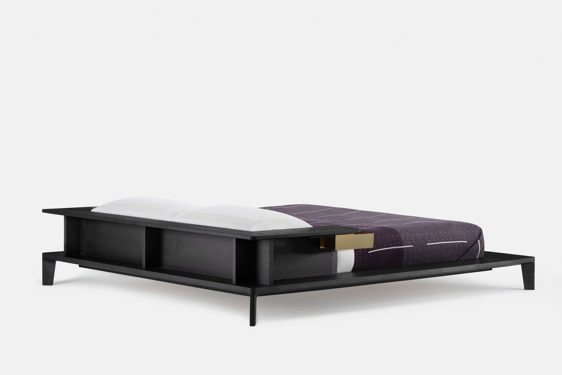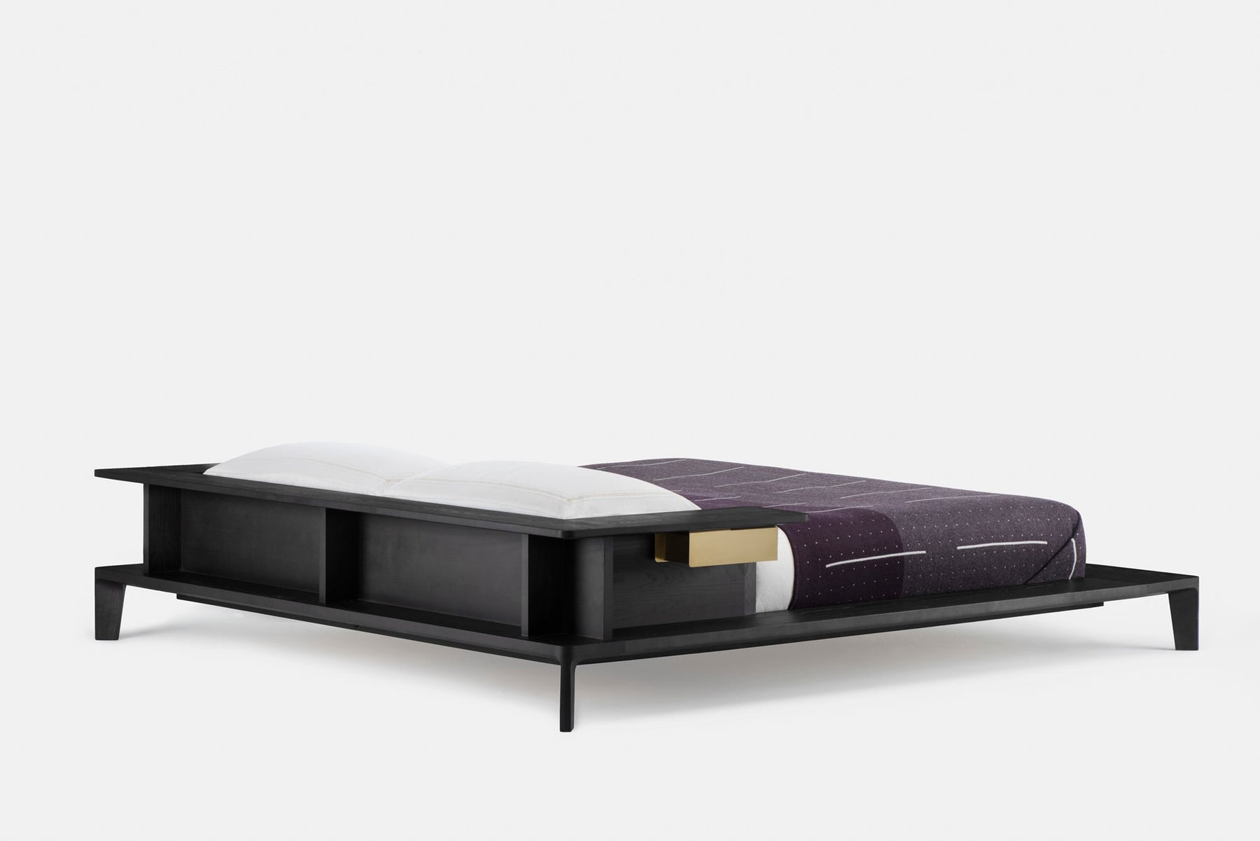Inspired by Opium beds which have been in China since the Tang Dynasty, Platform is perfect for lazy Sunday mornings with its generous solid wood frame offering space for cups of tea and books. Storage compartments include a solid brass drawer and a timber compartment beneath a fold out mirror.