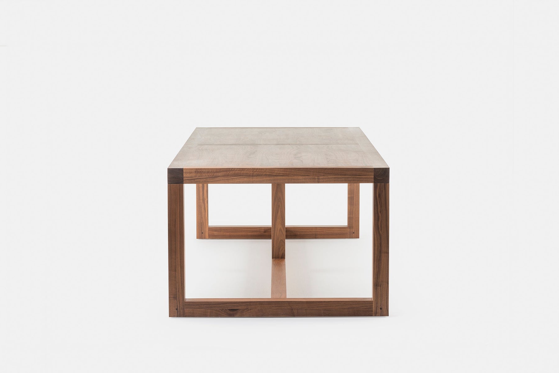 Structure is a modern timber table with substantial proportions suitable for communal dining. Two rectilinear frames, crafted from generous planks of solid wood joined with mortise and tenon, form a continuous line from the legs through the tabletop frame. A central support beam recalls a classic refectory table, translated into a more pared back, geometric form.