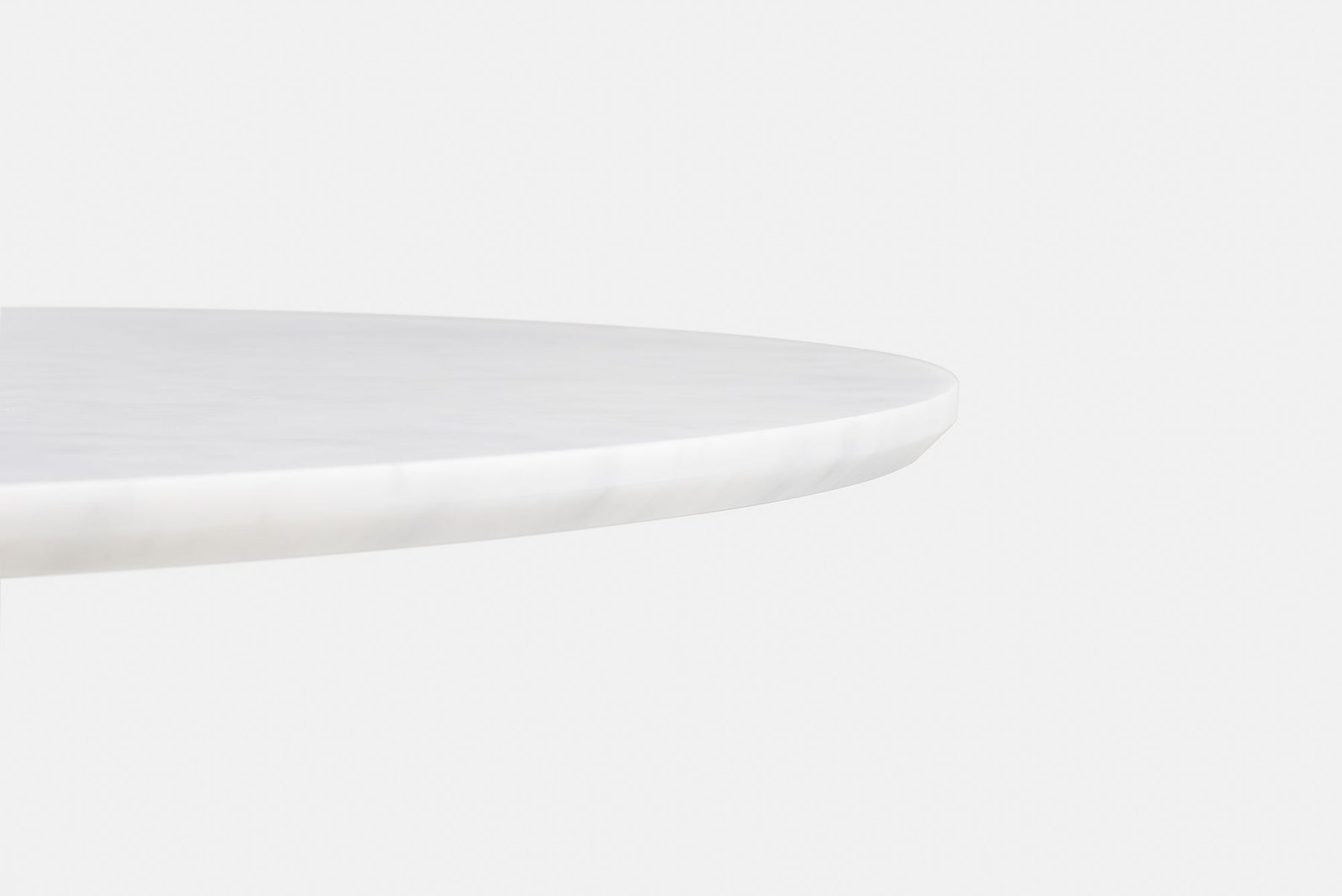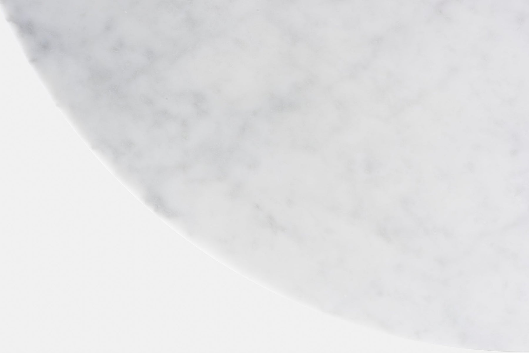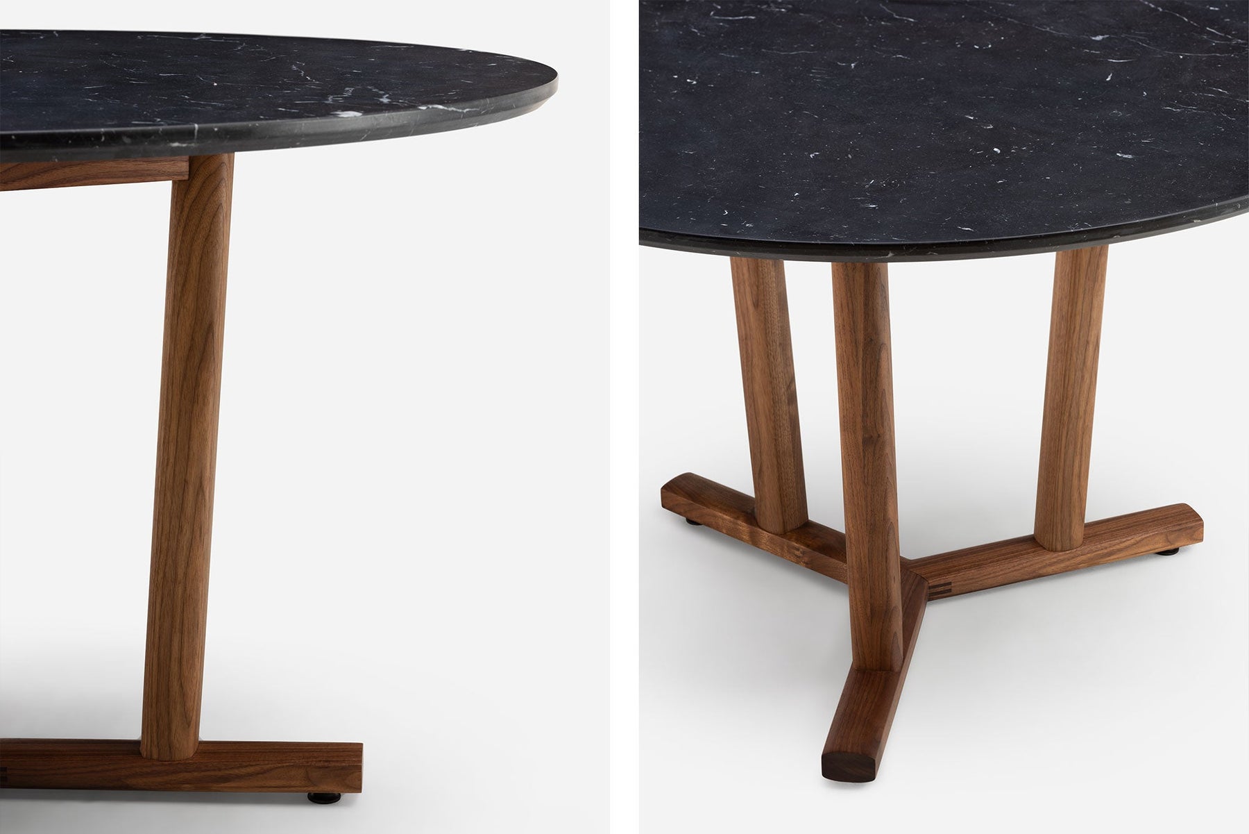 Available in black walnut, white oak, or ash in a range of finishes, with a tabletop in timber or a choice of Carrara marble, Black Marquina marble, Rosa Negrais marble, or Ataija Creme limestone. See menus below for further material information.