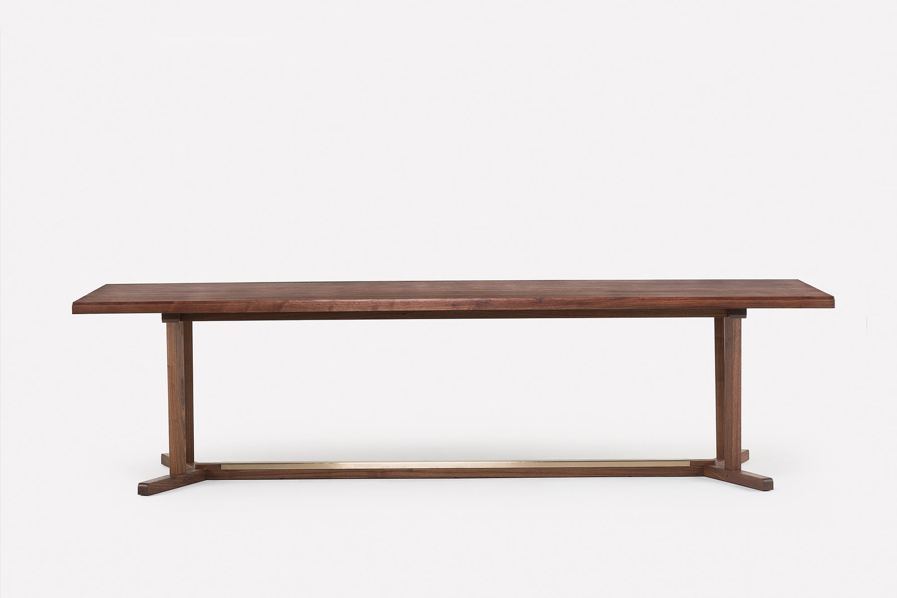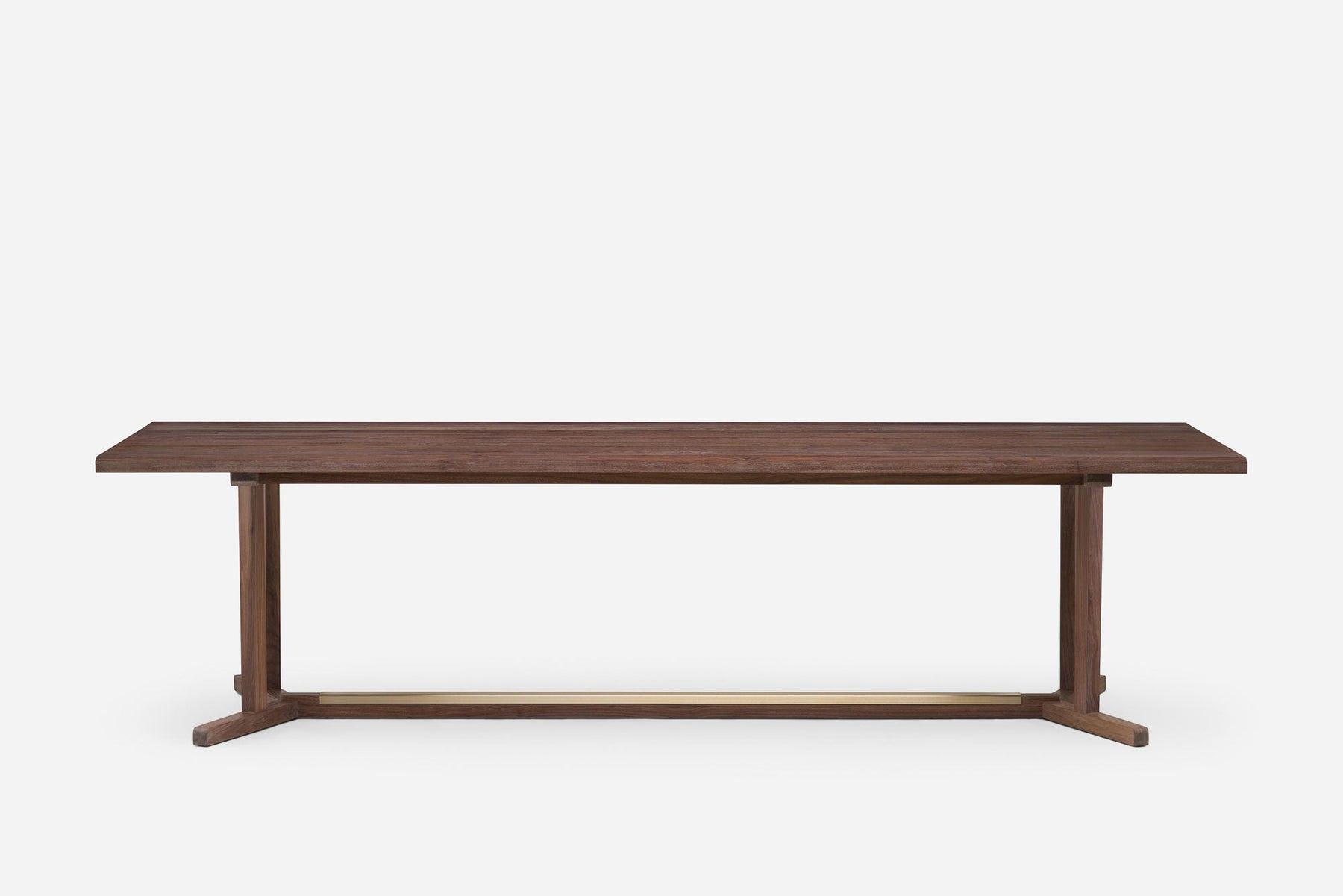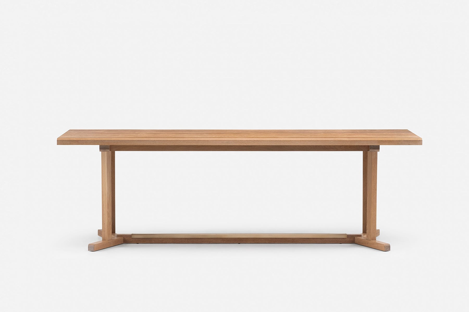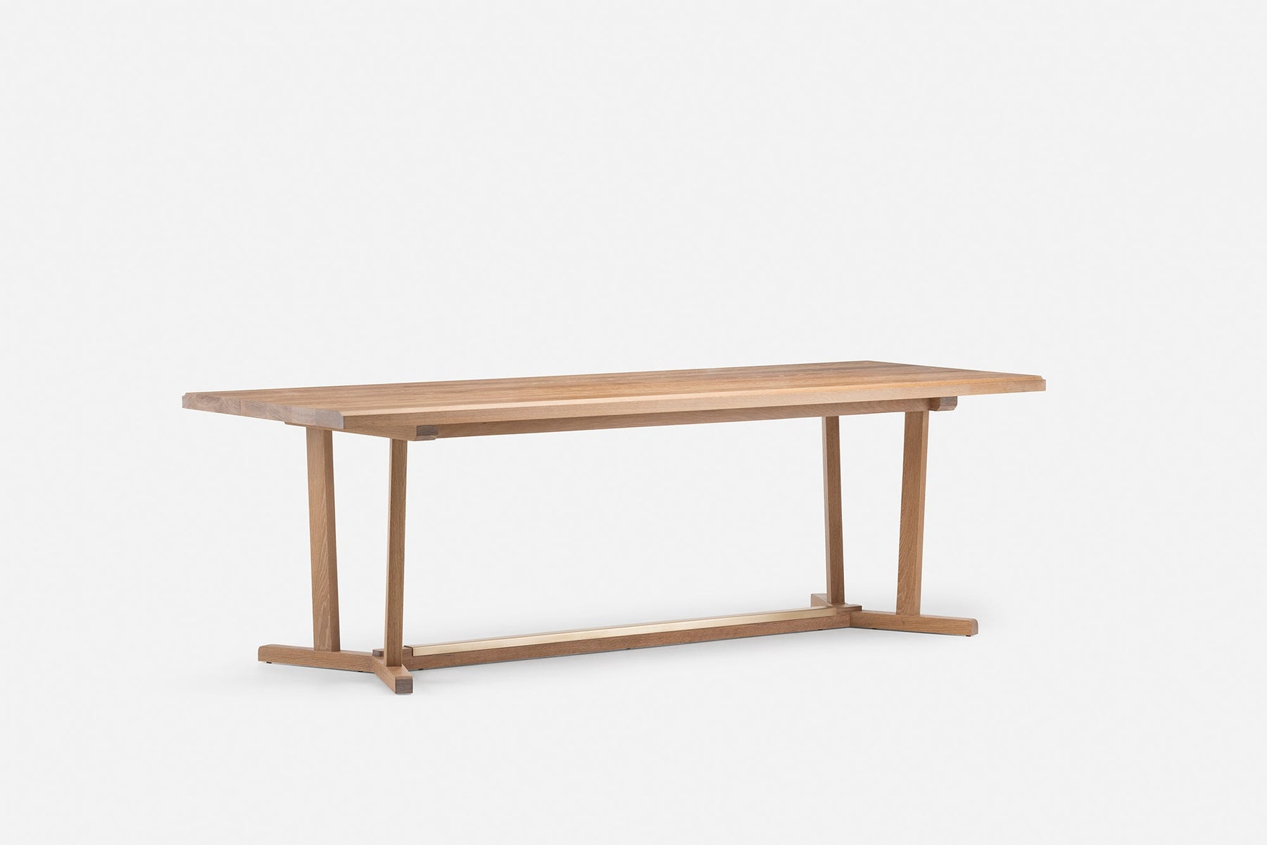 Shaker is a dining table inspired by the simple, honest and utilitarian approach of the movement after which it is named. Made from generous planks of solid wood, the table showcases the natural colour and grain of the timber. The leg frame recalls that of a refectory table, and includes a brushed brass detail on the cross beam.