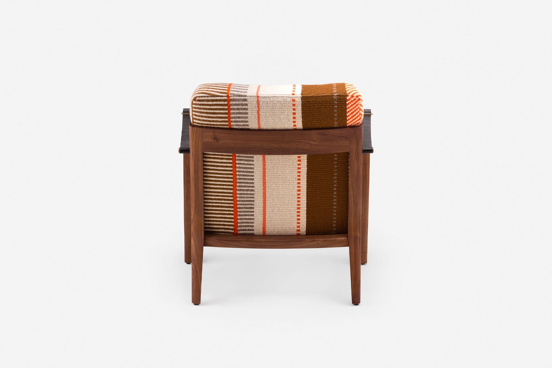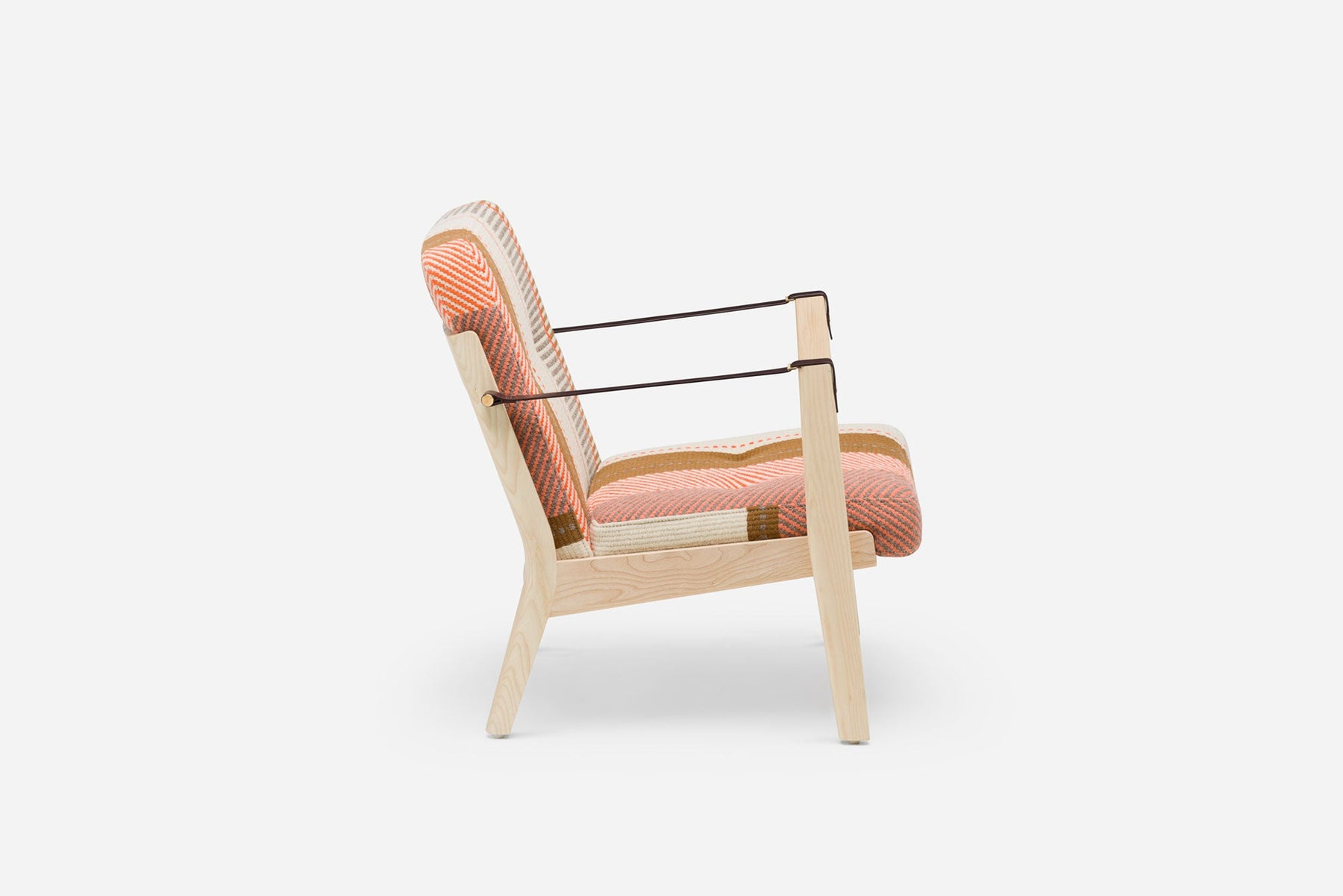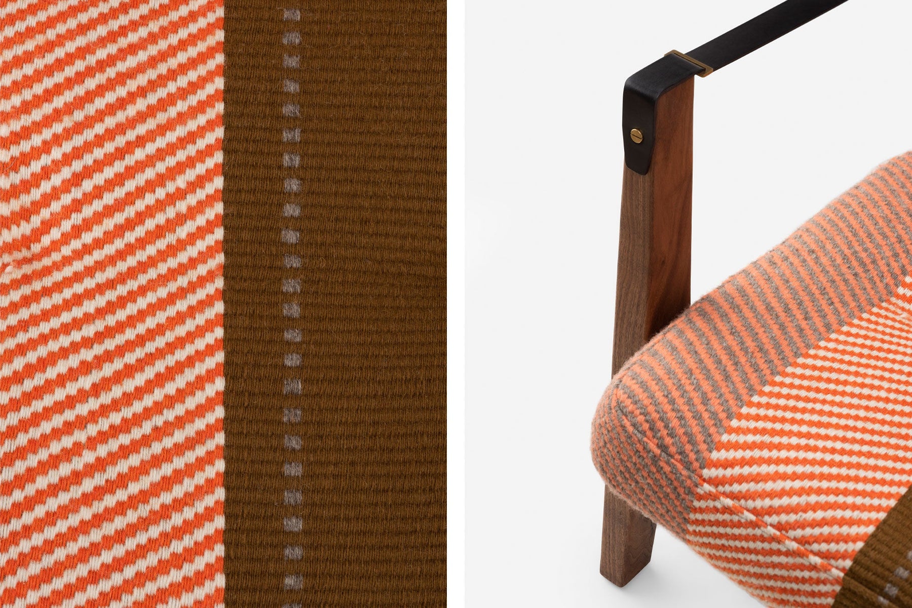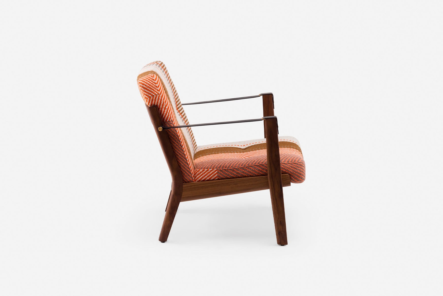 Available in black walnut, white oak, or ash in a range of finishes. Upholstered in Manta Espinhada, a hand woven traditional blanket from the Alentejo region of Portugal. Leather belting strap arms in black or brown with brass-coloured PVD detailing. See menus below for further material information.