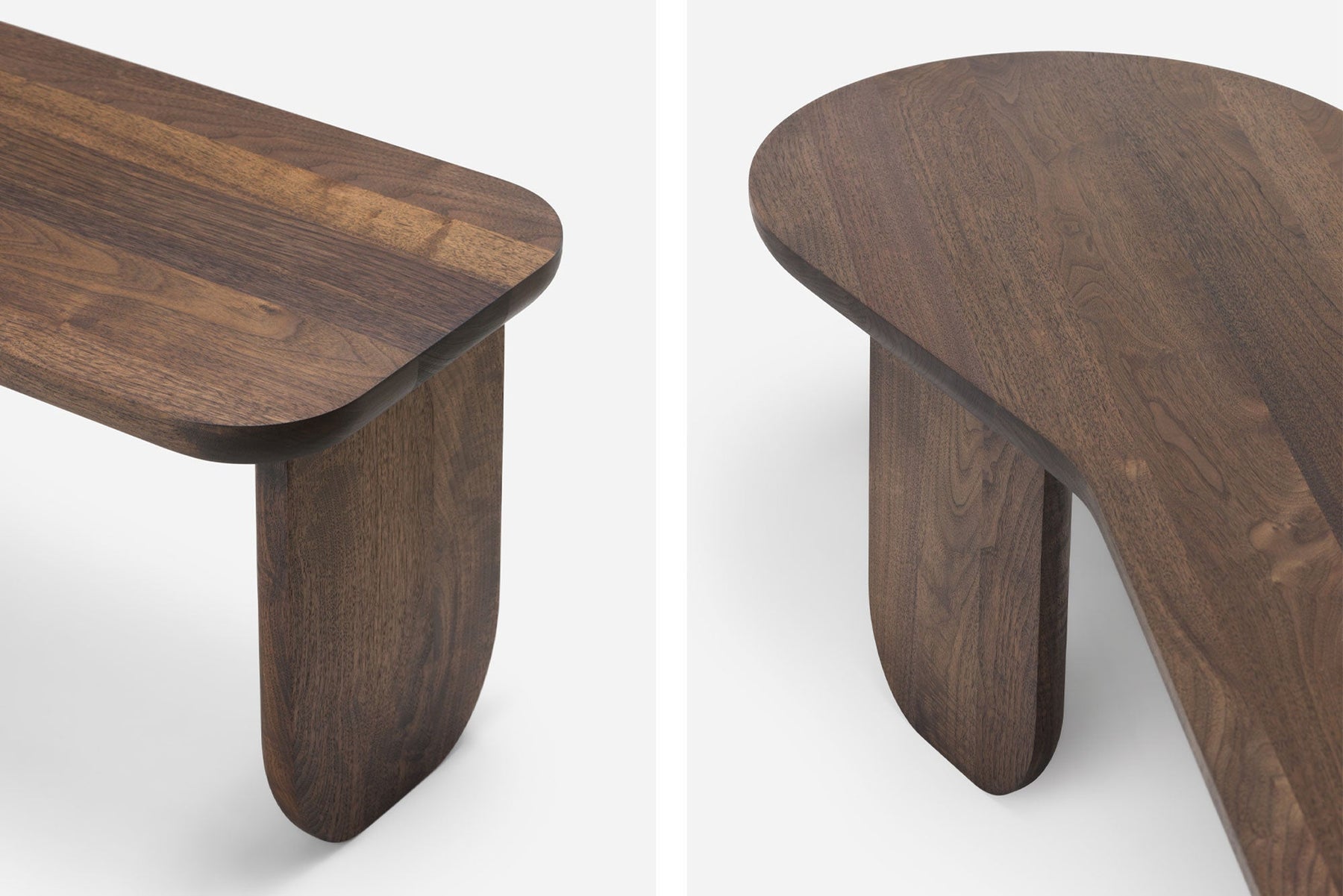 Kim Bench, crafted in solid wood, has an elegant yet expressive form that reimagines the design language of 1950s American furniture. This multi-functional piece, available in a left or right hand orientation, works well as a low bench, display shelf, or coffee table. Part of a family of nesting pieces including a coffee table and side table.