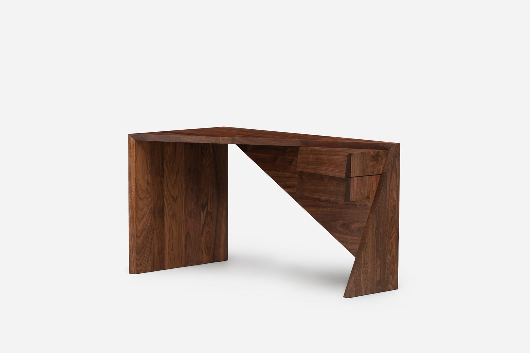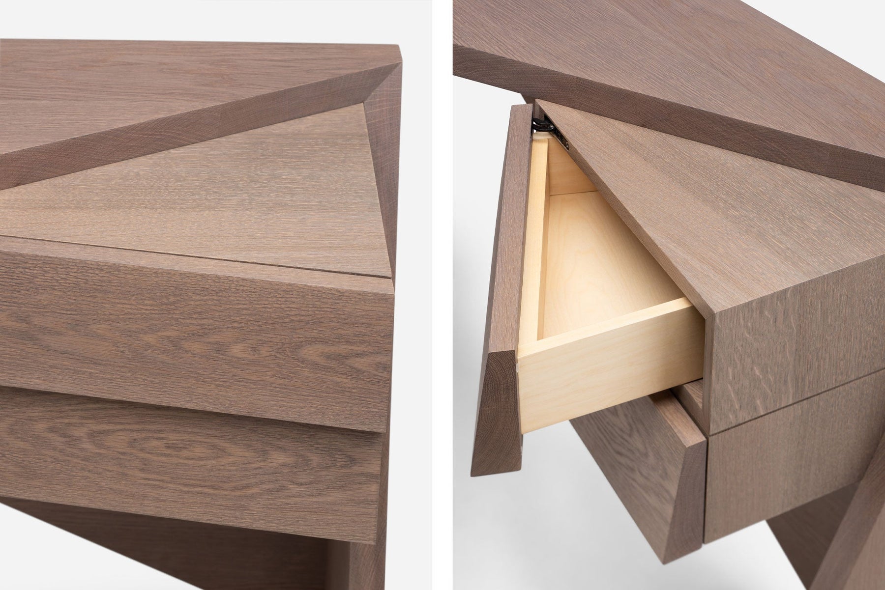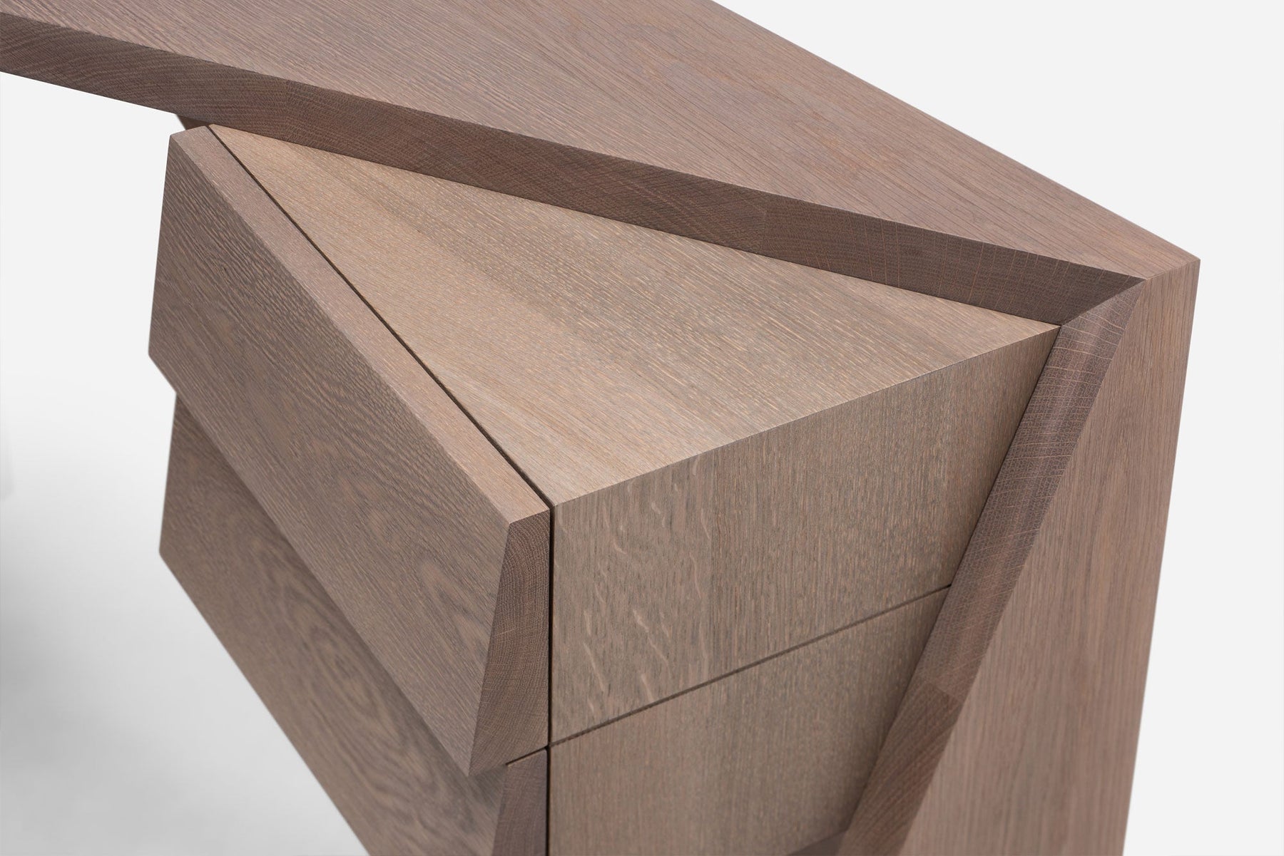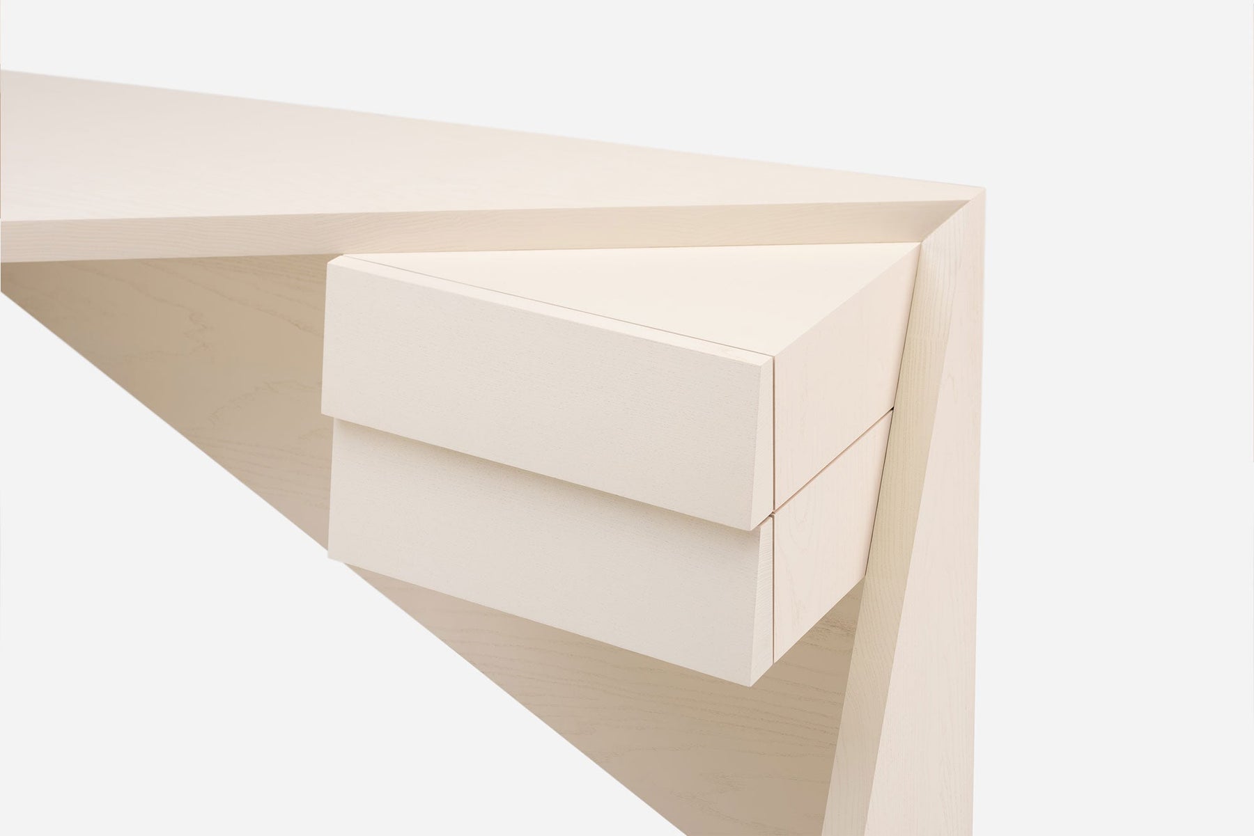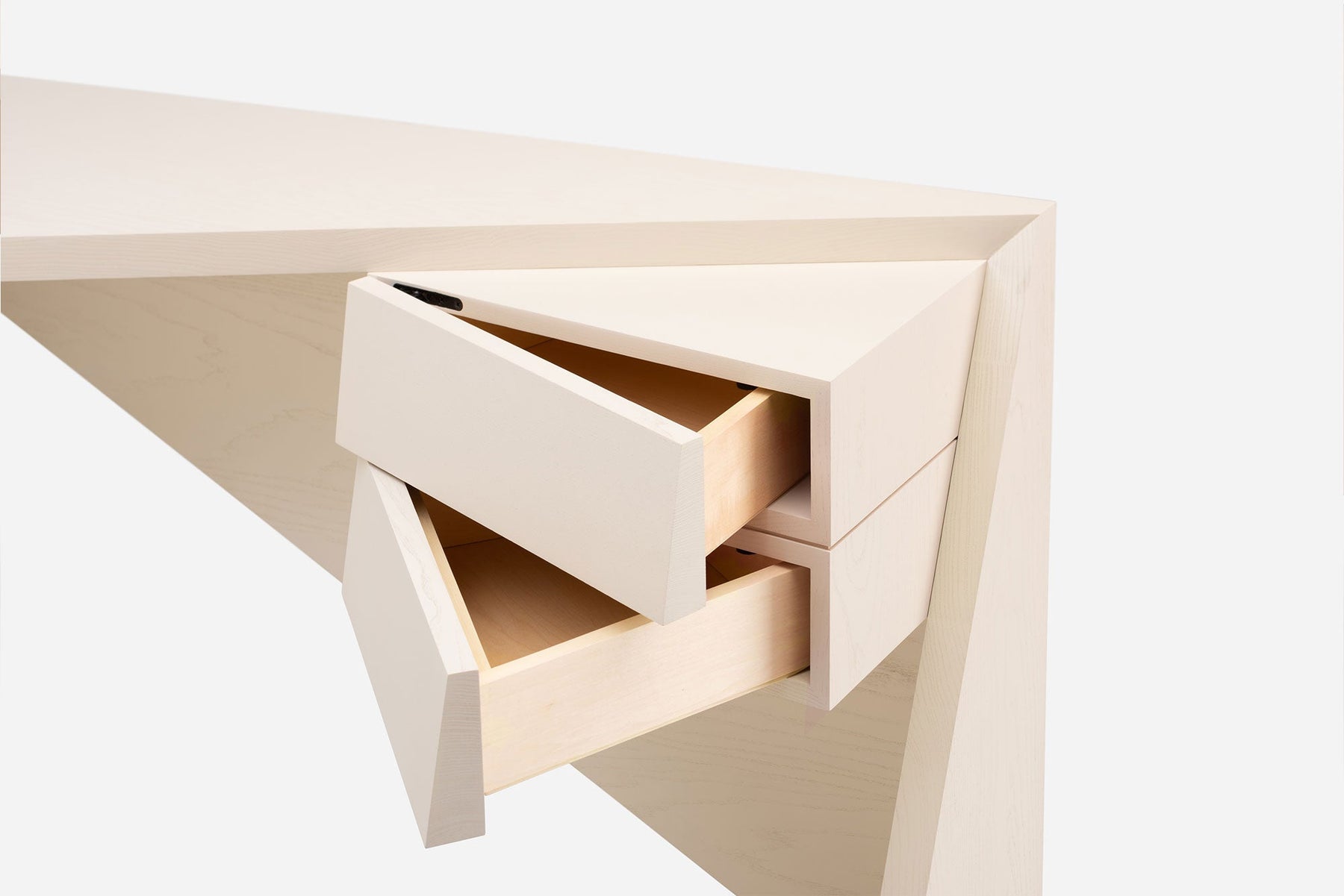 Appearing to defy gravity, Deneb has a striking form that challenges traditional notions of desk design, embracing an innovative triangular motif that evokes a sense of energy and movement in a functional piece. The playfulness of angles and lines reflects a deliberate intention to infuse life and excitement into this typology of furniture. The desk can be specified as a left or right hand orientation, according to the placement of the two drawers. It pairs well with the Altair Chair or the Vega Chairs.