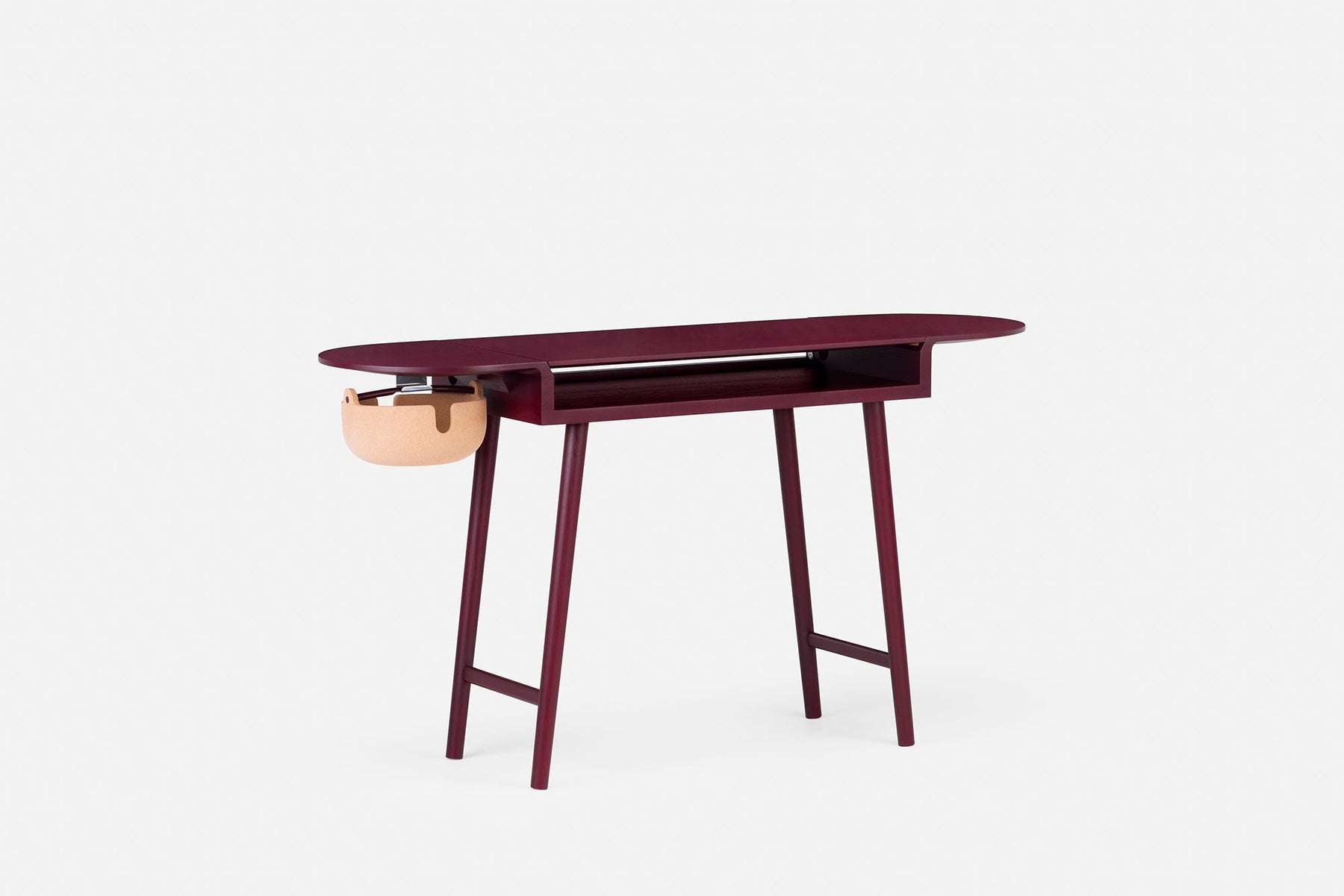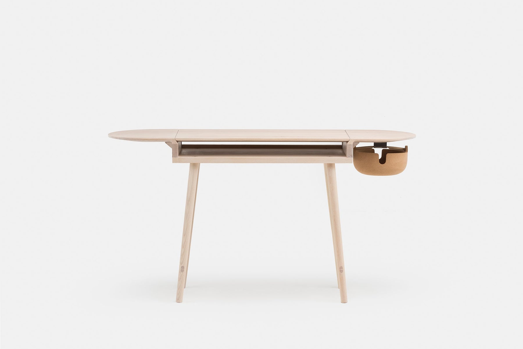 The cork bowl has a cutout on either side for a comfortable grip when handling, and for wire management. Wire management holes are also located on the left and right hand sides of the fixed tabletop. This tabletop is punctuated by the wedge tenon joint where the leg intersects the surface.