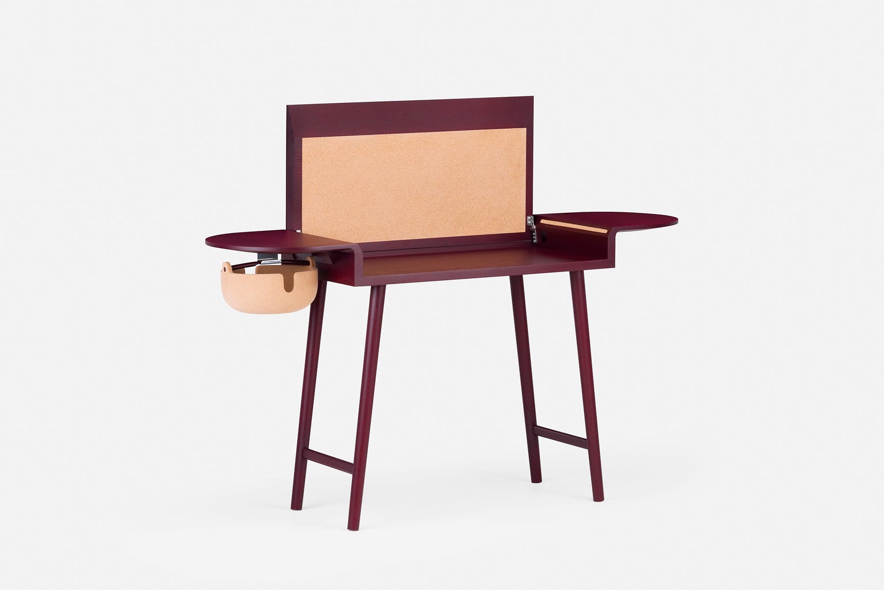 Companions Writing Desk is a solid wood desk with a removable cork bowl for wires and plugs, and a top that can close to hide away papers and laptops. Cork lines the underside of the hinged tabletop to keep one's most important notes within sight. The narrow frame of the desk allows it to tuck neatly into any corner of the home.