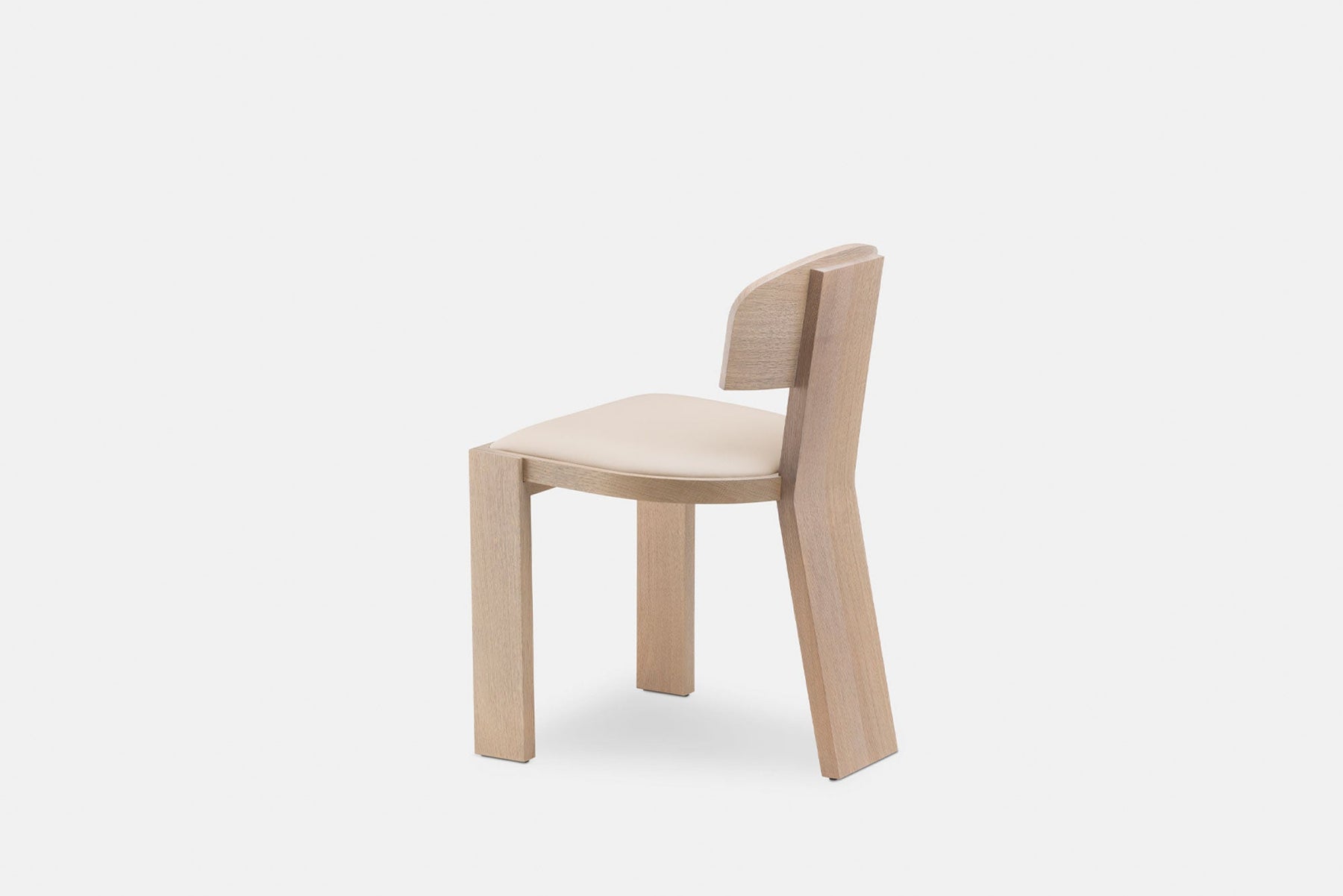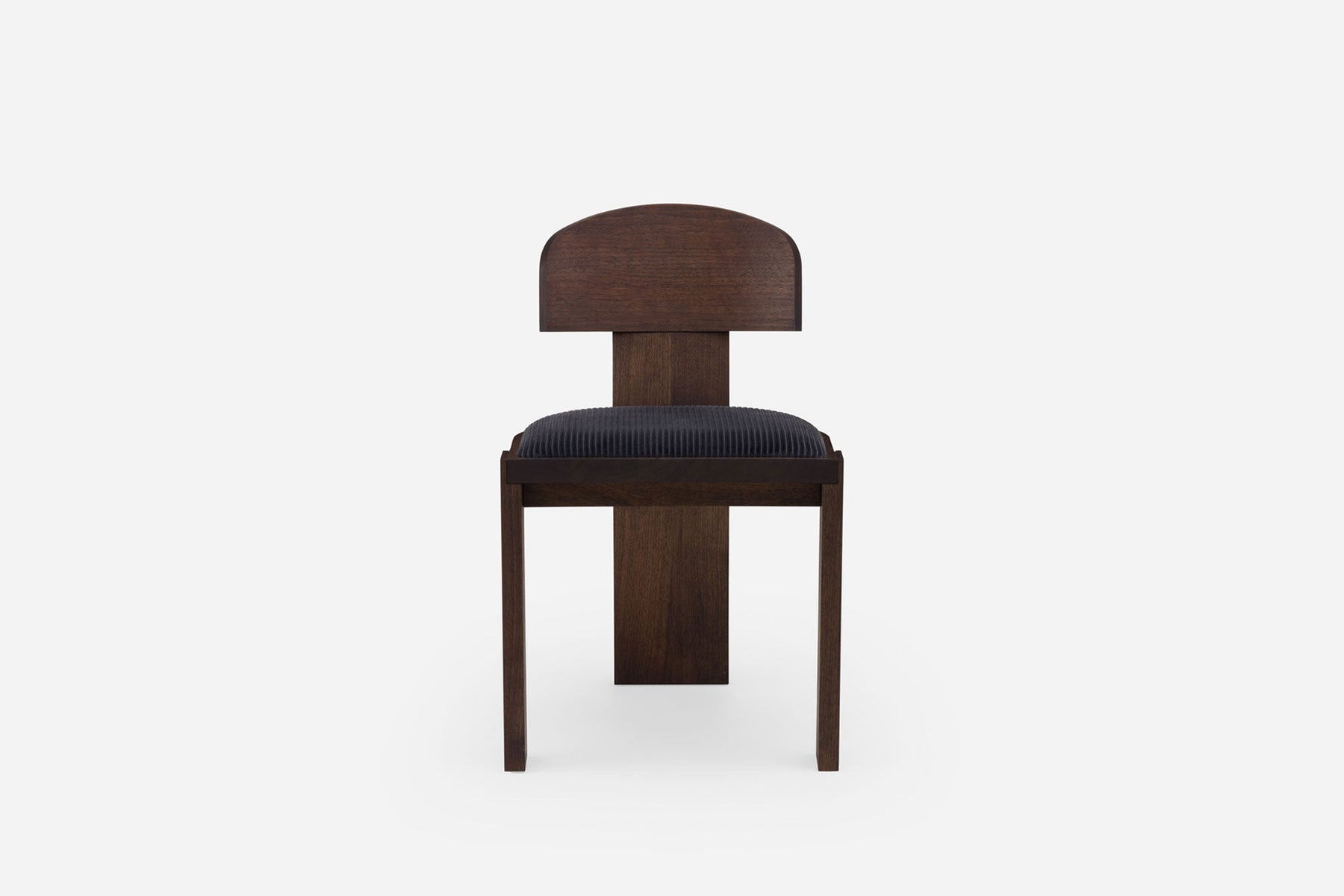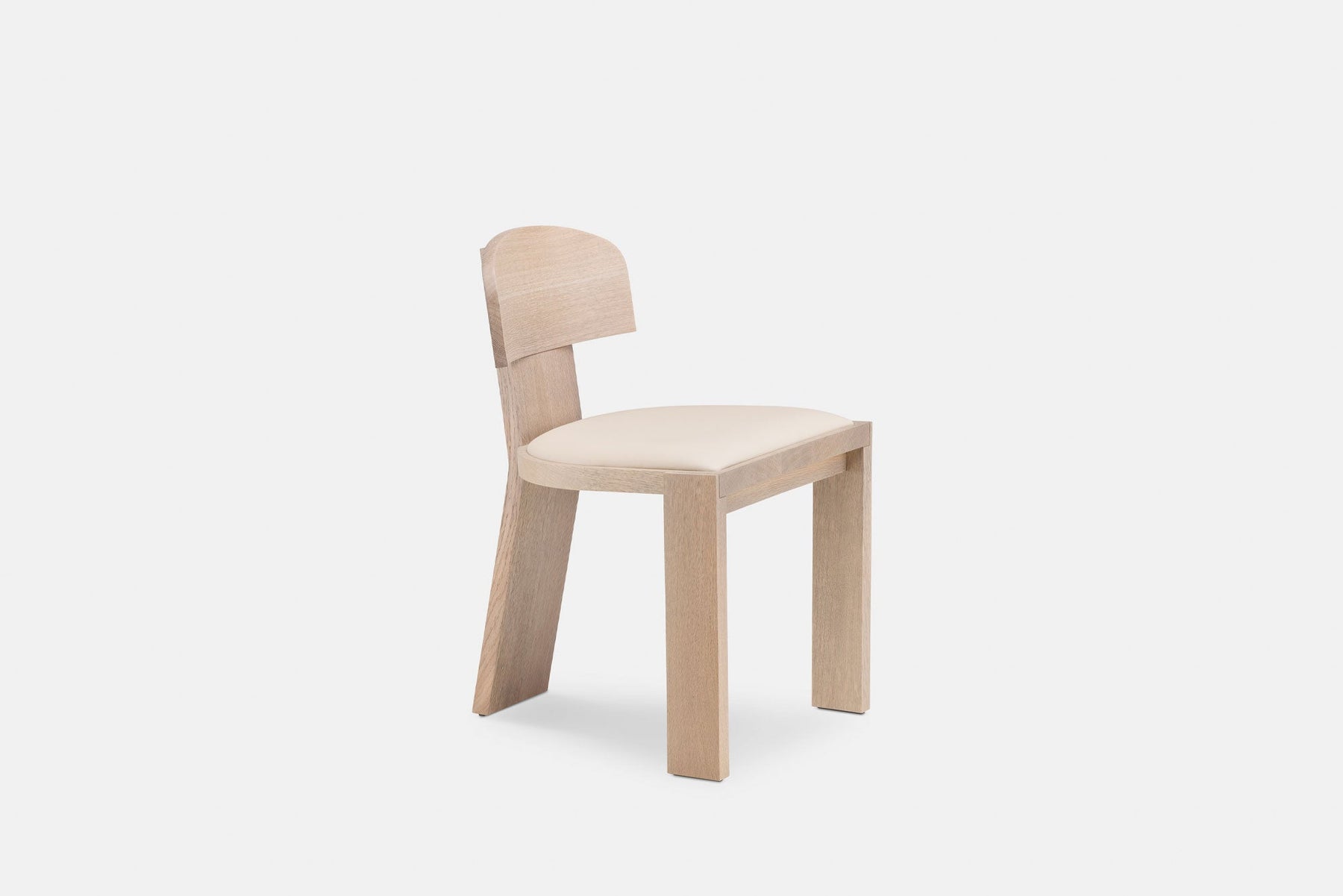 Vega chairs are named after the North Star of the Past and the Futures. Sculptural and totemic in shape, the three-legged chairs designed by Anthony Guerrée are crafted in solid timber and feature an upholstered seat. The imposing appearance contrasts with the delicate curve of the crescent moon backrest. In a playful game of opposites, Vega A and Vega B can be differentiated by the orientation of their backrests.