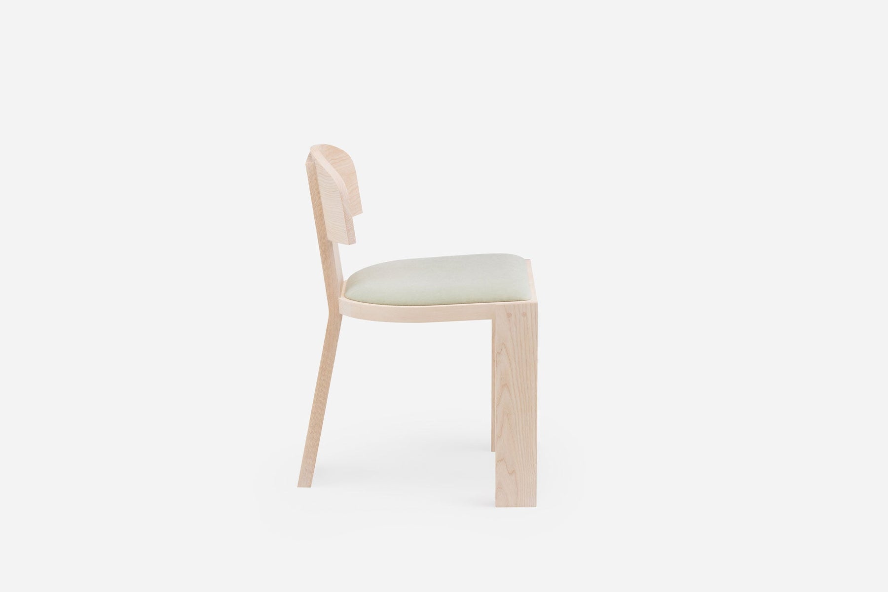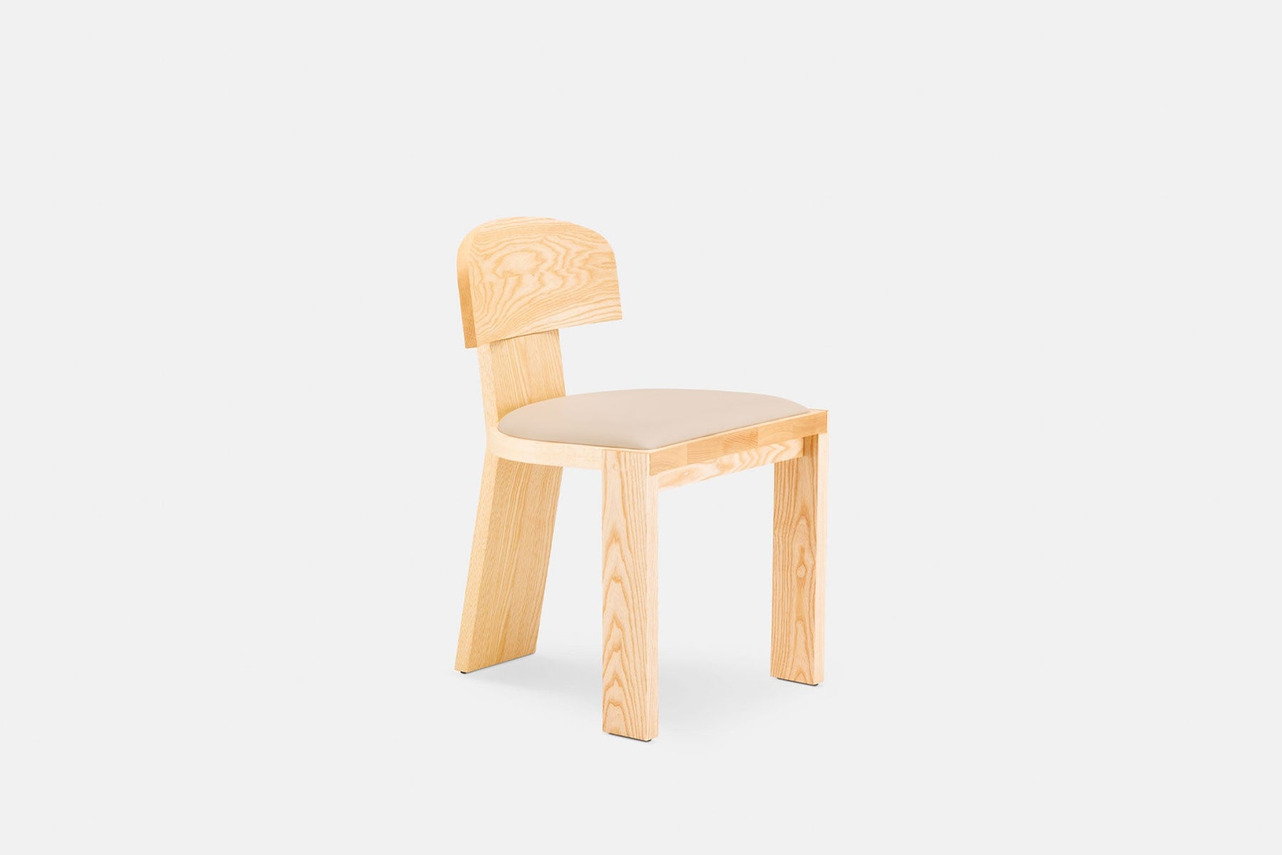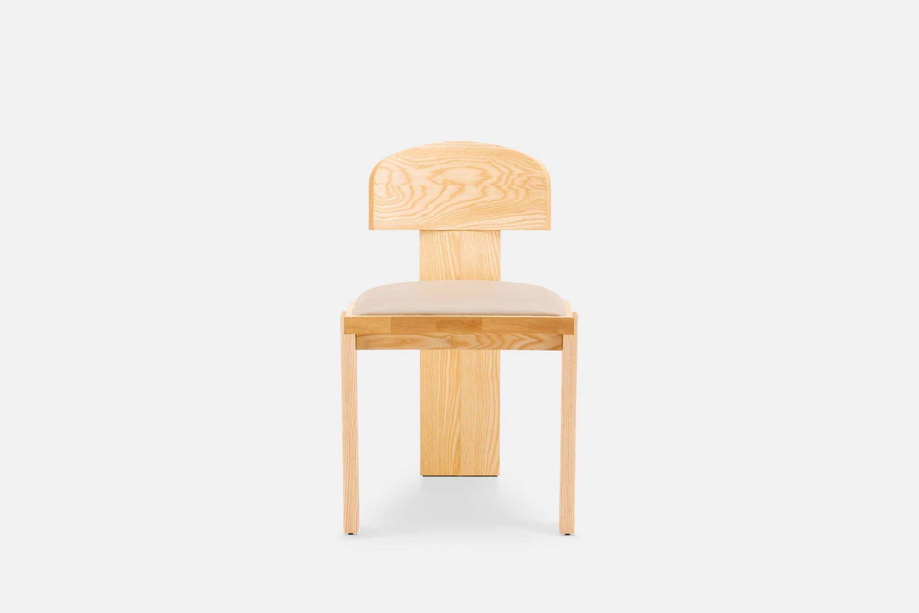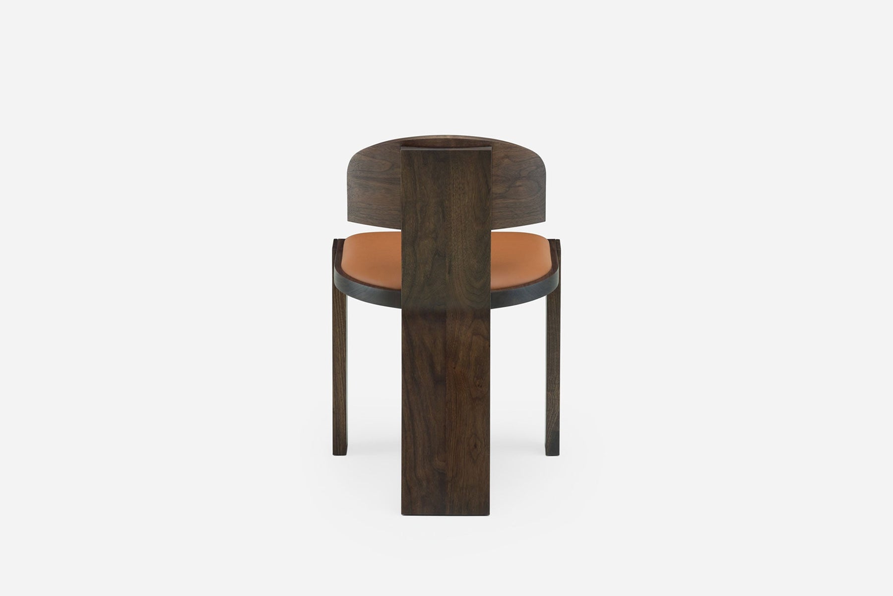 Vega chairs are named after the North Star of the Past and the Futures. Sculptural and totemic in shape, the three-legged chairs designed by Anthony Guerrée are crafted in solid timber and feature an upholstered seat. The imposing appearance contrasts with the delicate curve of the crescent moon backrest. In a playful game of opposites, Vega A and Vega B can be differentiated by the orientation of their backrests.