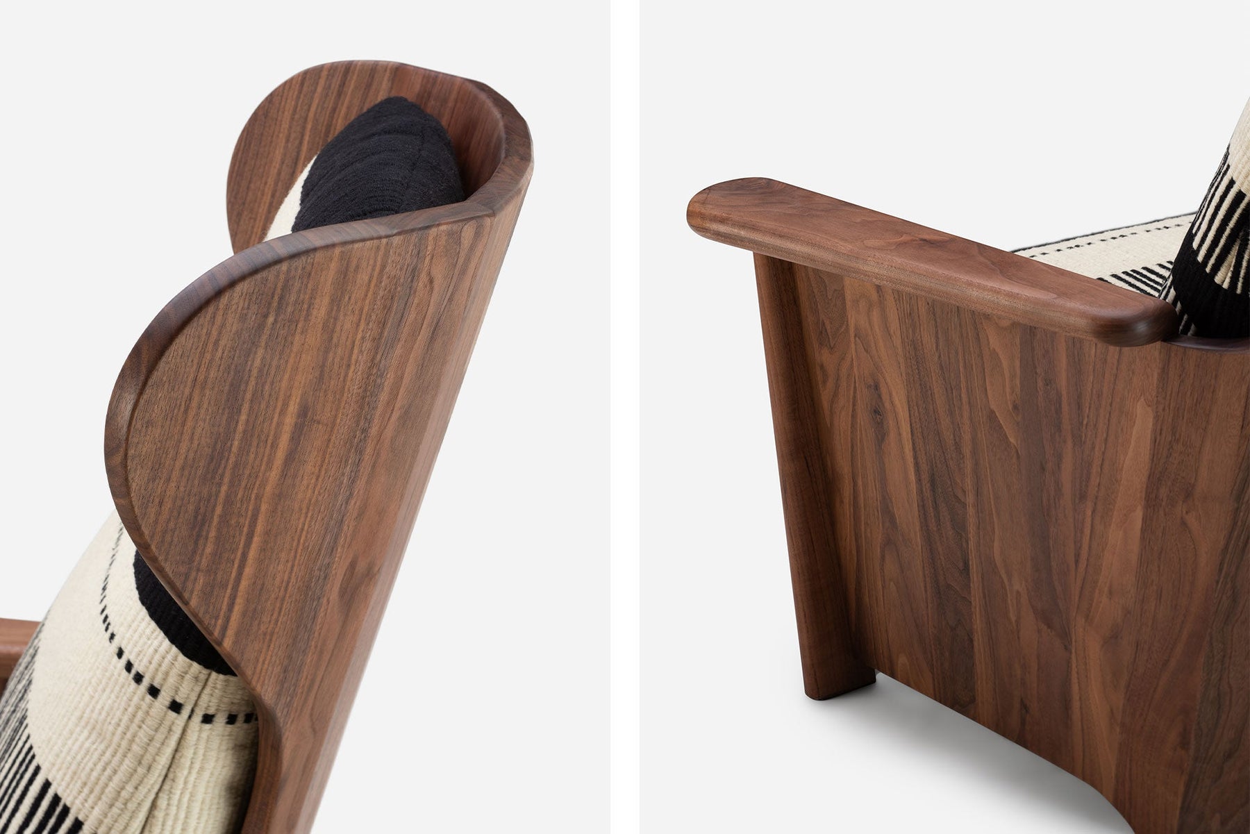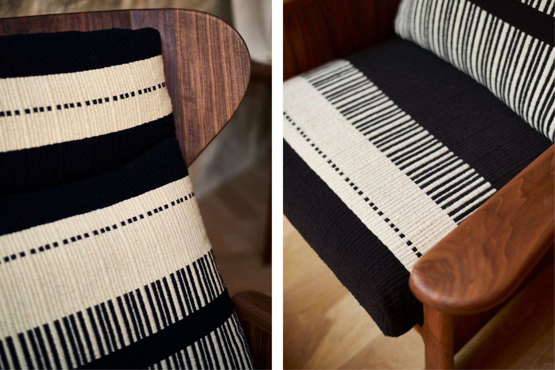 Available in black walnut, white oak, or ash in a range of finishes. Upholstered in Manta Lido, a hand woven traditional blanket from the Alentejo region of Portugal. See menus below for further material information.