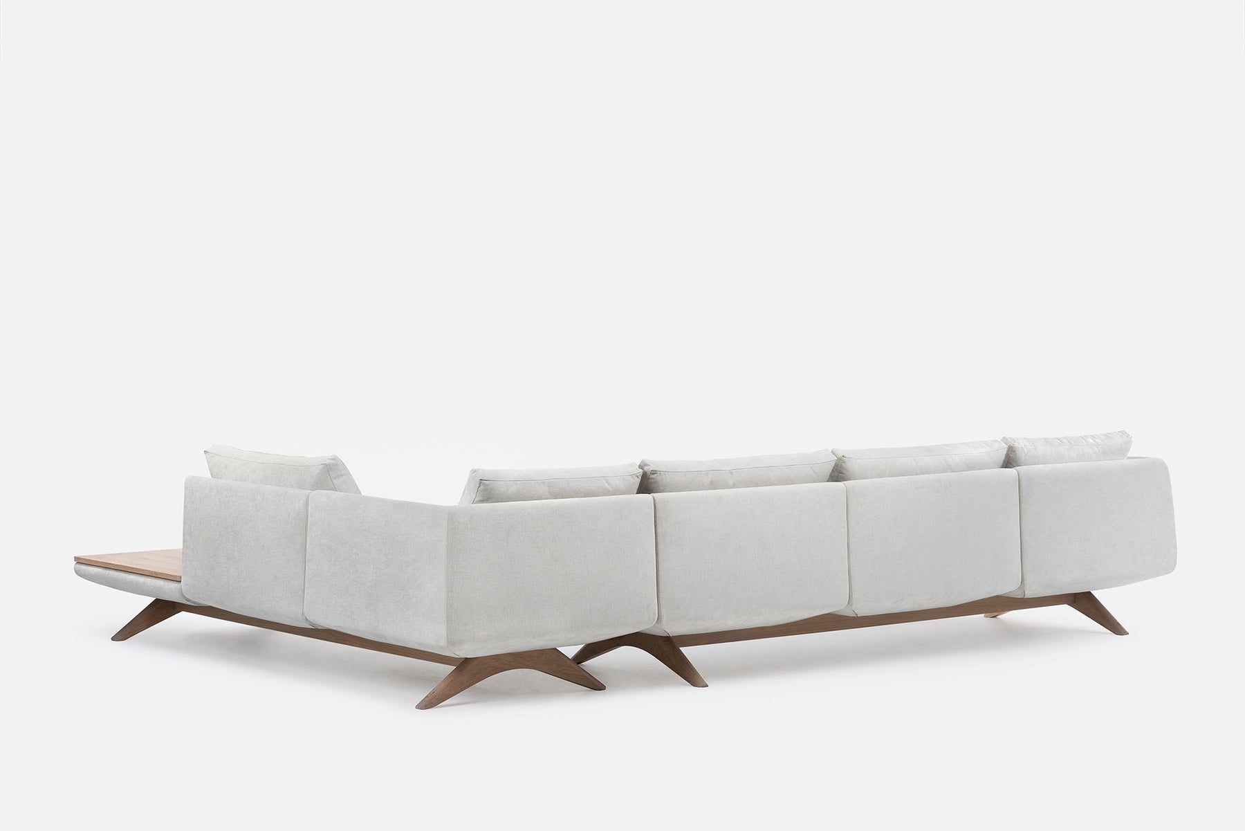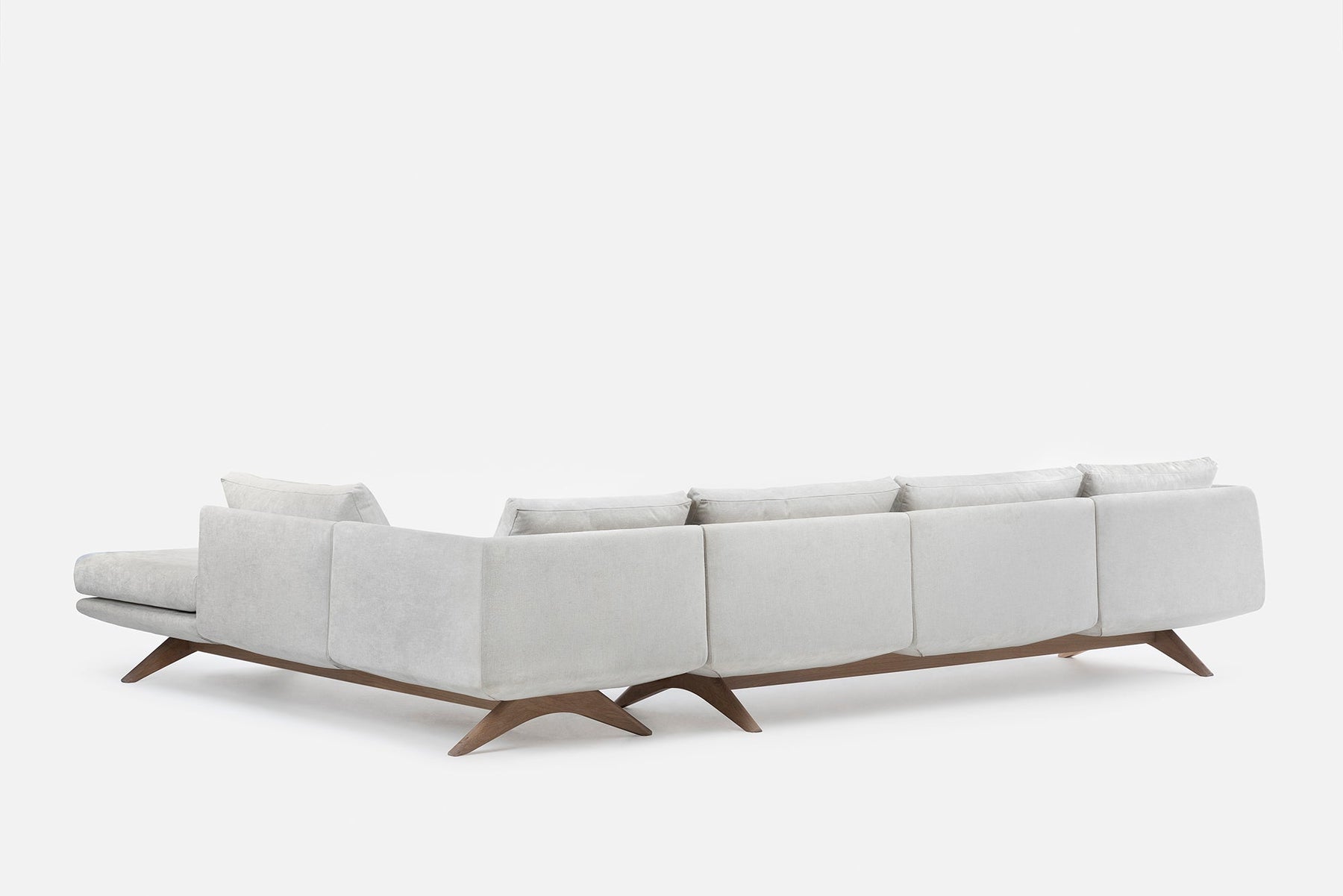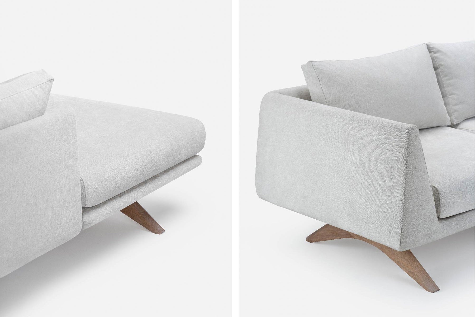 Hepburn is glamorous and light, with a tapered arm and a shallow base raised on slender solid wood legs, and an optional cross detail on the cushions. Almost limitless configurations are possible, with a choice of 4 key modules — corner, seat with backrest, ottoman, and coffee table — attaching to a central beam/leg frame designed to fit one, two, or three modules.
