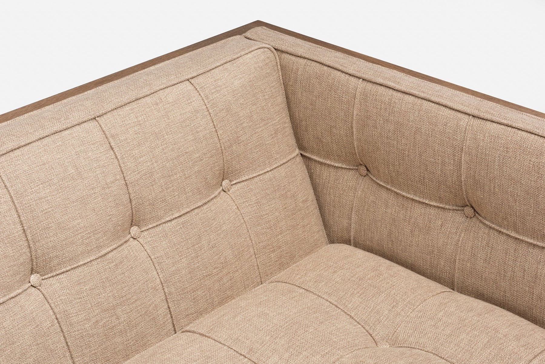 Box Sofa, inspired by the 1950s' modernist movement, has the pure shape of a box. The inner face of the solid wood form offers refined comfort with crisp upholstery and classic tuft detailing. The four supporting legs appear to be impossibly slender, creating a stunning profile.