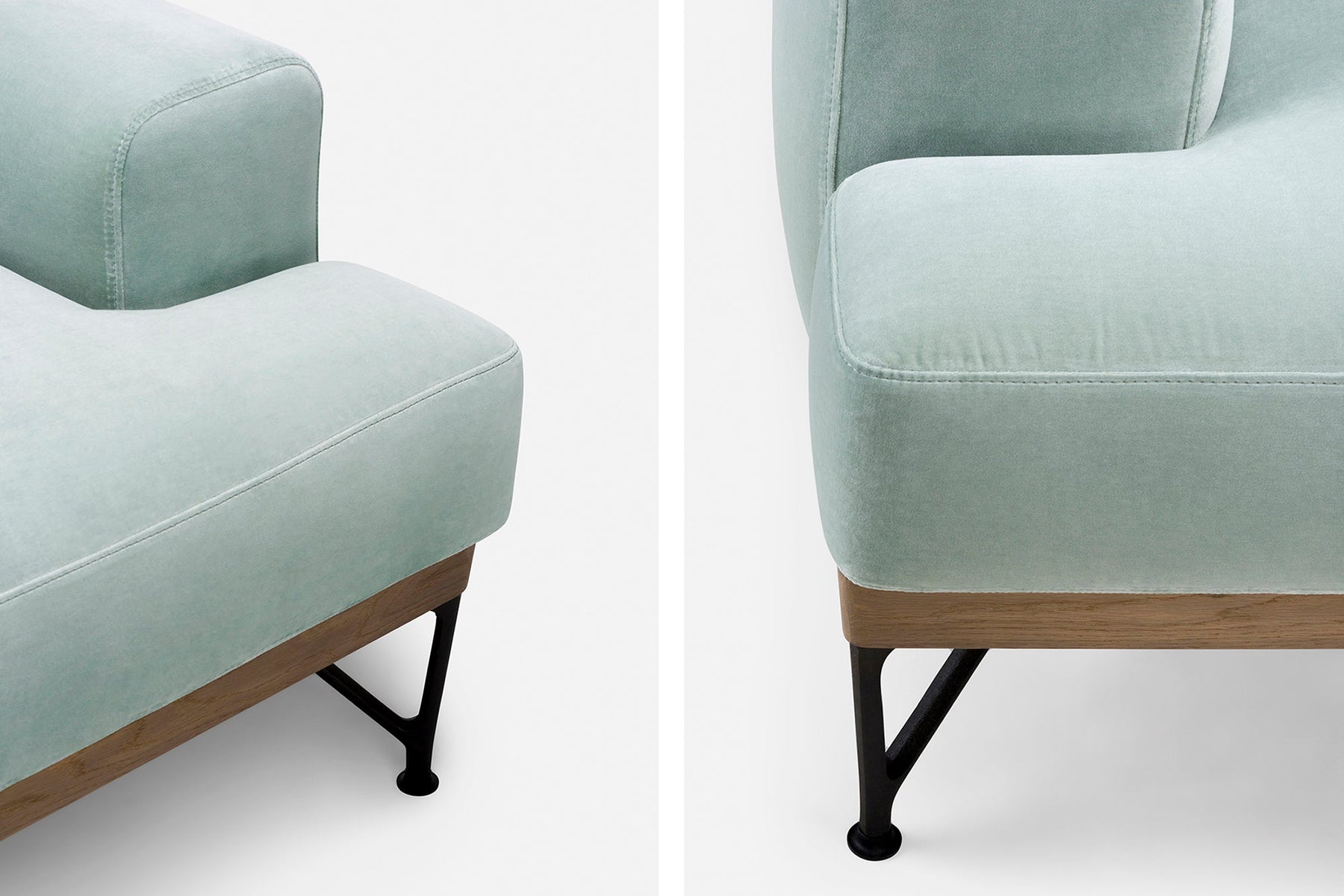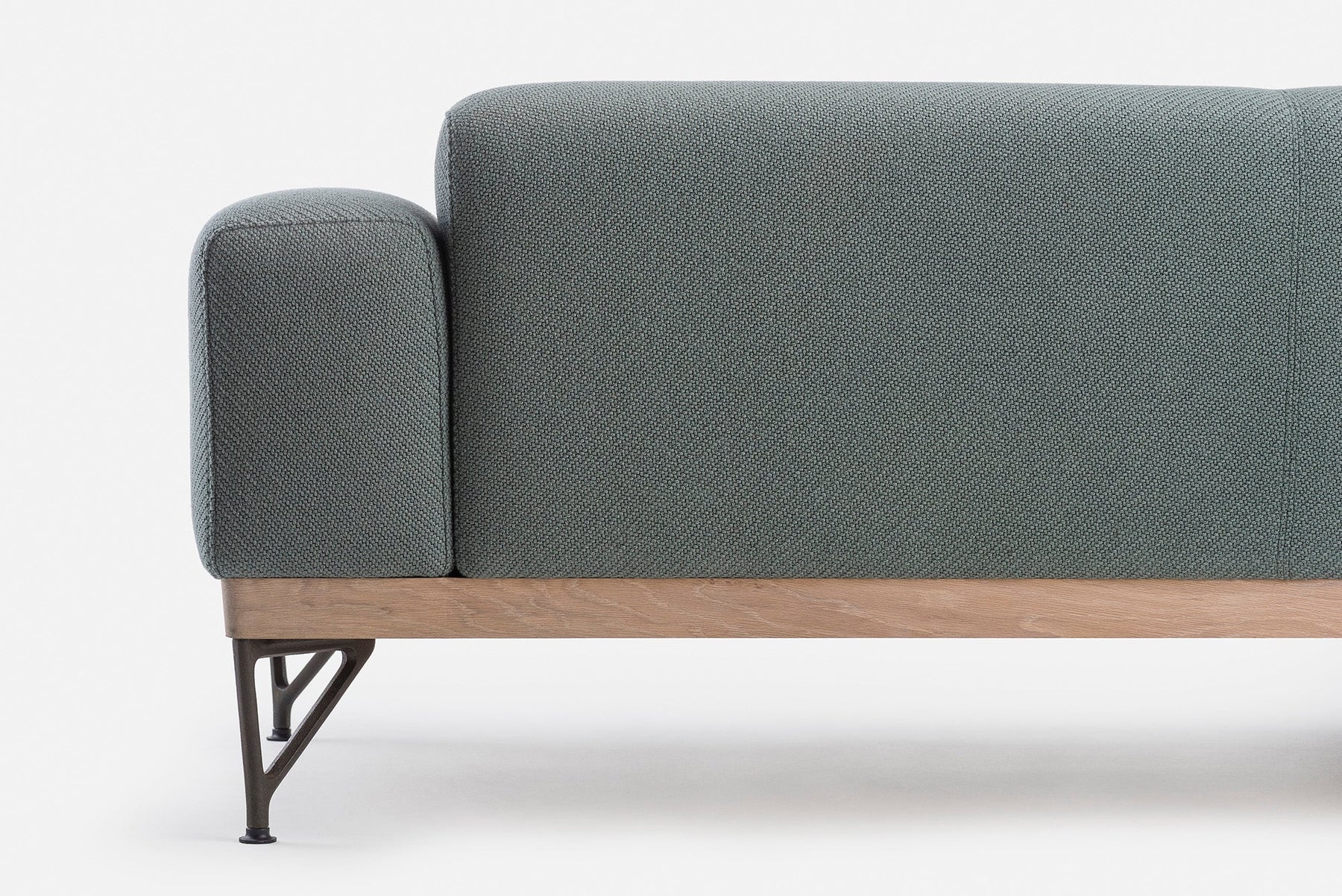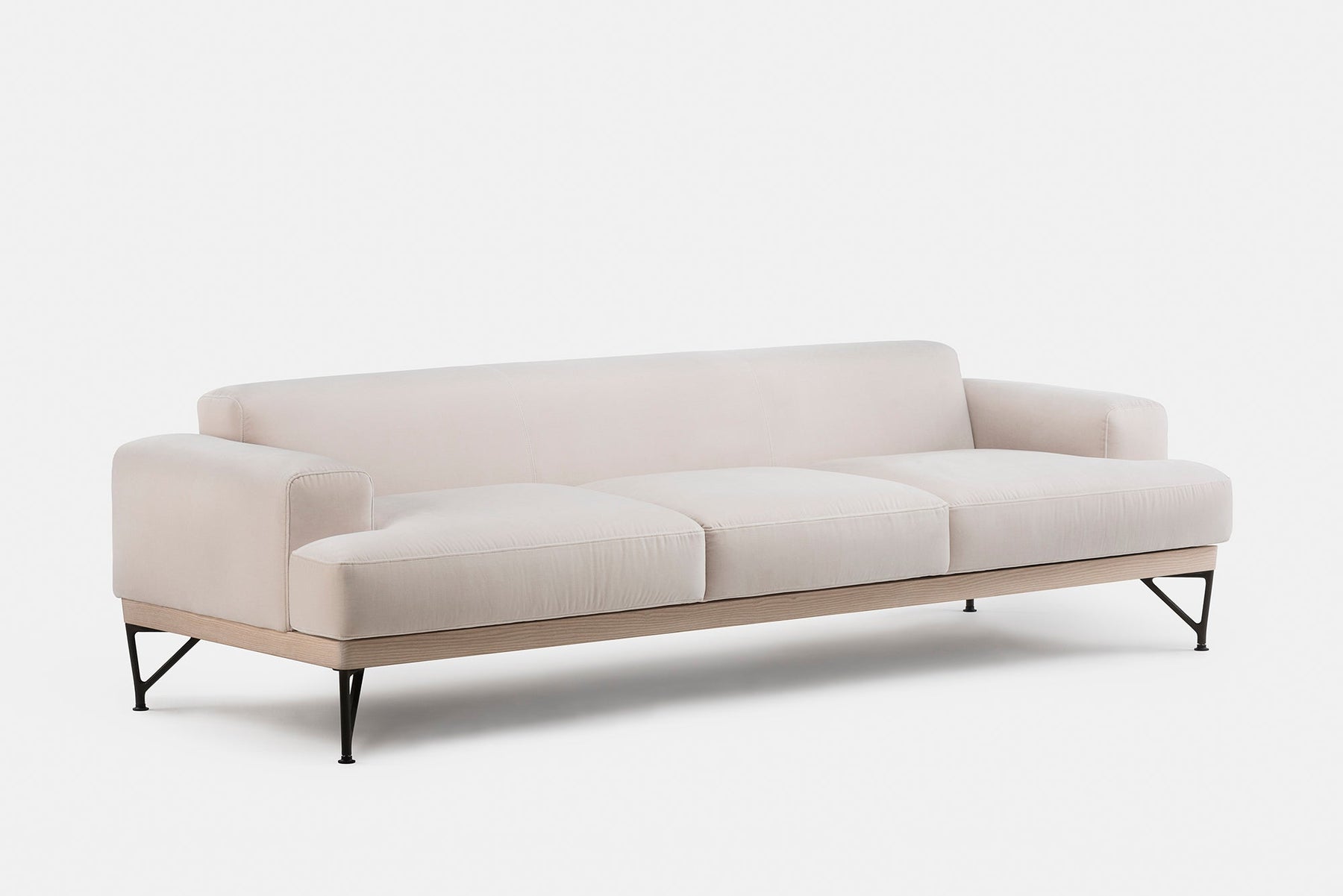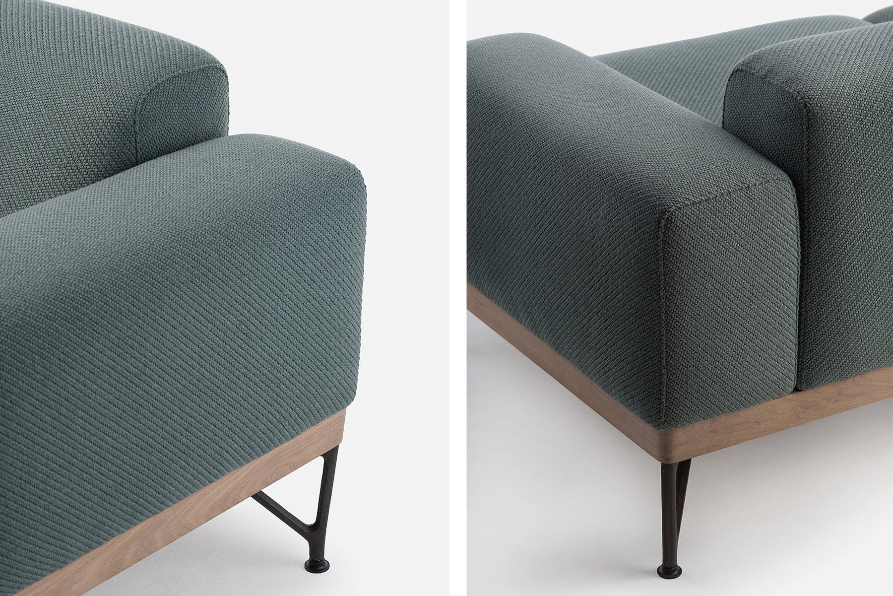 Armstrong sofa is a cool and brooding design with a low body and a base that subtly angles inward. Luxurious and robust, the sofa has refined upholstery resting upon an exposed timber frame and cast iron legs. Part of a family of furniture including an armchair and coffee table.