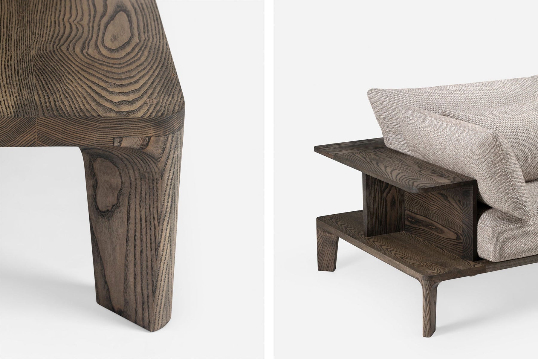 Available in black walnut, white oak, or ash in a range of finishes, and a range of fabric and leather options. See menus below for further material information.