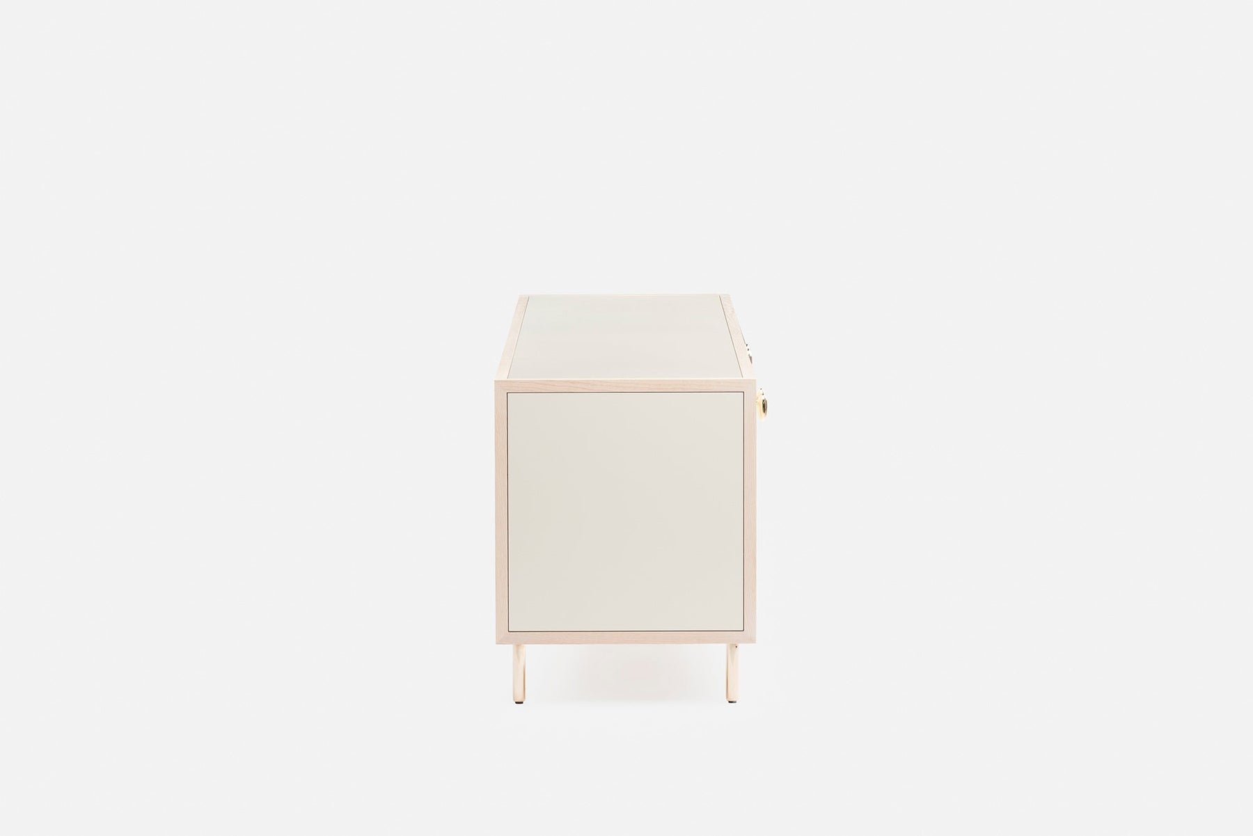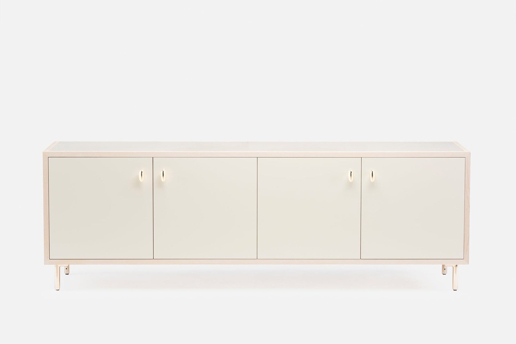 Inspired by the juxtaposition of old and new design seen in converted Brooklyn brownstones, Classon Sideboard is modern with historical references. Polished brass door pulls and legs elegantly complement the cabinet body available in painted hdf and a range of timbers and finishes.