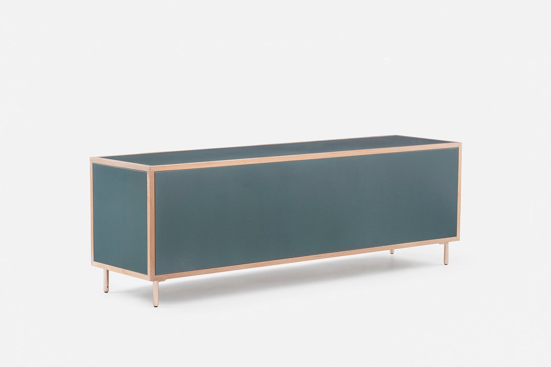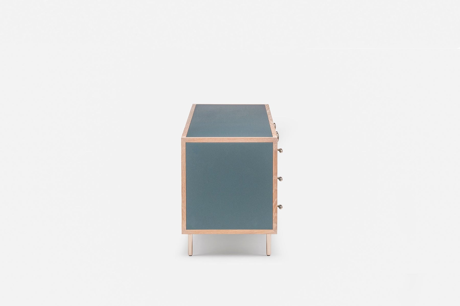 Available in black walnut, white oak, or ash in a range of finishes; with painted HDF in a choice of our full range of colours with a satin matte or gloss finish. Legs, door pulls, and drawer pulls in polished brass. See menus below for further material information.