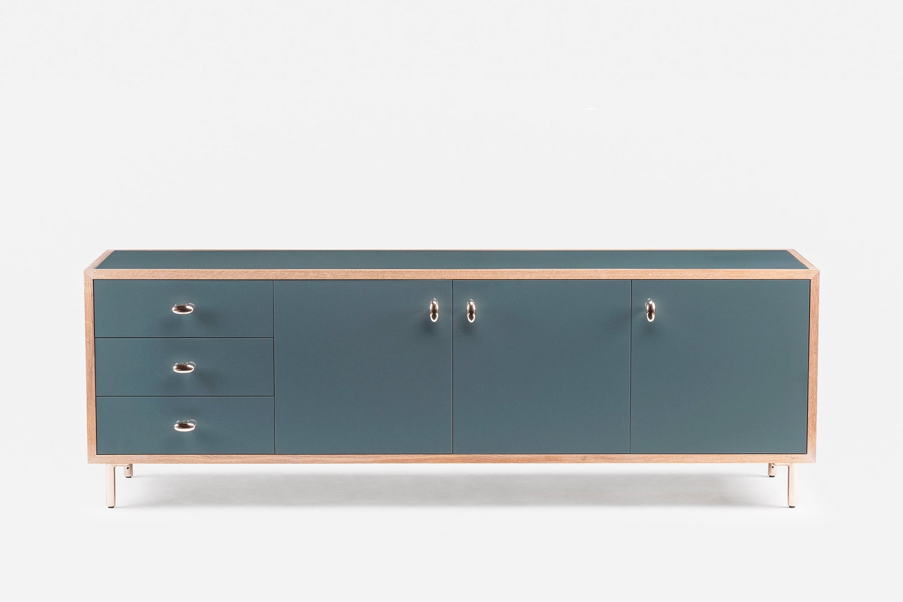 Inspired by the juxtaposition of old and new design seen in converted Brooklyn brownstones, Classon Sideboard is modern with historical references. Polished brass drawer pulls, door pulls, and legs elegantly complement the cabinet body available in painted hdf and a range of timbers and finishes.