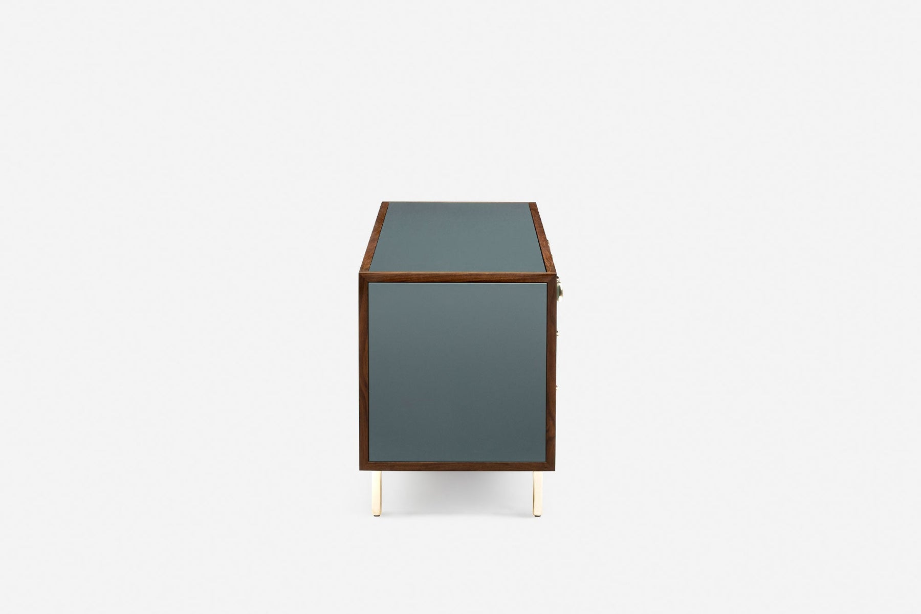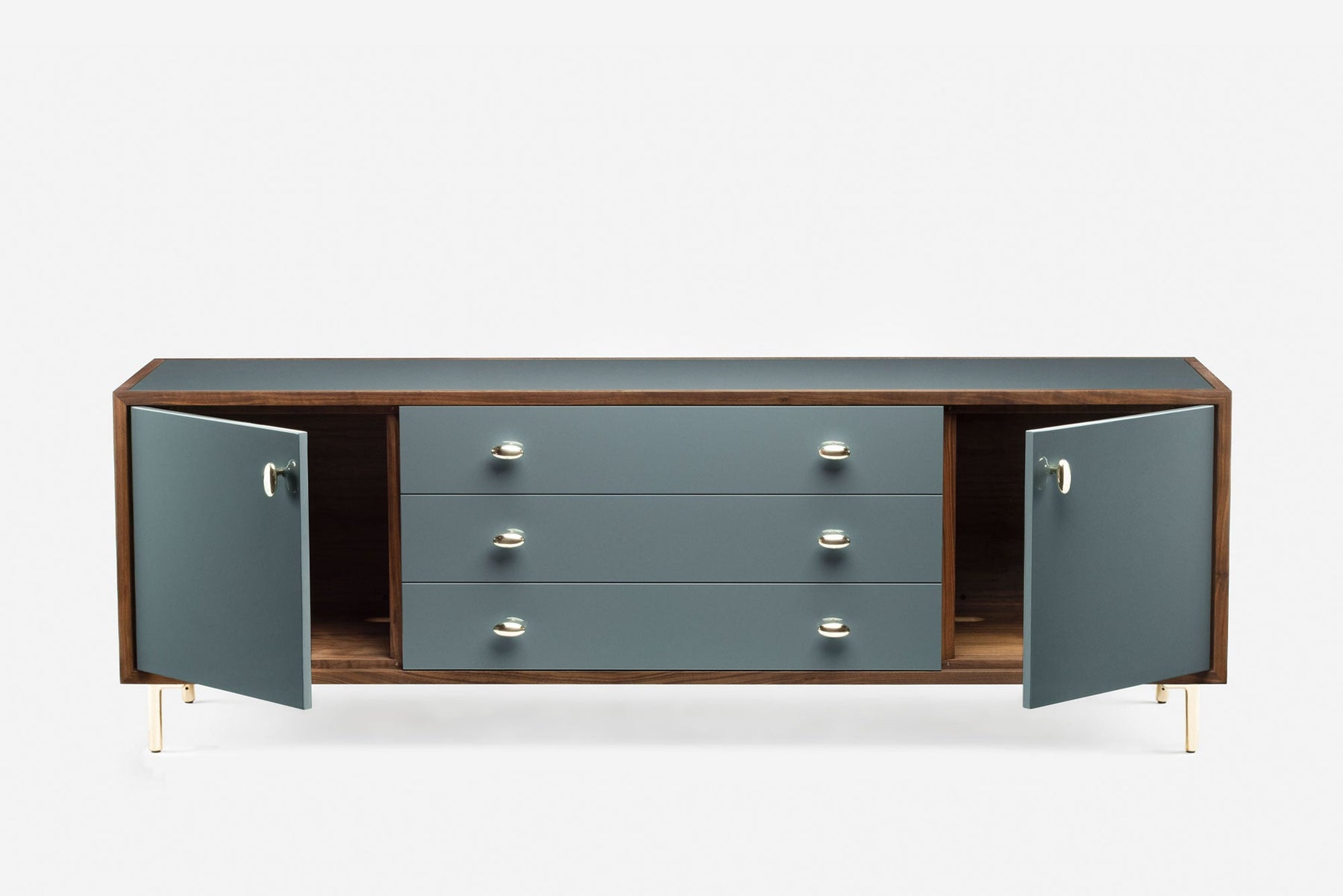 Inspired by the juxtaposition of old and new design seen in converted Brooklyn brownstones, Classon Sideboard is modern with historical references. Polished brass drawer pulls, door pulls, and legs elegantly complement the cabinet body available in painted hdf and a range of timbers and finishes.