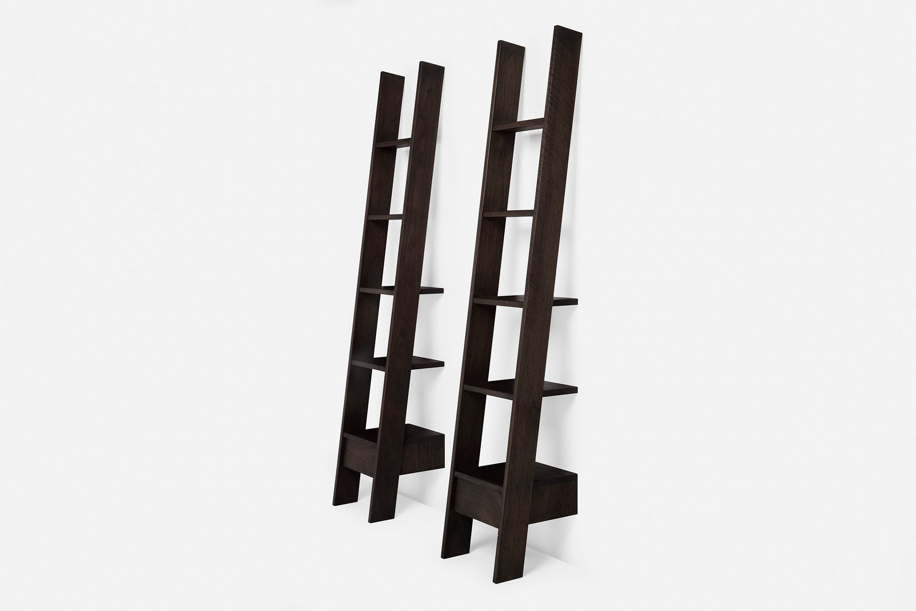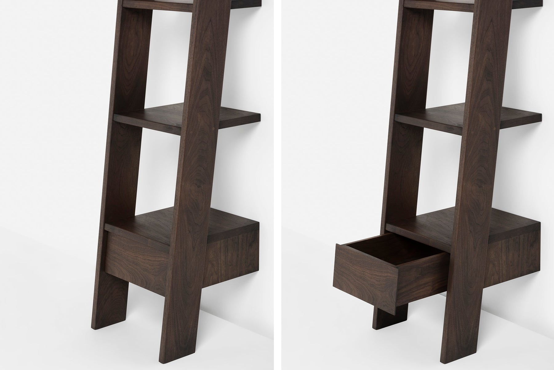 Ladder Bookcase offers generous storage with a relatively small footprint. Steps of varied depth meet the wall when placed at an angle. Shelves provide open display storage while a drawer on the lowest rung allows items to be tucked away. This statement piece is highly functional, and suitable for a variety of environments.