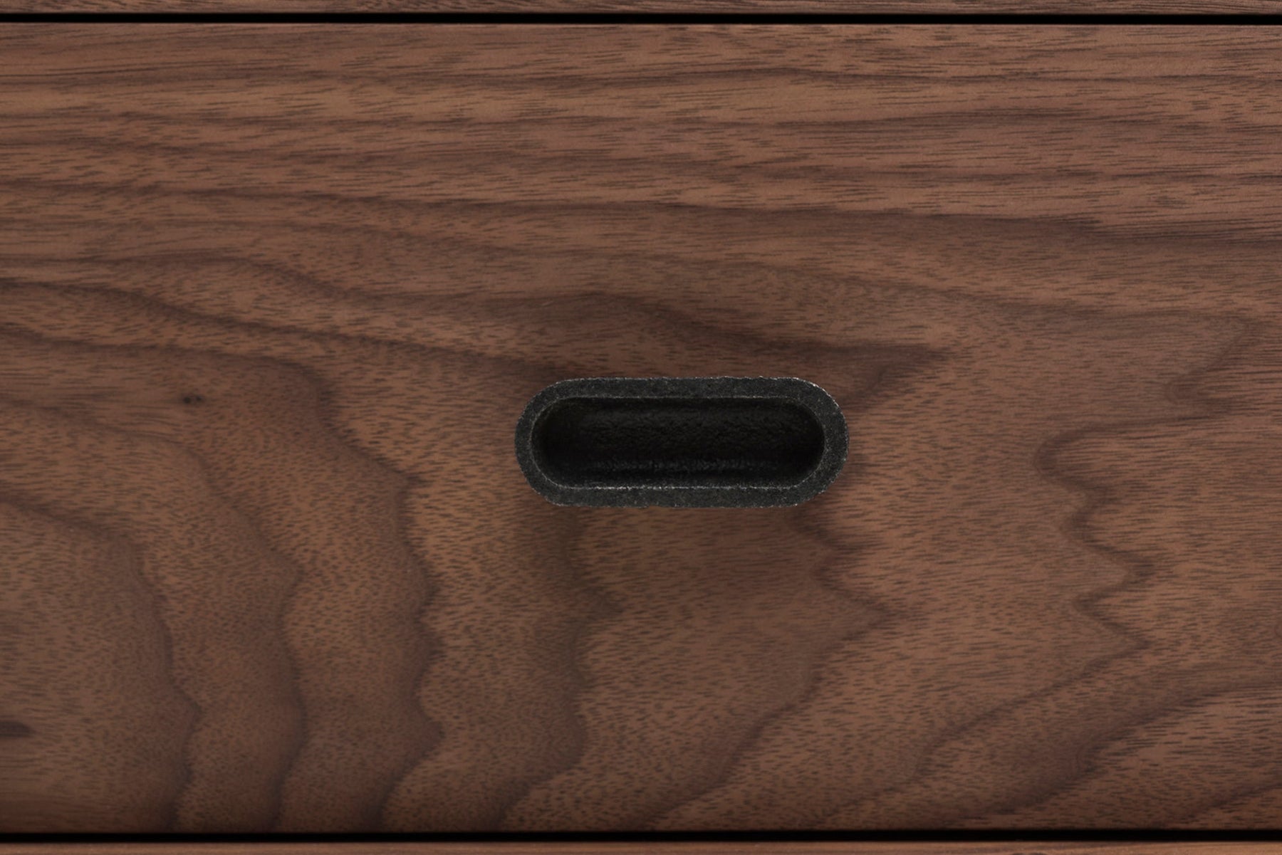 Available in black walnut, white oak, or ash in a range of finishes, with drawer handles and legs of cast iron. See menus below for further material information.