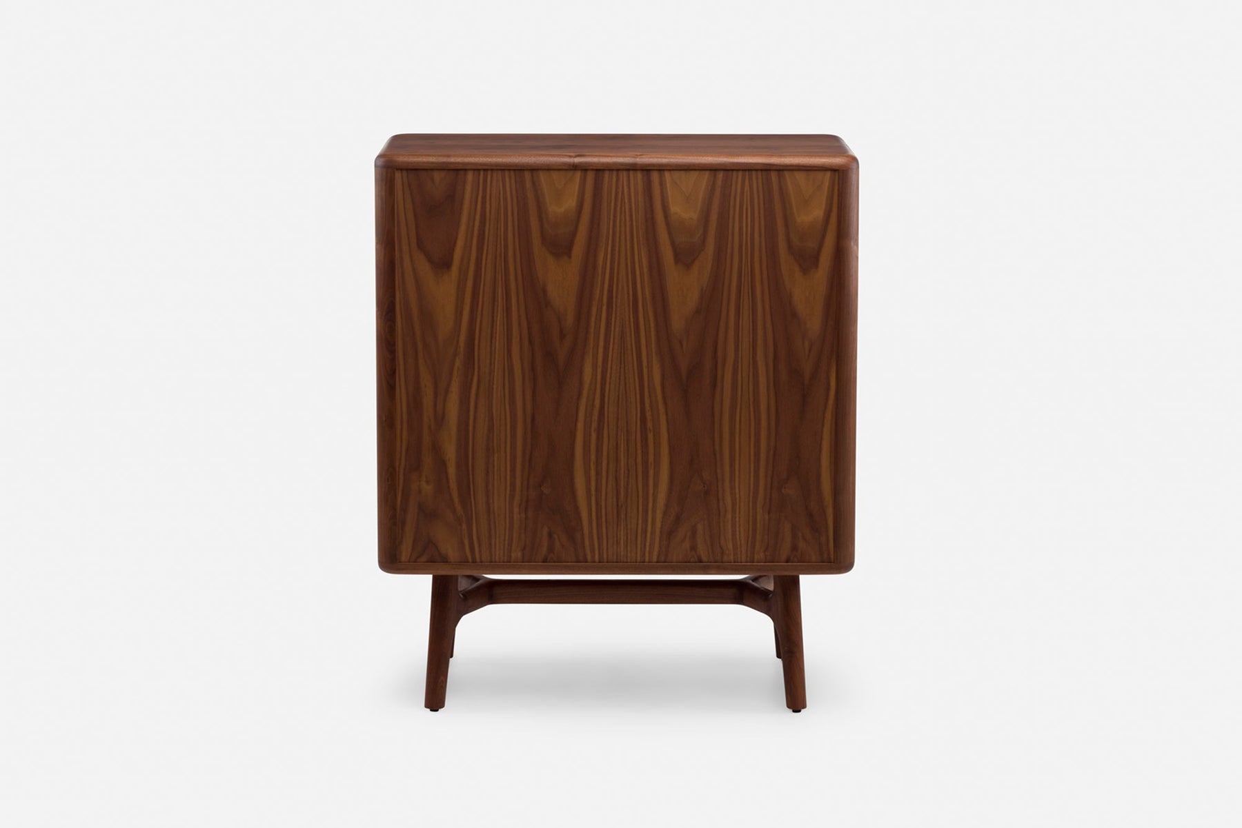 Available in black walnut, white oak, or ash in a range of finishes with brass door pulls. See menus below for further material information.