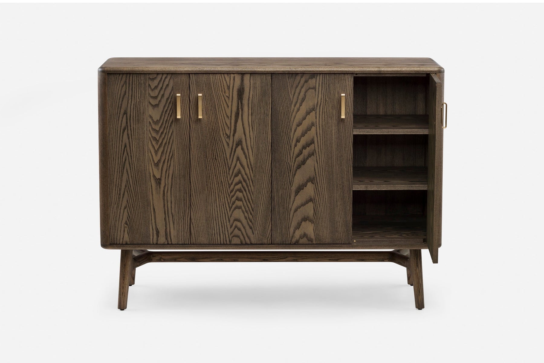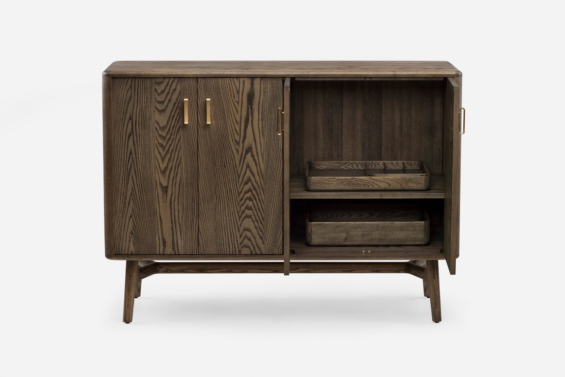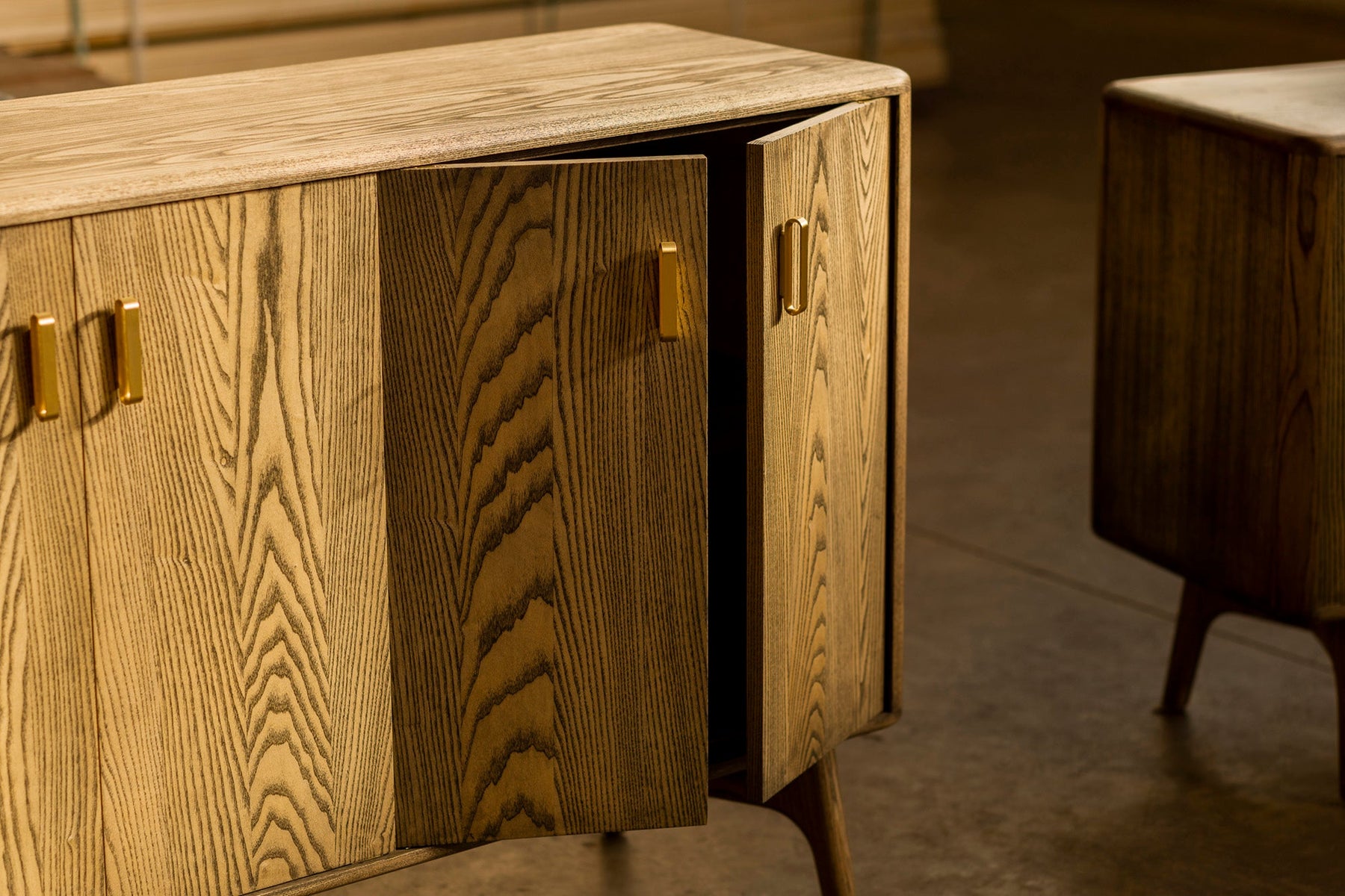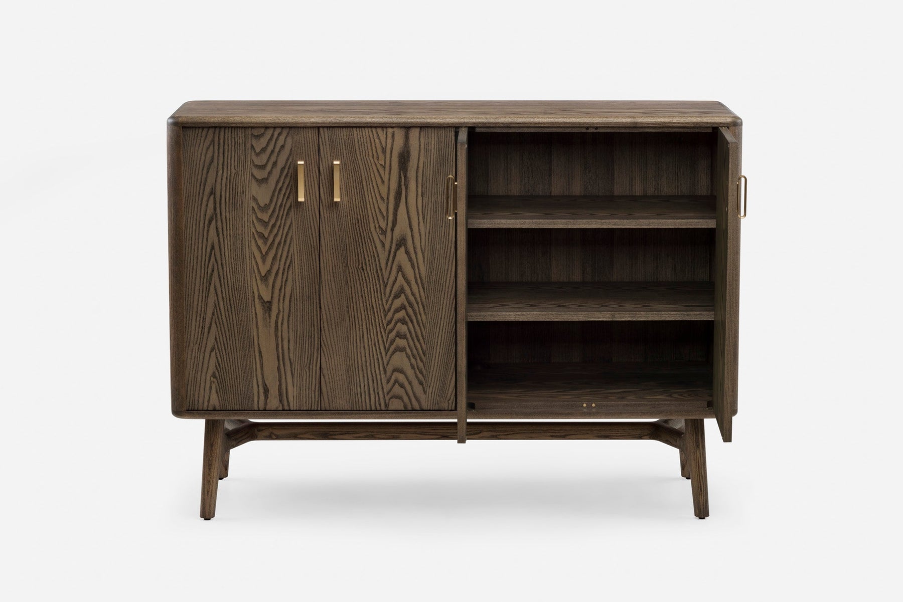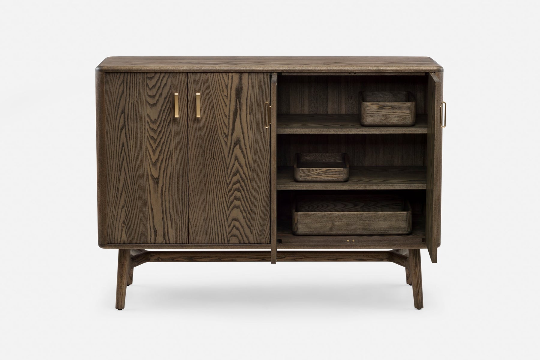 Available in black walnut, white oak, or ash in a range of finishes with brass door pulls. See menus below for further material information.