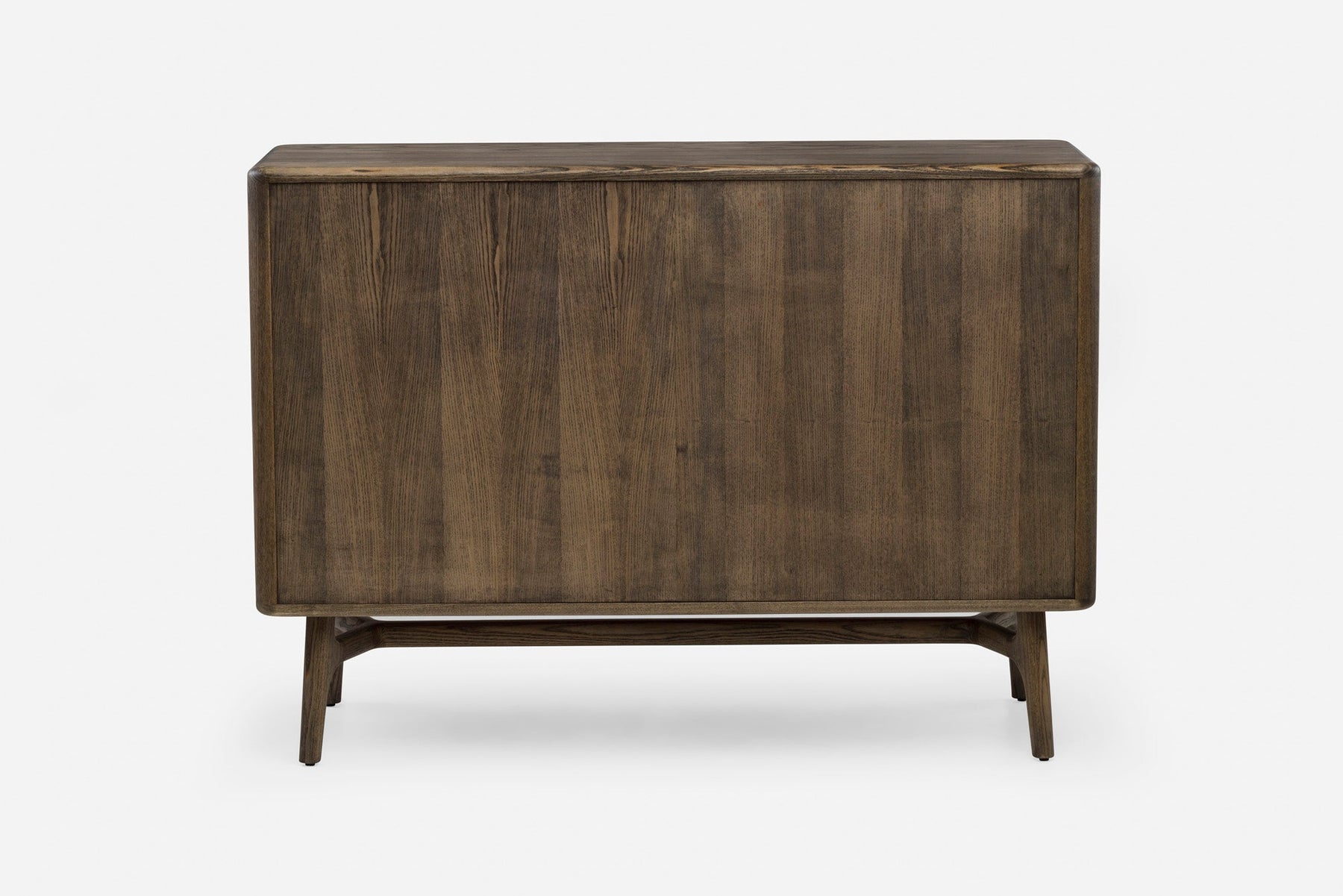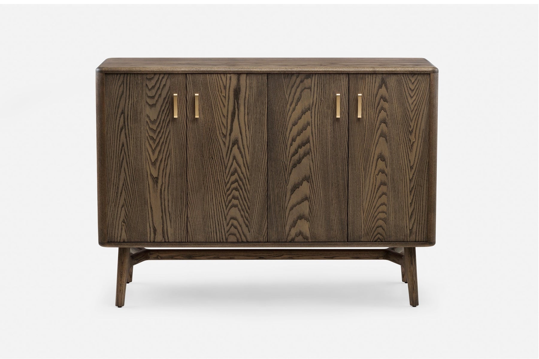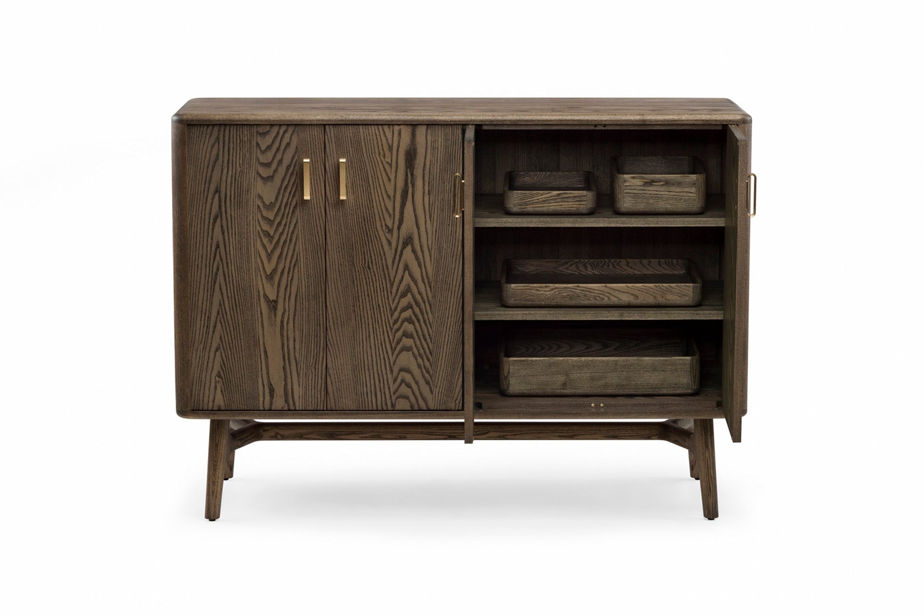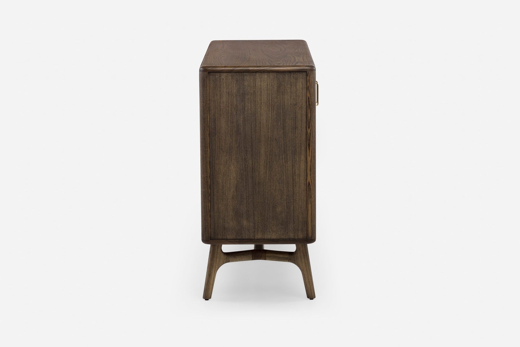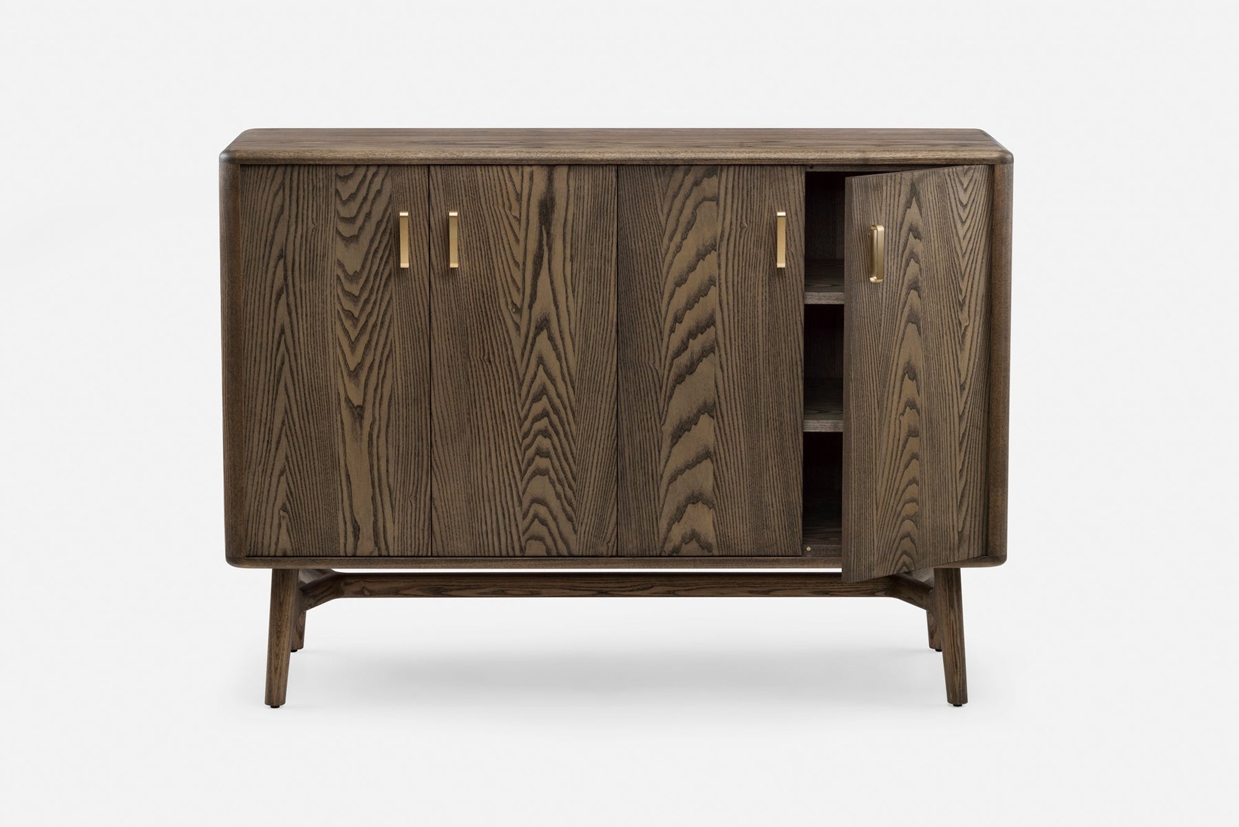 Available in black walnut, white oak, or ash in a range of finishes with brass door pulls. See menus below for further material information.
