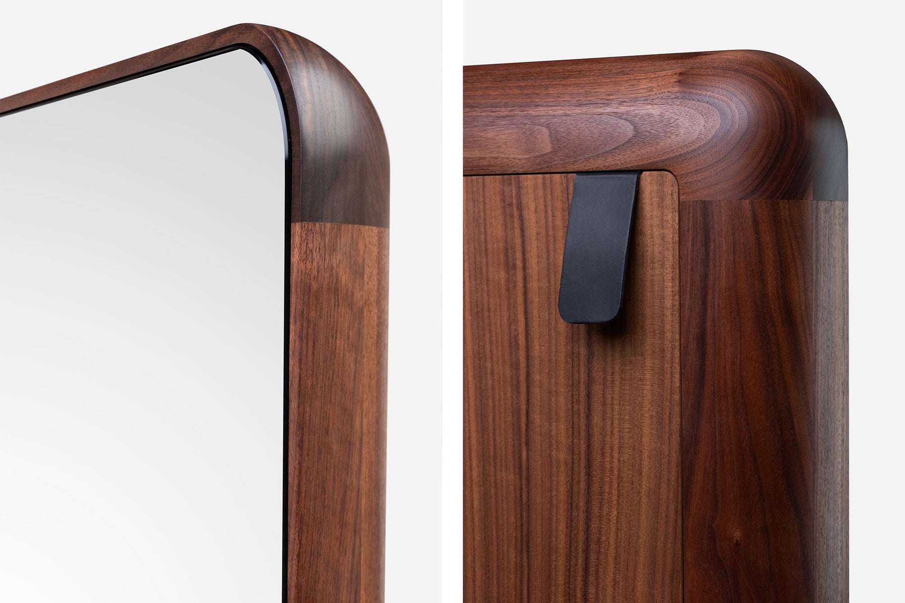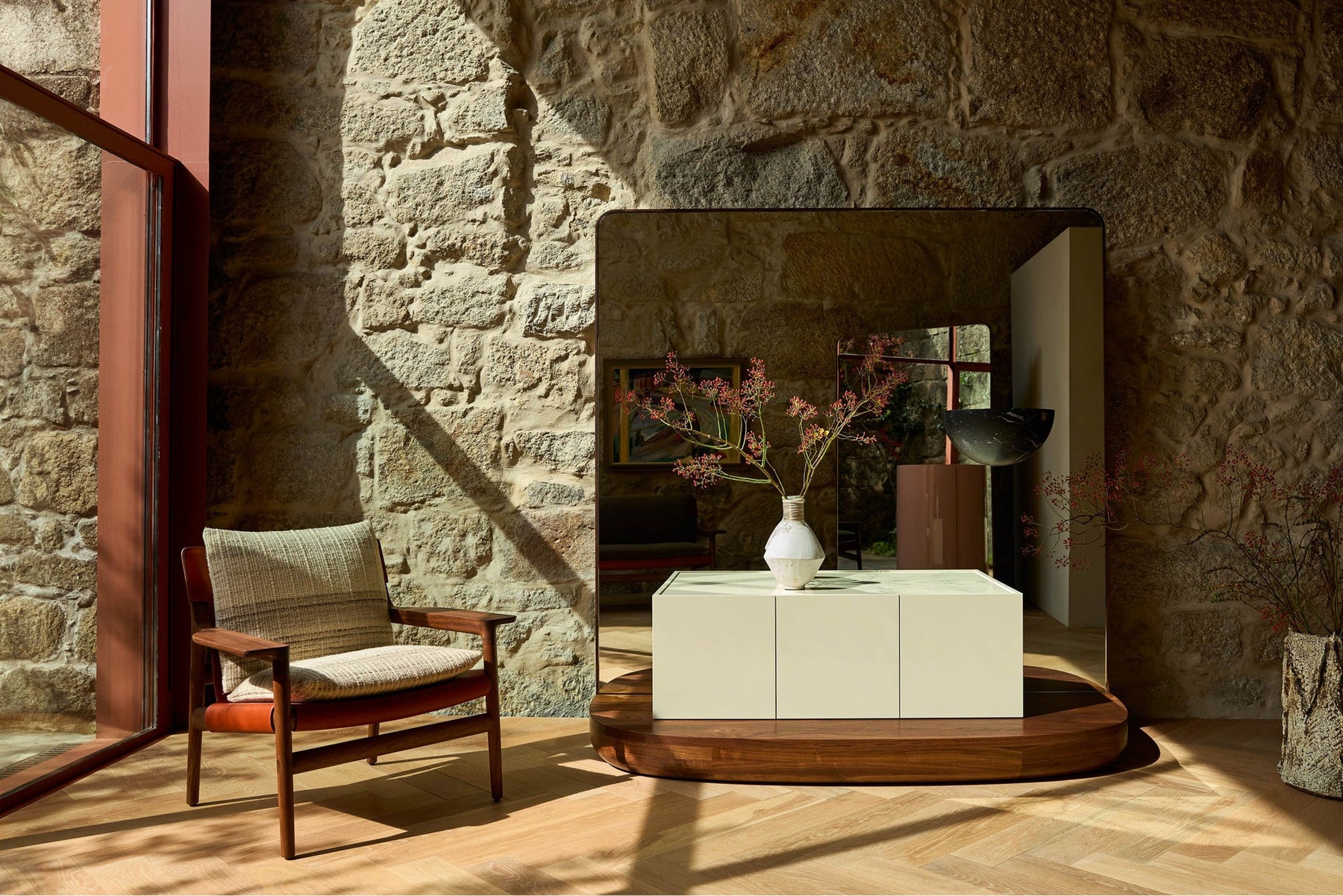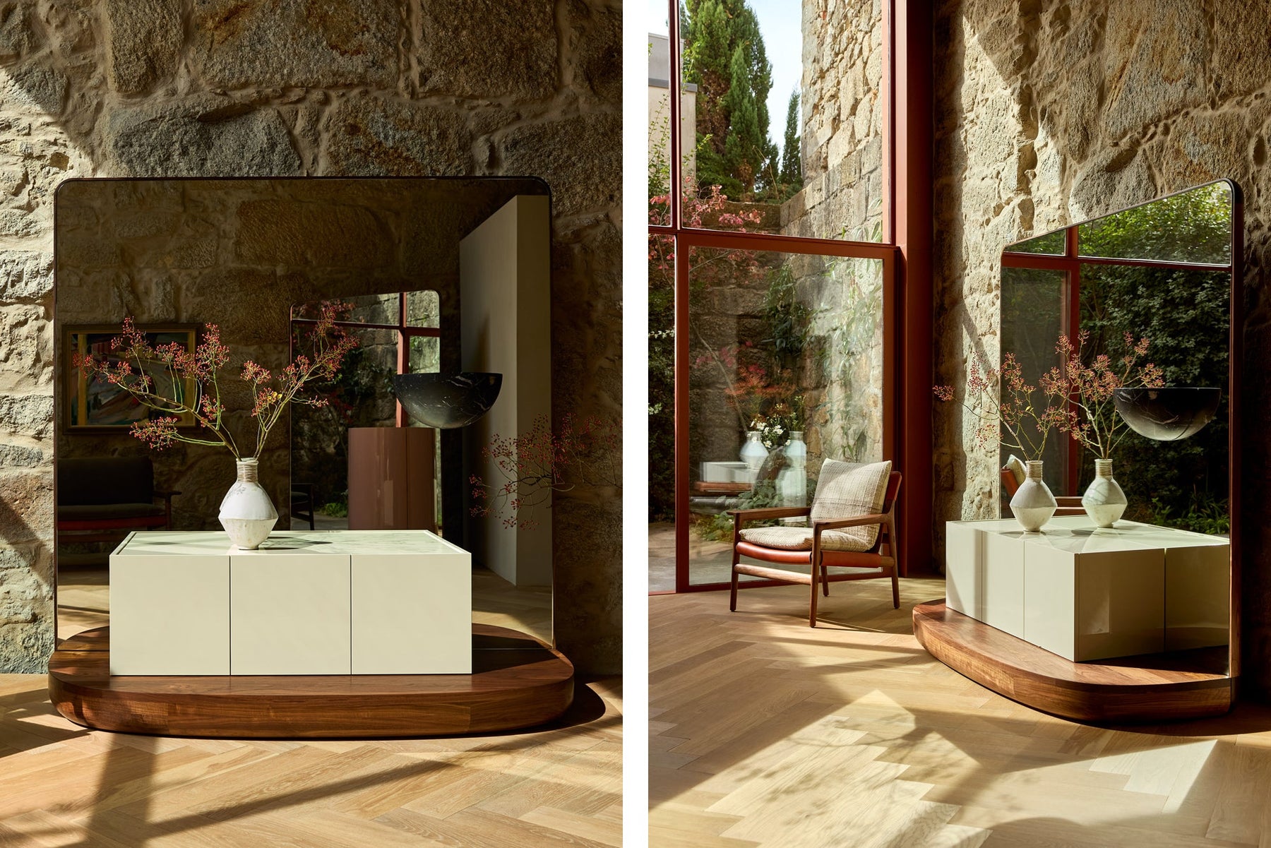 Tai Dan 2 features an expansive mirror that adds dimension to interiors, while its expertly crafted timber frame and base bring grounding and warmth. The integrated cabinet provides practical storage space in a lustrous lacquer body and a floating geometric surface in terrazzo or stone offers a playful and utilitarian accent.