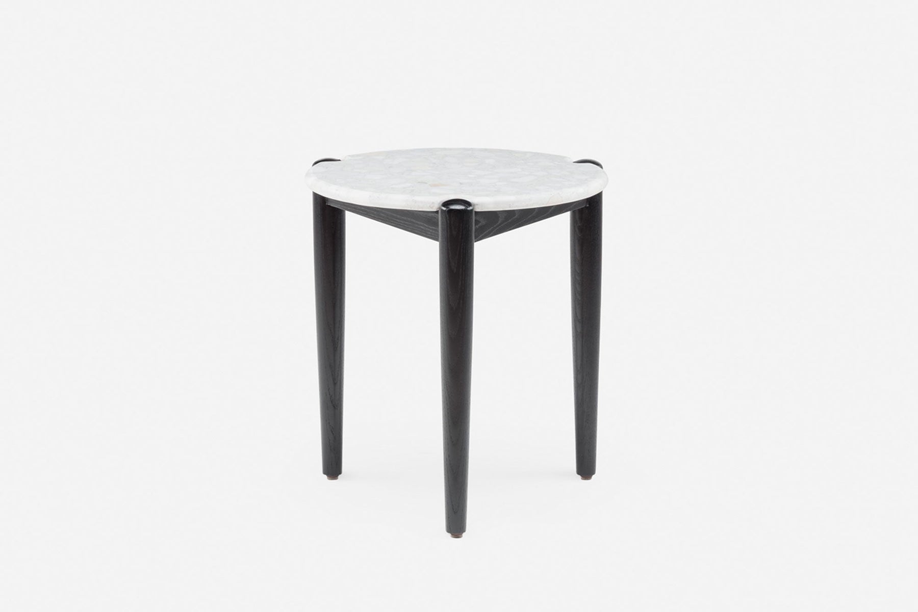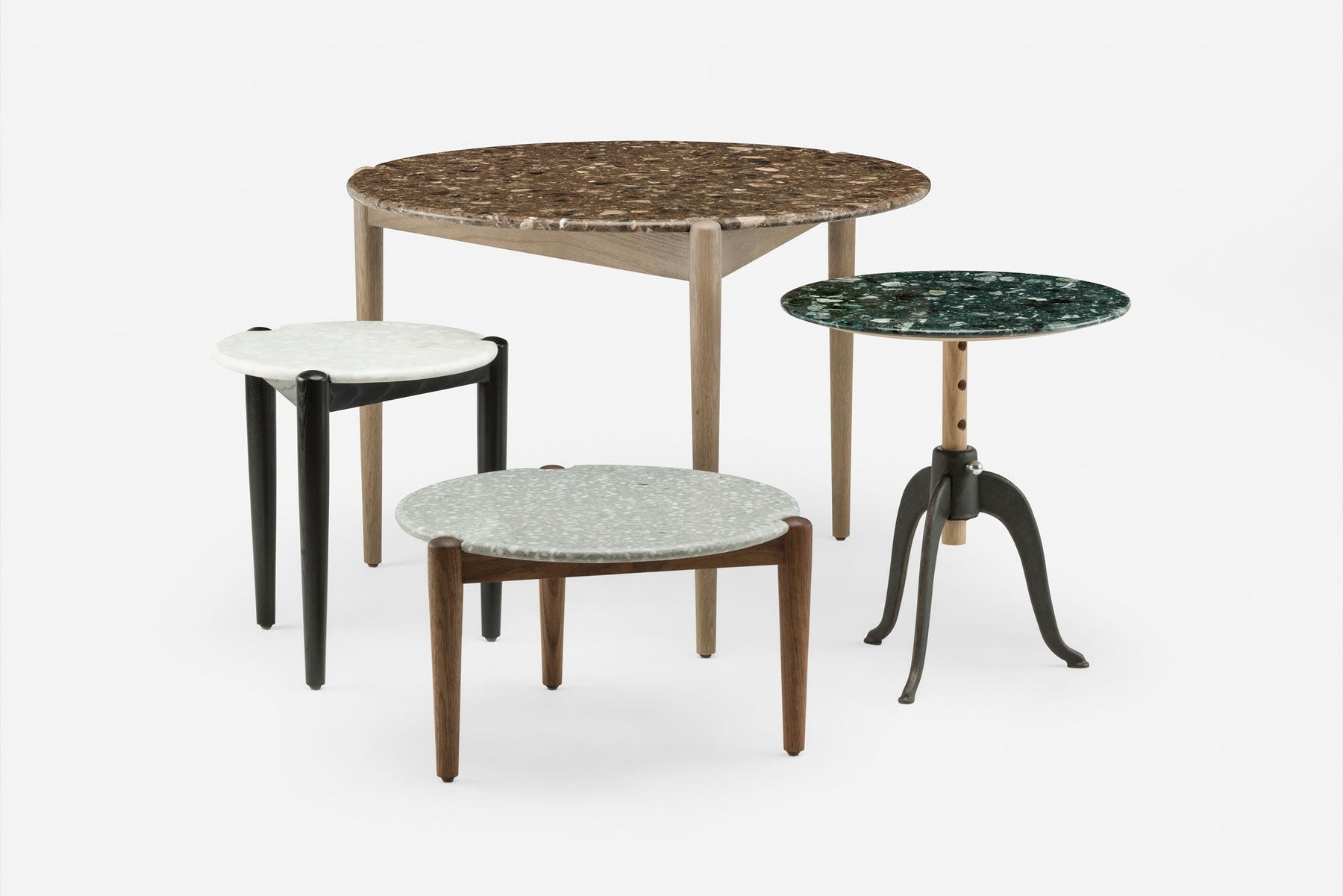 Sidekicks is a series of small occasional tables that live throughout the home to accommodate our different activities. They are the right height and dimension to sit next to sofas and chairs, for drinks and snacks, papers and magazines, or a short time on the laptop. A tabletop of terrazzo rests upon slender solid wood legs.