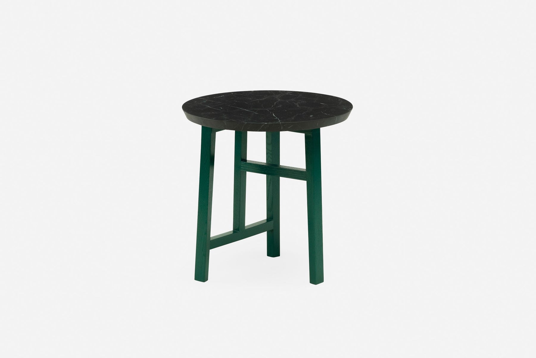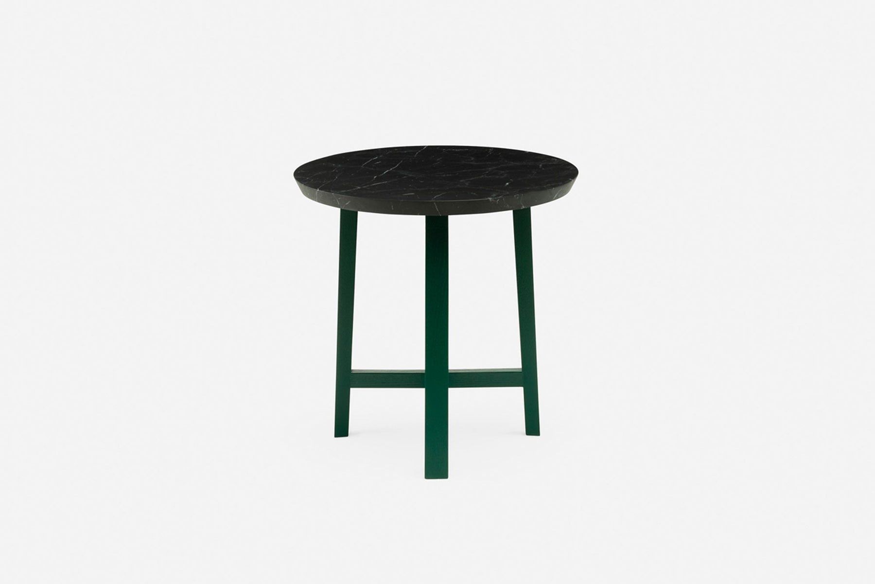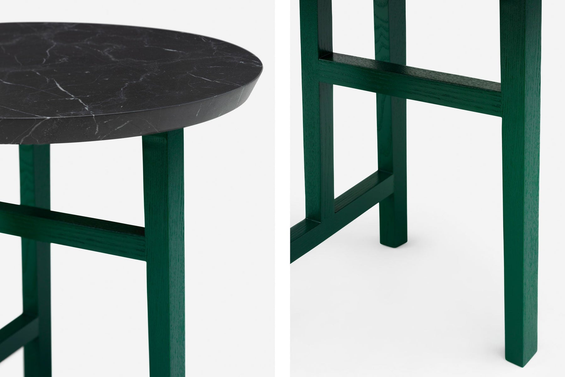 The Trio series is a tectonic exploration where the composition of the table legs is the design focal point. The tables stand on three legs, with each leg attached to another leg with an intermediate horizontal substructure. The tables express a purity of form and material, with the unexpected design focus under the table, where an intricately composed lattice work brings a hidden elegance to the otherwise simple and unassuming table ensemble.